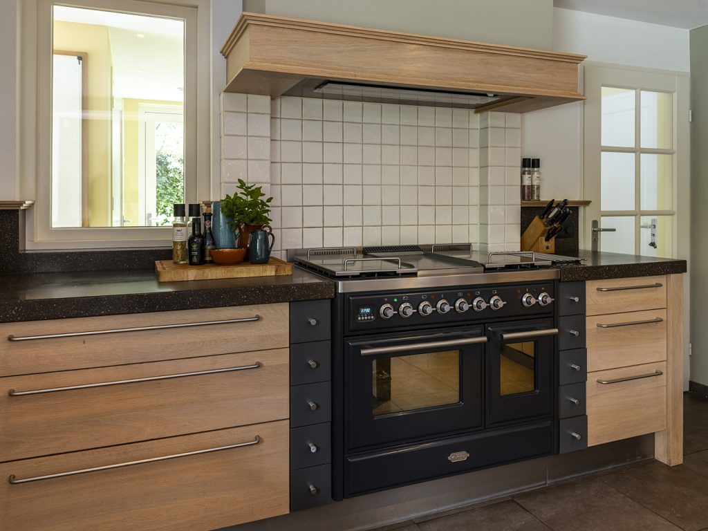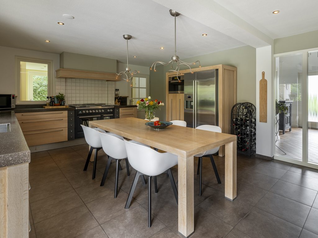Eten kan niet alleen in de woonkamer, maar ook in de ruime keuken. Met een hapje en een drankje loop je zo naar het overdekte terras, dat grenst aan de keuken. Het keukenblok heeft een opstelling in L-vorm met een extra kastenwand. Dit geheel biedt veel werk- en bergruimte en alle benodigde apparatuur van topkwaliteit staat tot je beschikking. Blikvangers zijn het grote fornuis met dubbele oven en de dubbeldeurs koel-/vriescombinatie met waterpunt.