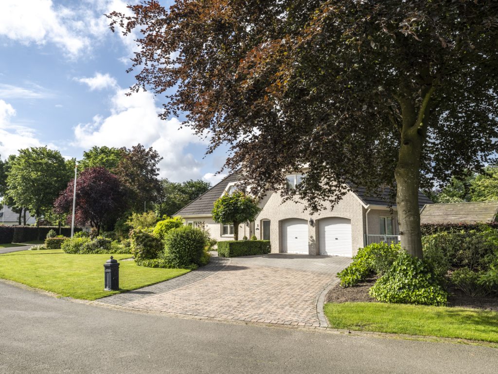 De prachtige villa en voortuin, waar de vlag regelmatig in de wind wappert, maakt indruk. Dit is een fantastische plek om comfortabel te wonen, omringd door groen. Loop naar de entree, links van de dubbele garage, waar twee fraaie voordeuren toegang geven tot de hal, voorzien van mozaïek inleg, met vide en prachtige houten vloer. Aan de linkerzijde zie je een op maat gemaakt kastenwand met garderobe en meterkast, terwijl het gastentoilet met fonteintje zich aan de rechterzijde bevindt.
