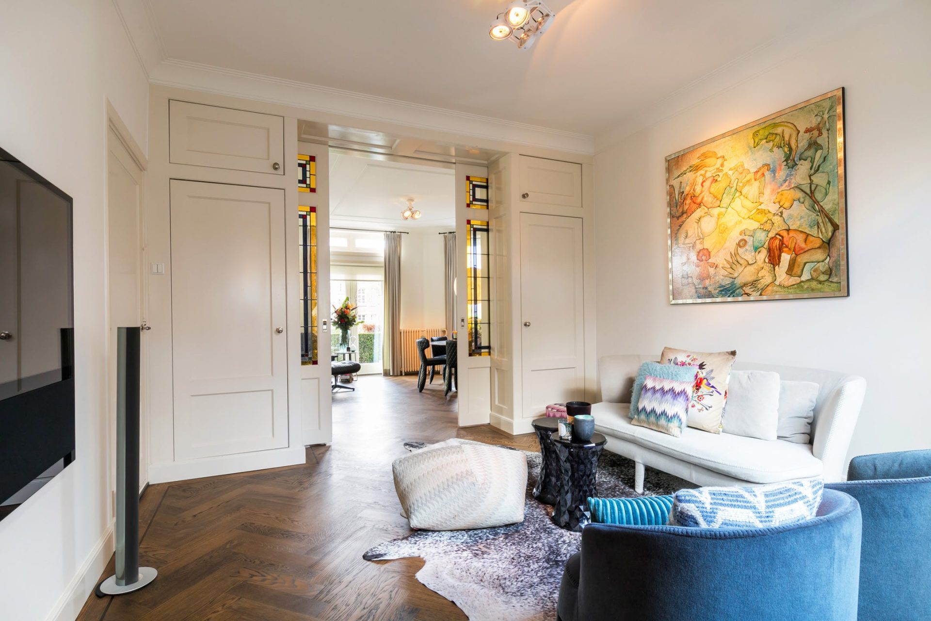 In de hal zijn twee deuren die naar de woonkamer en-suite leiden. De speels vormgegeven kamer aan de voorzijde, ingericht als eet- en tv-kamer, is meer dan 10 meter breed en biedt prachtig uitzicht naar de voortuin, over de Elzentlaan. Bij het zitgedeelte zie je een marmeren schouw met open haard en de originele plafonds zijn zorgvuldig gerestaureerd. Achter de en-suite deuren met glas-in-loodramen is een tweede zitkamer met mooi uitzicht naar de patio.