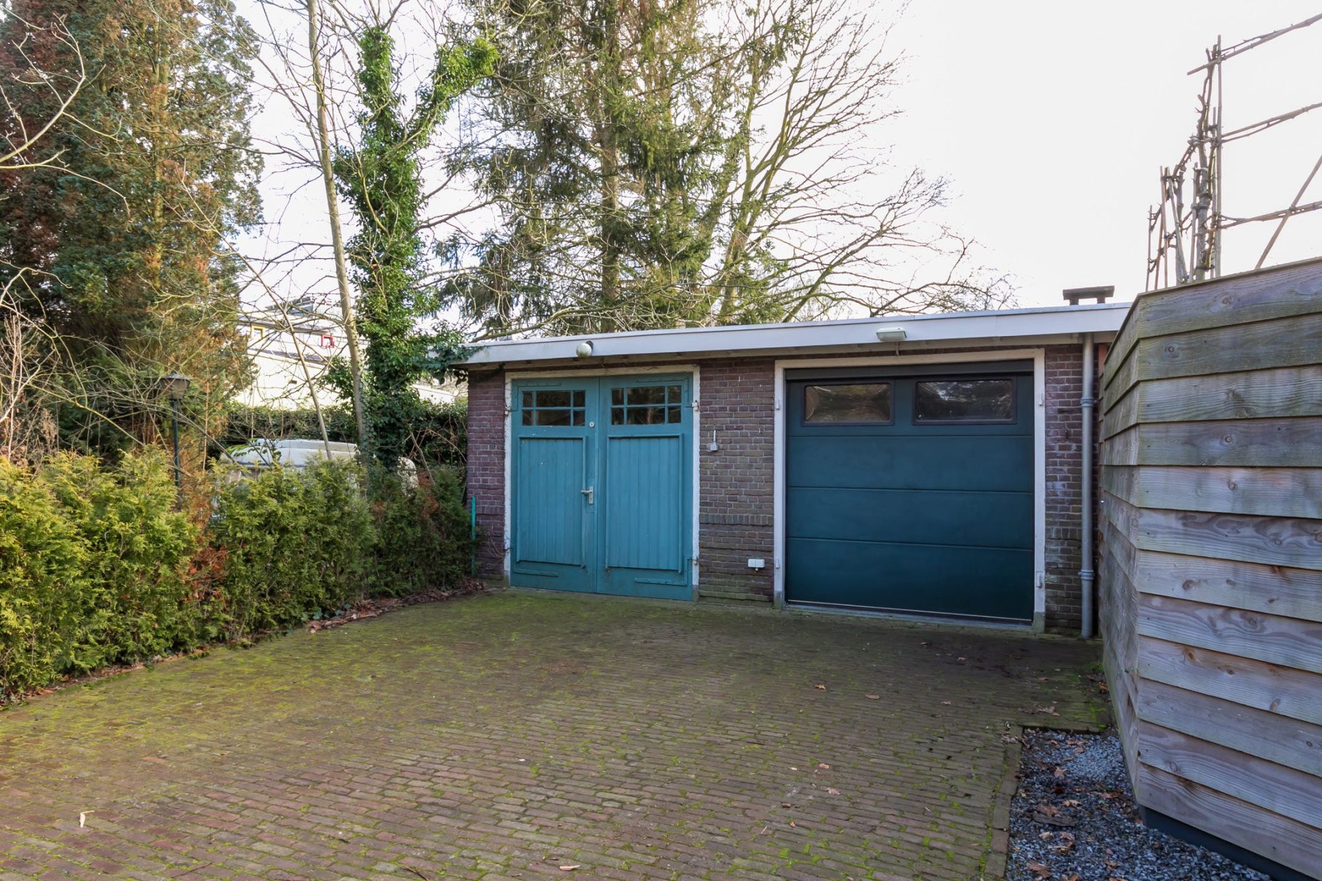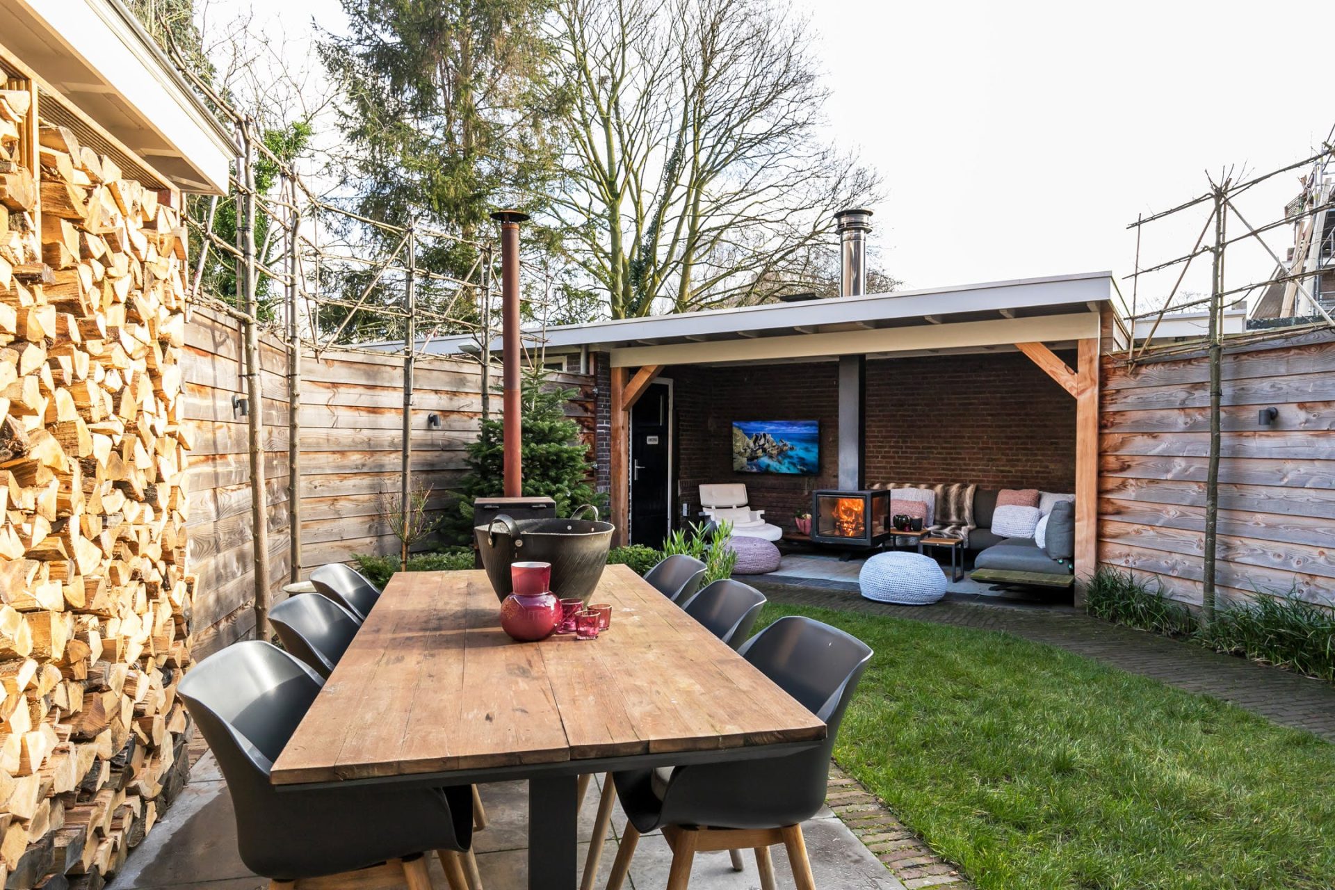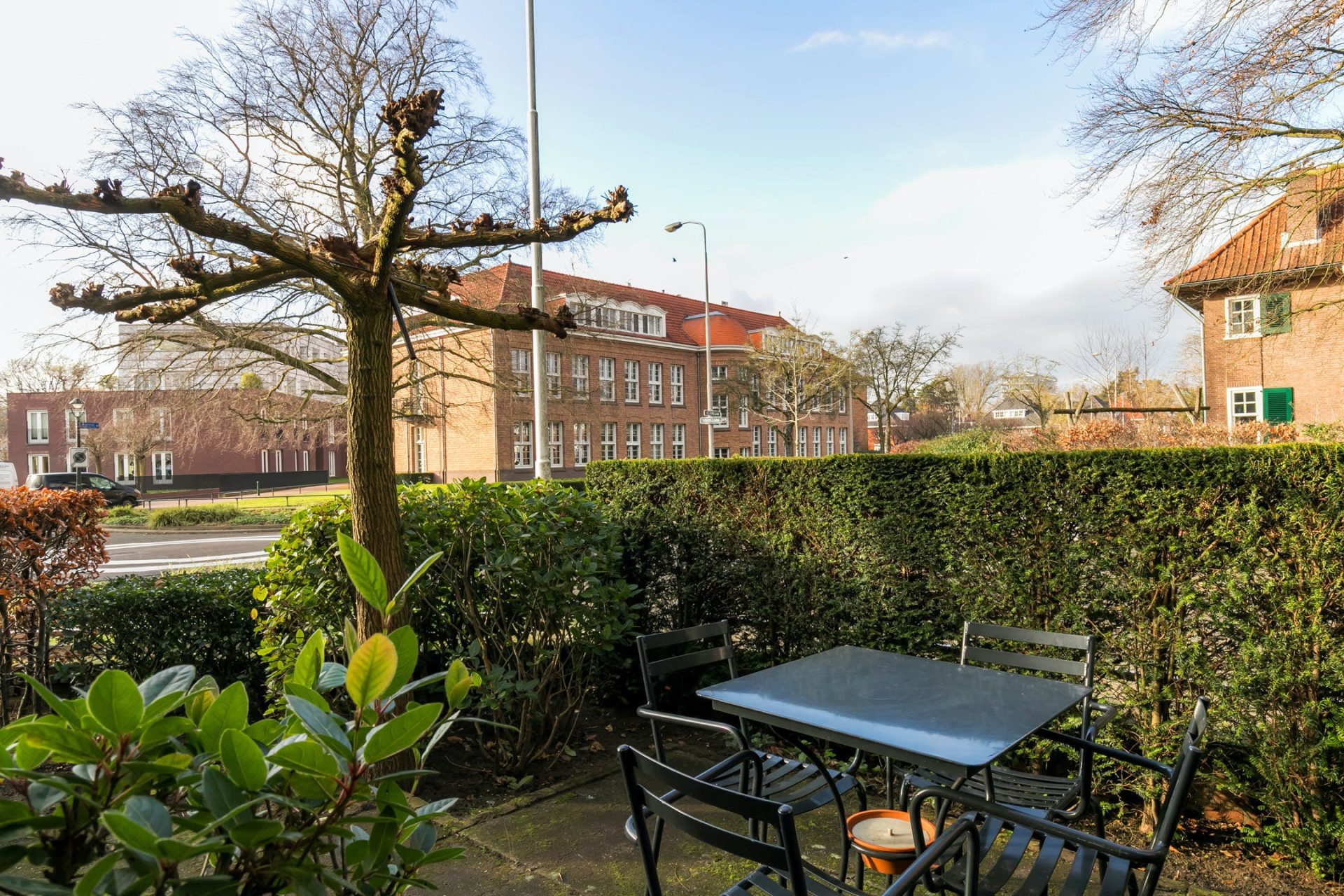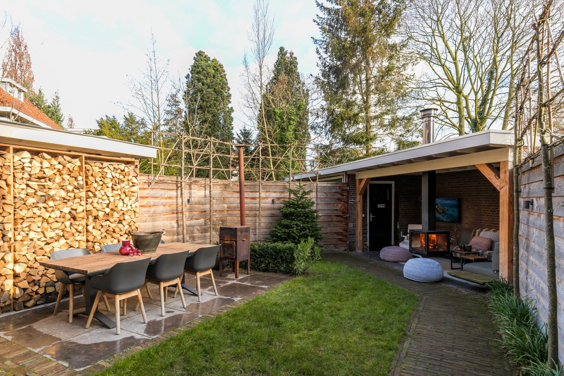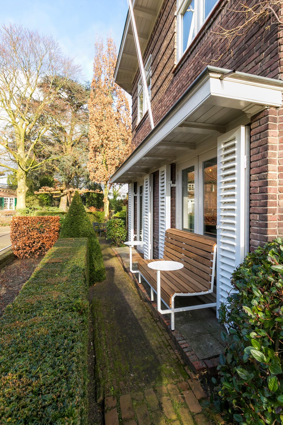 Vanuit de eetkamer heb je toegang tot een beschutte, koele patio en in de keuken zijn openslaande deuren naar de achtertuin. Dit is een heerlijke plek om buiten te zitten op het terras of onder het overdekte terras met buitenhaard. De deur onder de overkapping leidt naar de garage waar ruimte is voor de fietsen, scooter en andere spullen. Via een pad kun je vanuit de garage met een motorvoertuig, fiets en lopend naar de Vondellaan. De oprit heeft een recht van overpad.