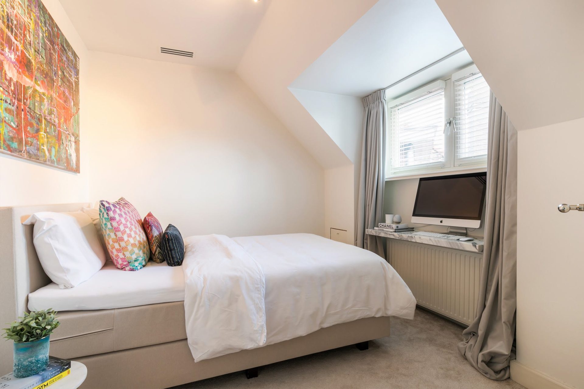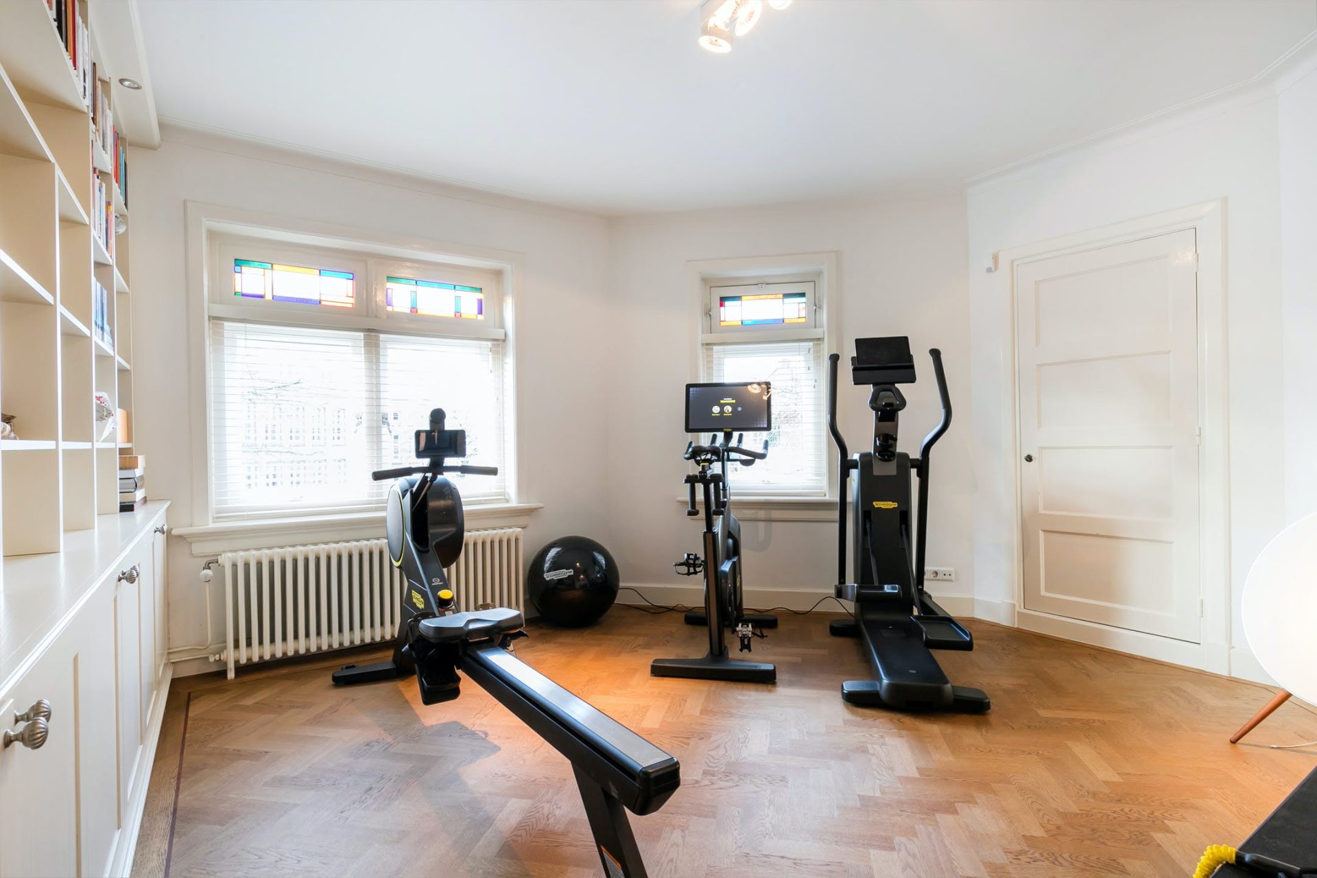 De kamer aan de linker voorzijde is ingericht als sportruimte en de naastgelegen masterbedroom heeft een eigen kastenkamer met hoogwaardige, op maat gemaakte garderobekasten.