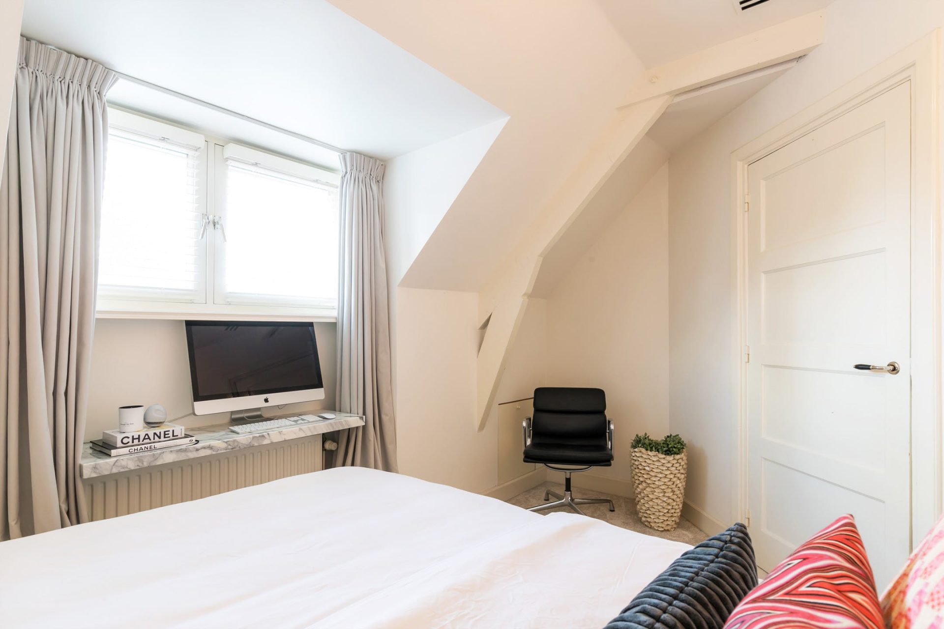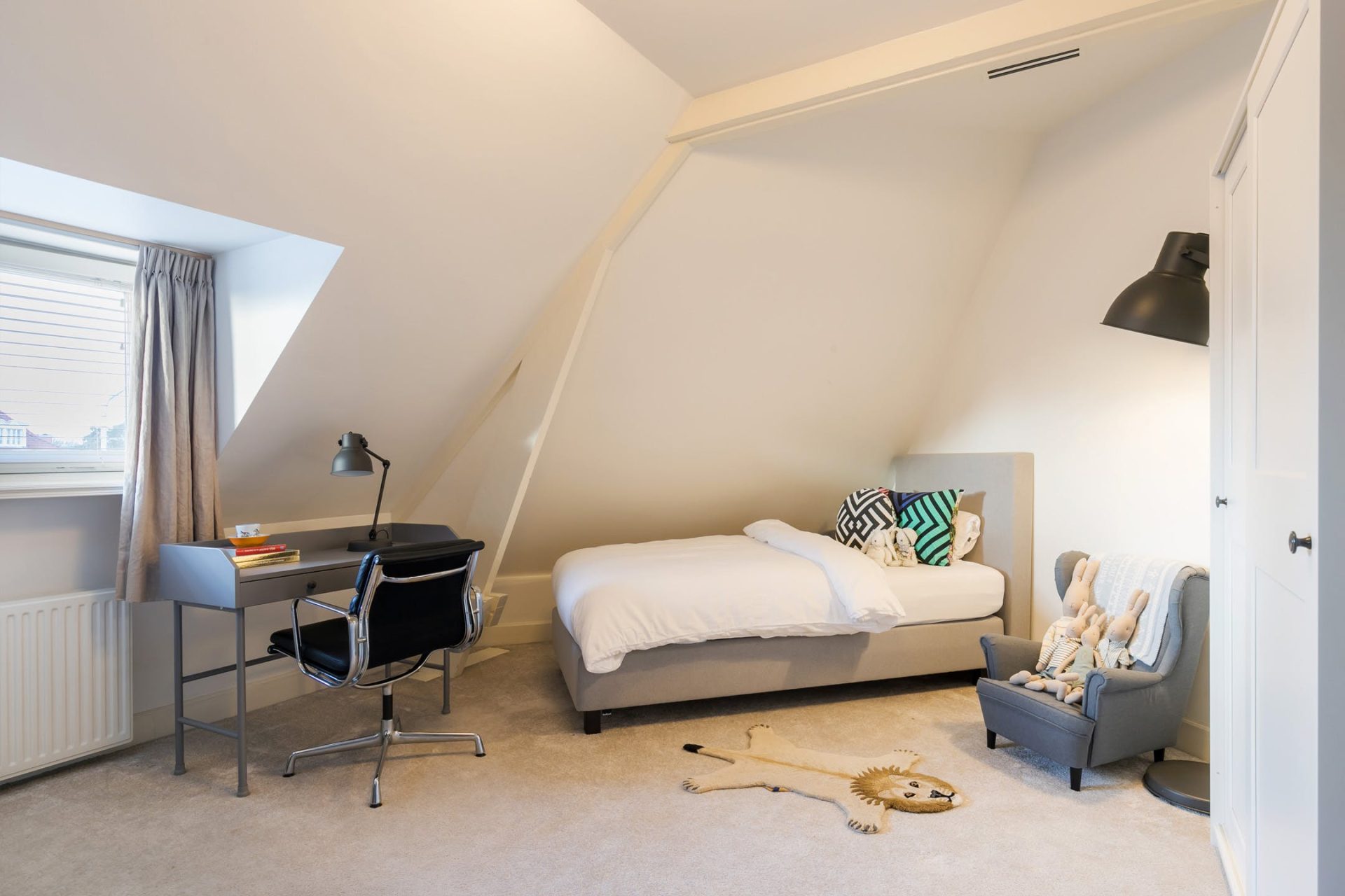 Iedere kamer heeft een speels schuin dak met een dakkapel en een fraaie afwerking. De twee grootste kamers zijn ingericht als kinderkamer en de derde kamer is een tweepersoons logeerkamer. In een van de kamers is een luik met vlizotrap naar de bergzolder.