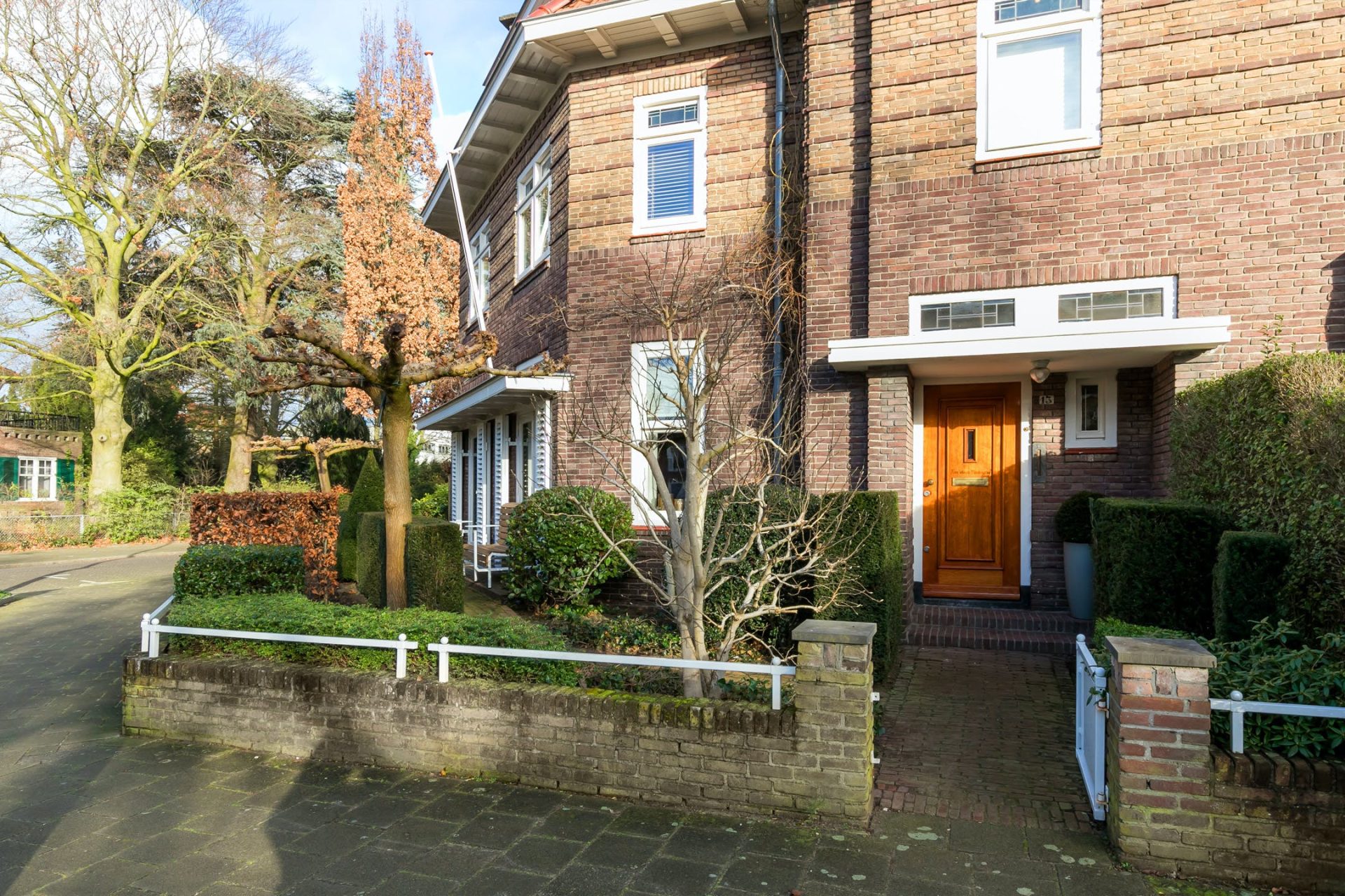 Aan de voorzijde is een zeer brede, symmetrisch aangelegde voortuin met diverse beplanting. Deze tuin versterkt de statige, stijlvolle architectuur van dit fantastisch gezinshuis in de Den Elzent.