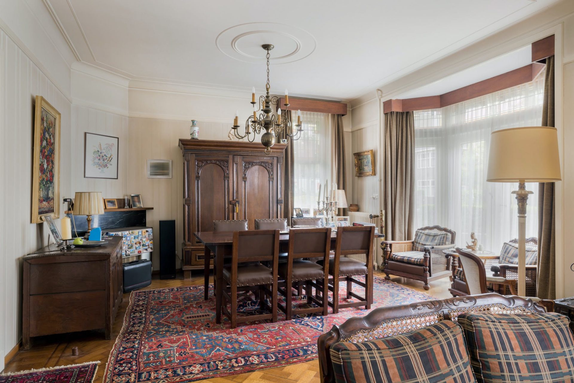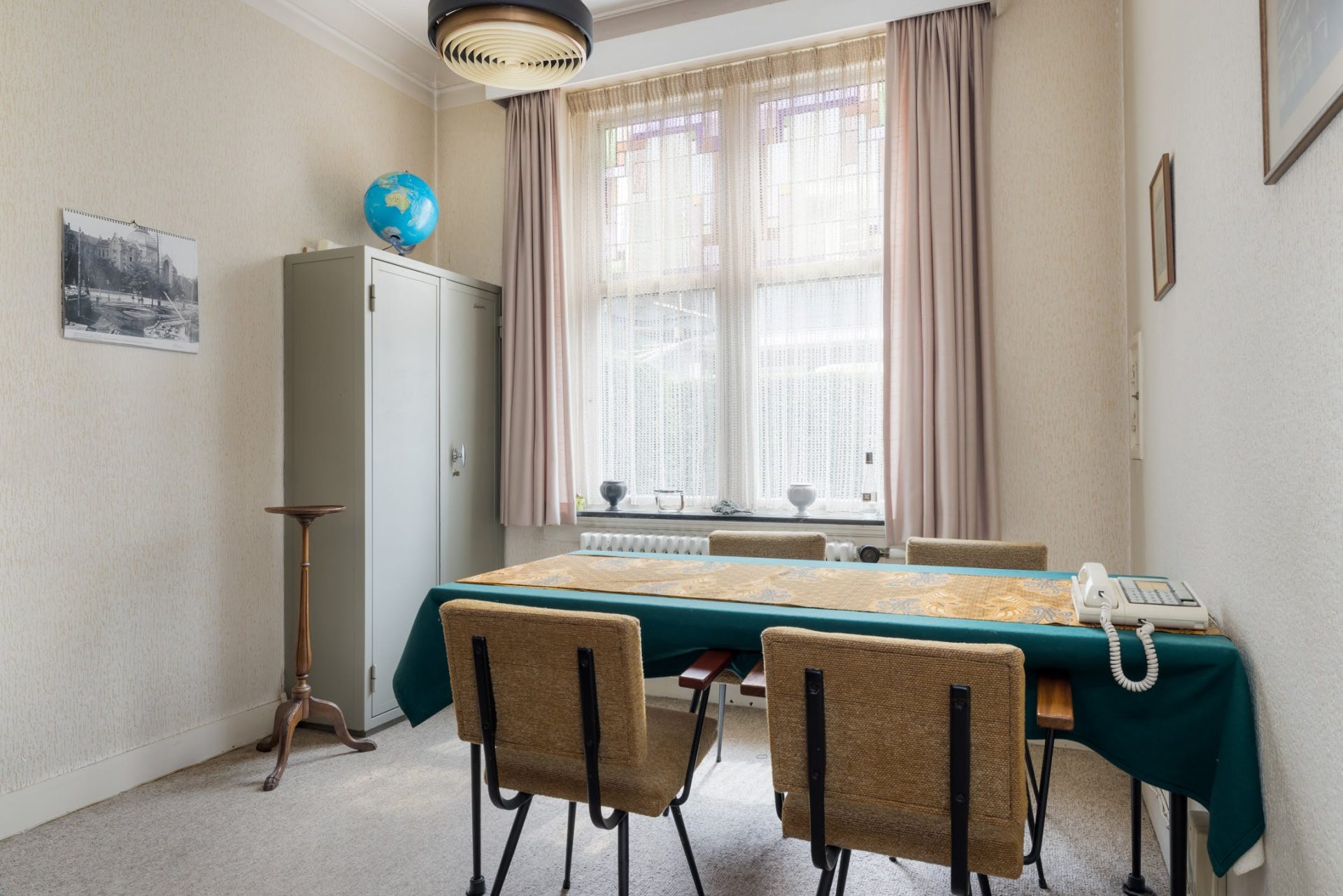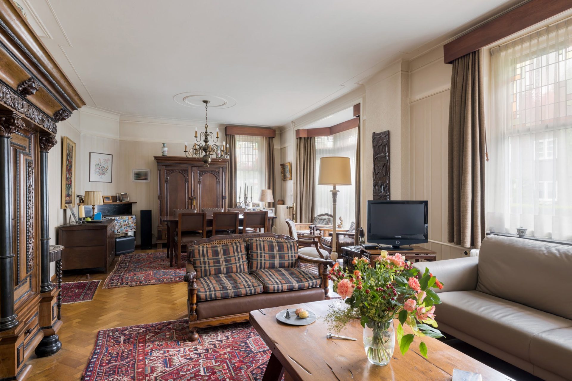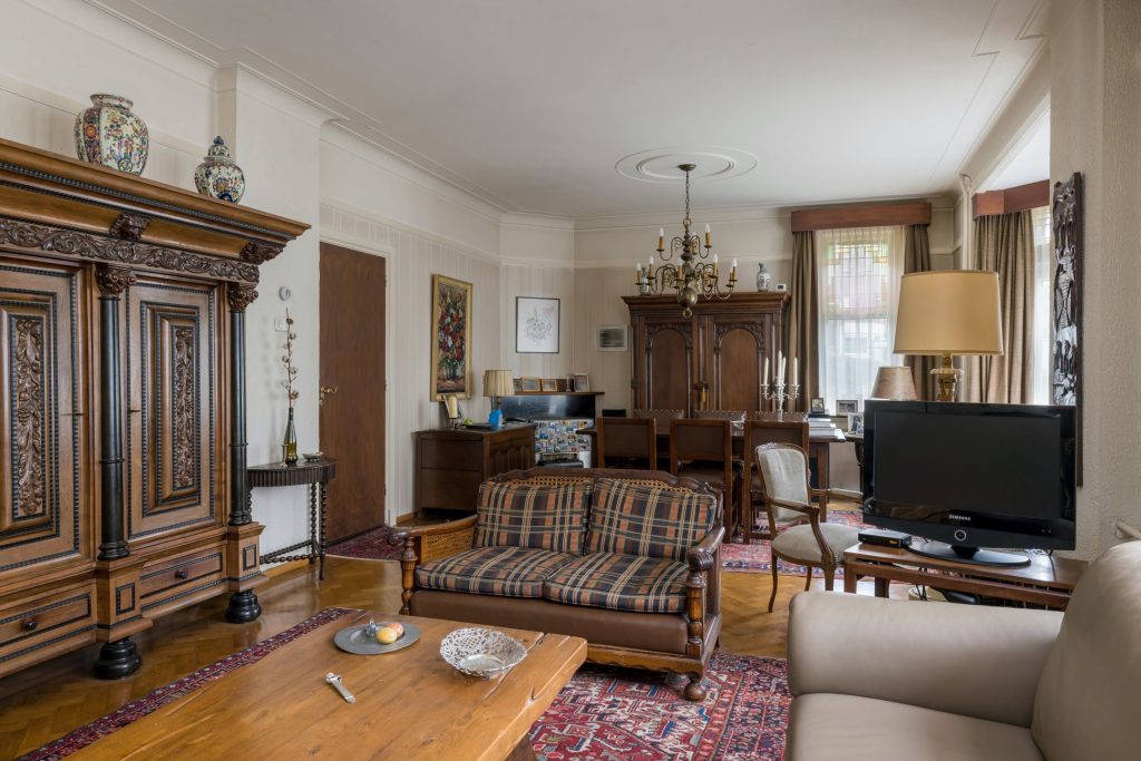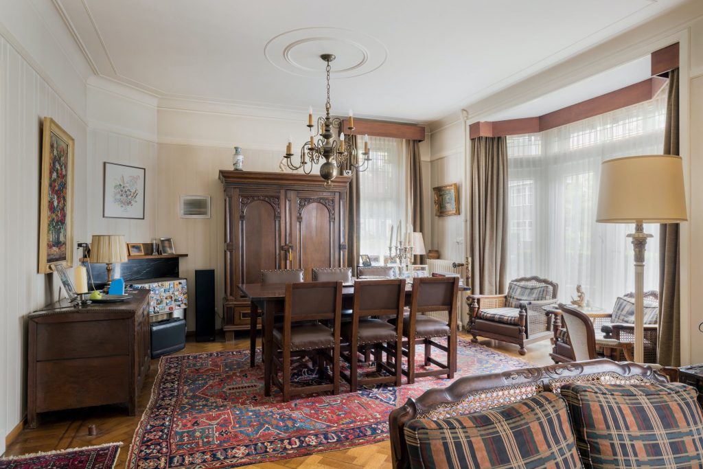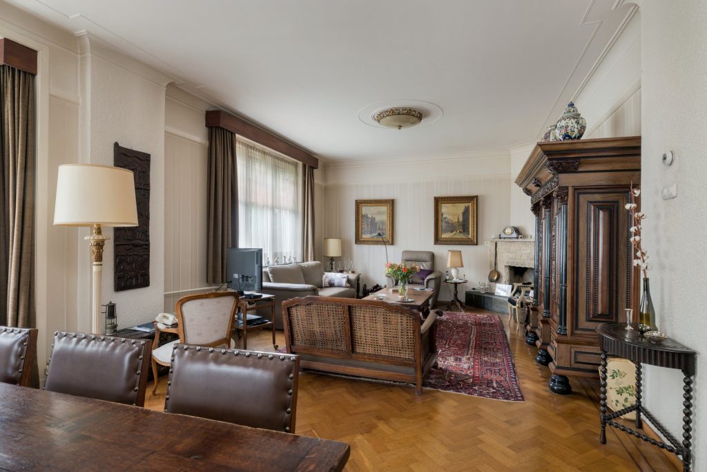 Over de hele breedte van de villa is de sfeervolle woonkamer met erker gesitueerd. Door de grote ramen aan de zuidwestkant valt veel licht naar binnen en het gestucte plafond met subtiele sierlijsten past perfect bij de visgraat parketvloer. Aan de achterzijde vindt u de keuken, bijkeuken en toiletruimte. De keuken heeft een fraaie vormgeving, een deur naar de tuin en een directe verbinding met de bijkeuken. Naast de entree is de lichte werkkamer die zeer geschikt is als kantoor of praktijk aan huis.