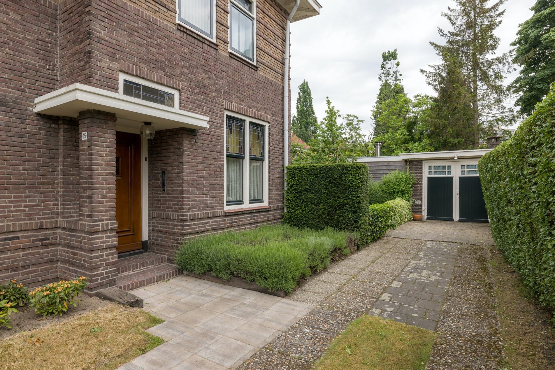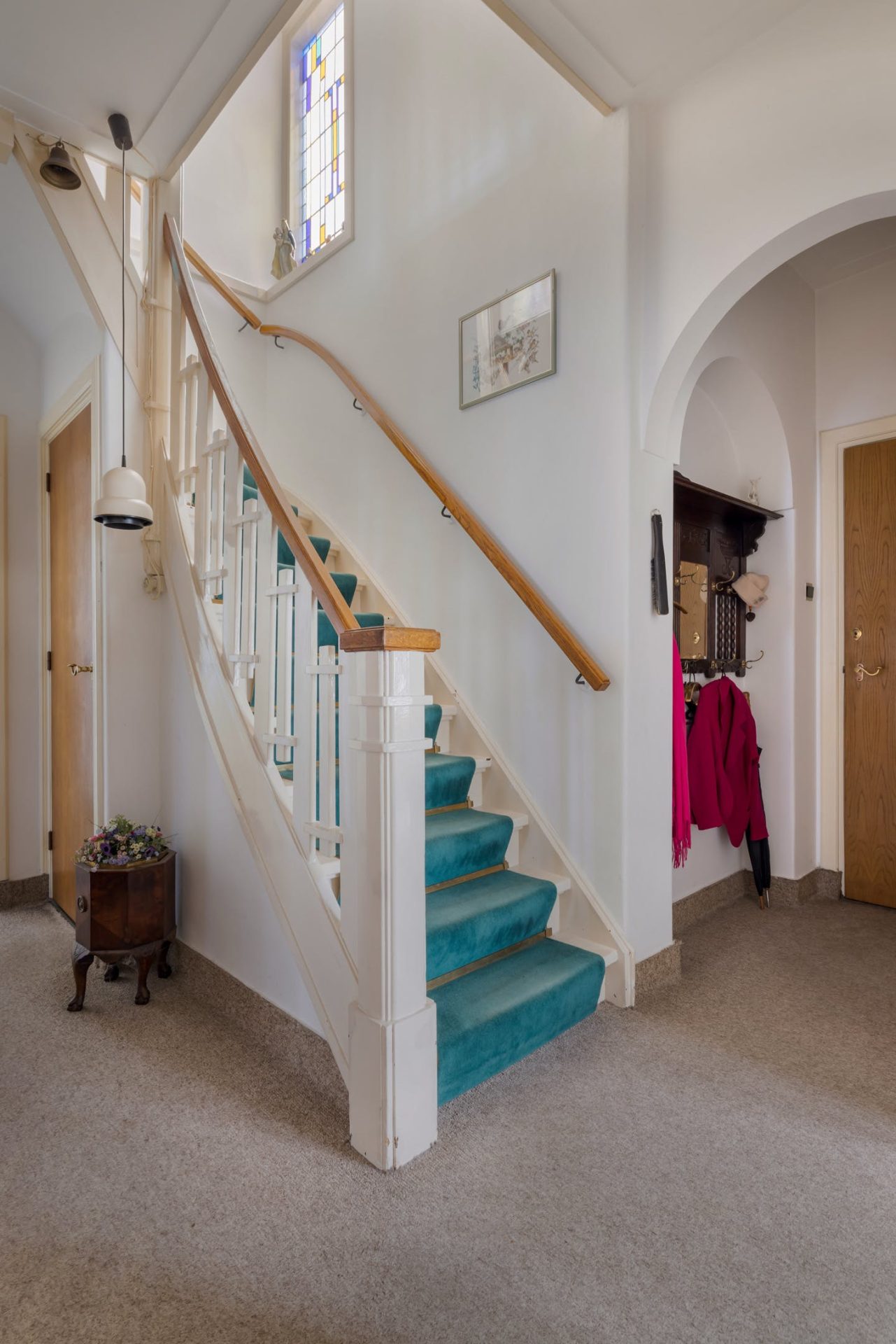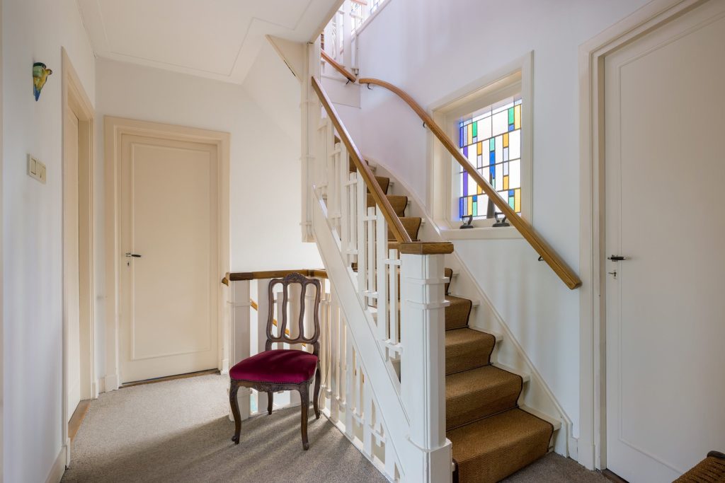 Vanaf de oprit loopt u naar de overdekte entree aan de rechterzijde. De vestibule met glas-in-loodraam staat in verbinding met de hal, waar u een fraaie trap met glas-in-loodraam, hoog plafond en de originele deurlijsten ziet.