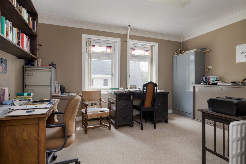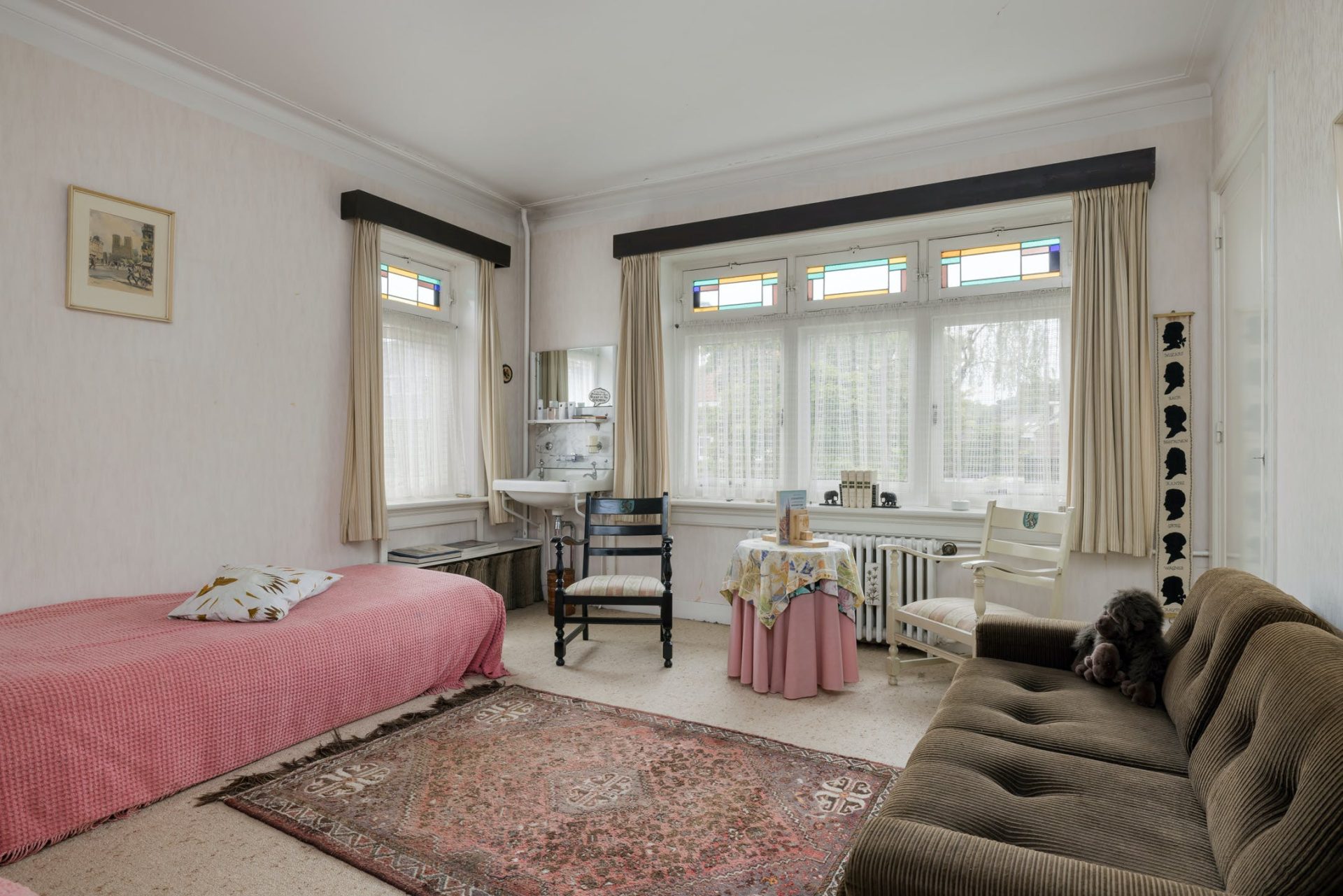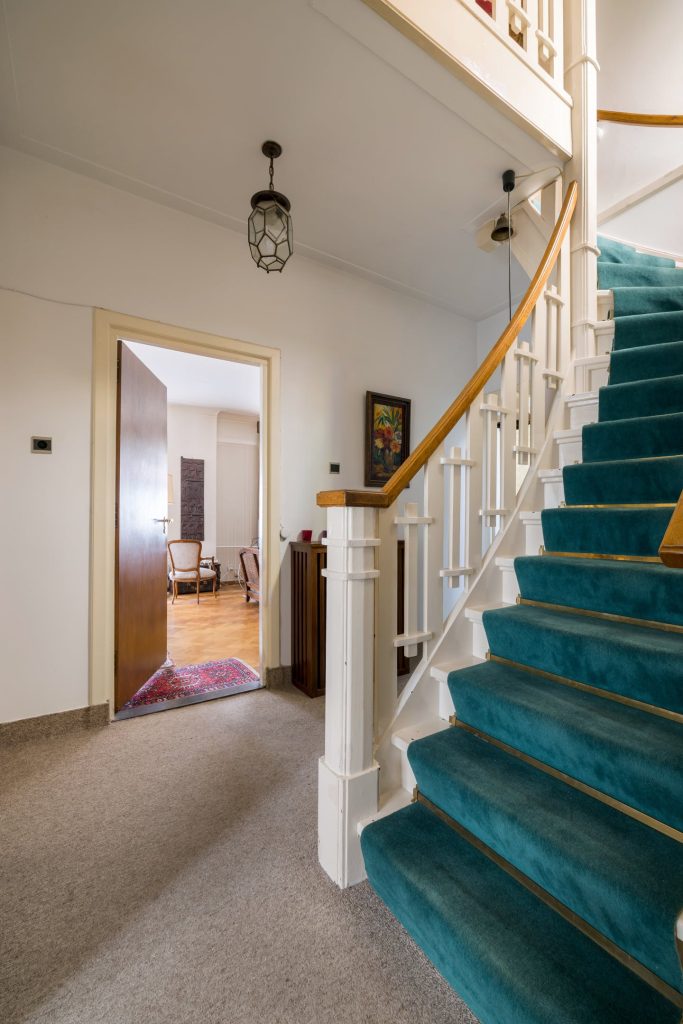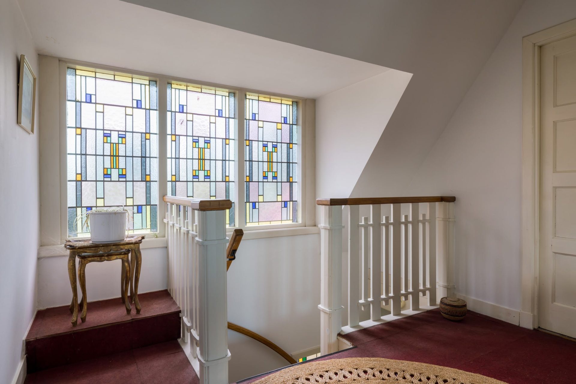 Op de tweede verdieping zorgt een dakkapel met drie kleurrijke glas-in-loodramen voor een overloop met fraai lichtinval. Achter de originele paneeldeuren zijn nog twee slaapkamers en een wasruimte gesitueerd. Zo heeft deze stadsvilla maar liefst vijf slaapkamers en heeft u ruimte om een tweede badkamer te realiseren.