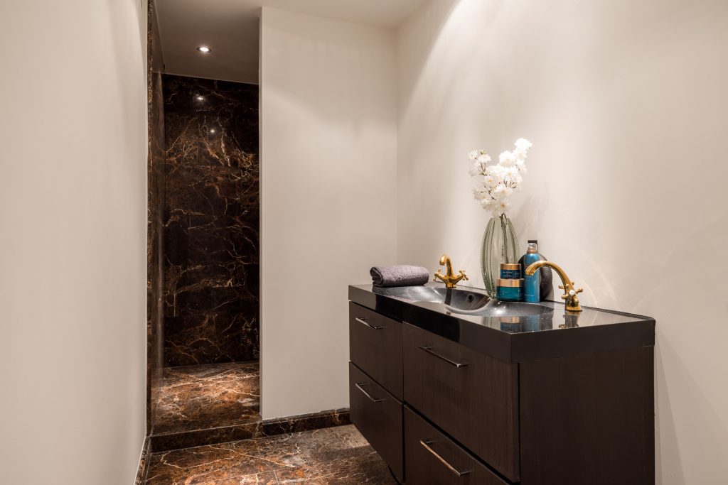 De hal is het toonbeeld van luxe en stijl, met een prachtige marmeren vloer voorzien van vloerverwarming en -koeling. Aan de linkerzijde zijn twee inpandige bergingen en een derde berging annex wasruimte bevindt zich in het tweede deel van de hal.