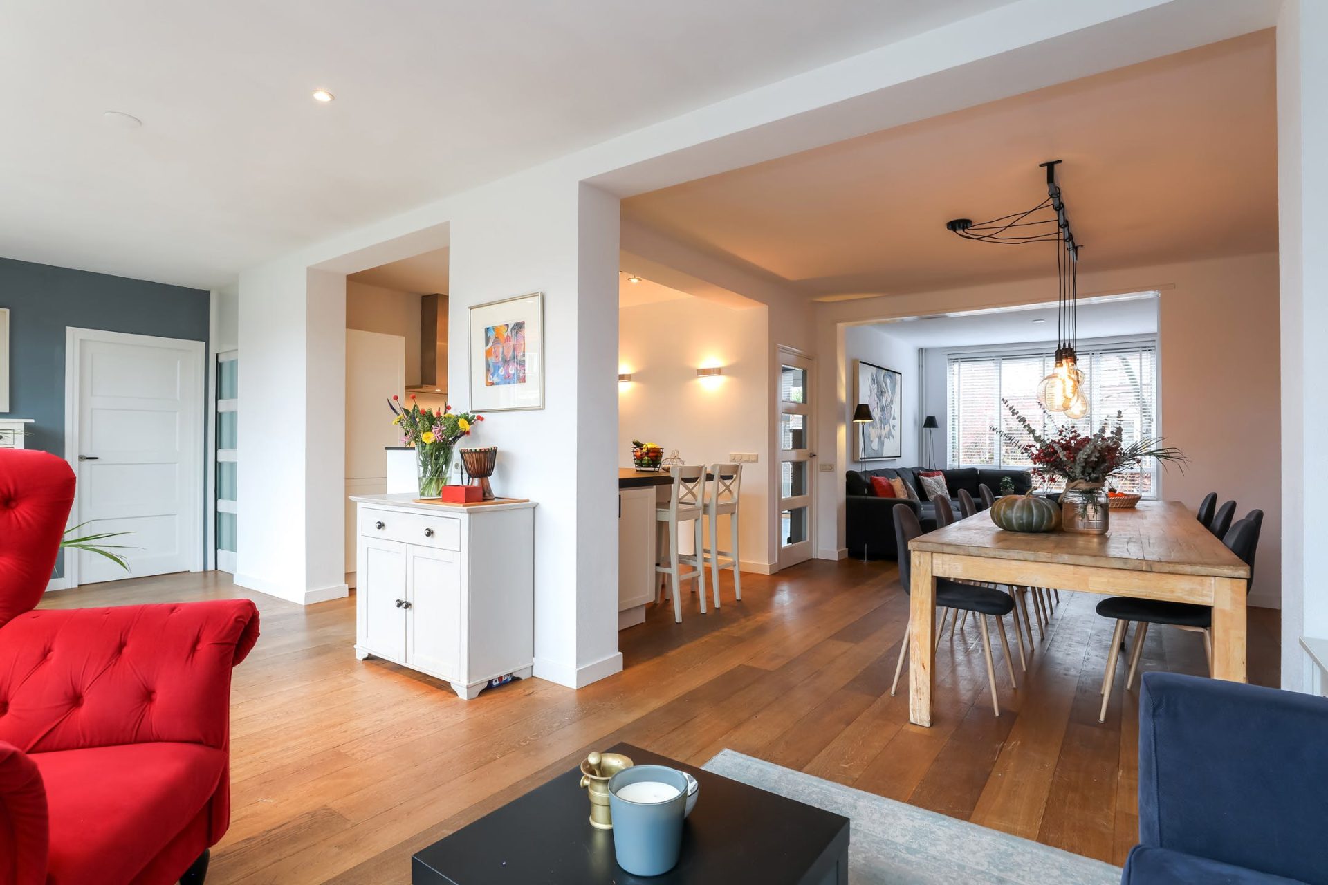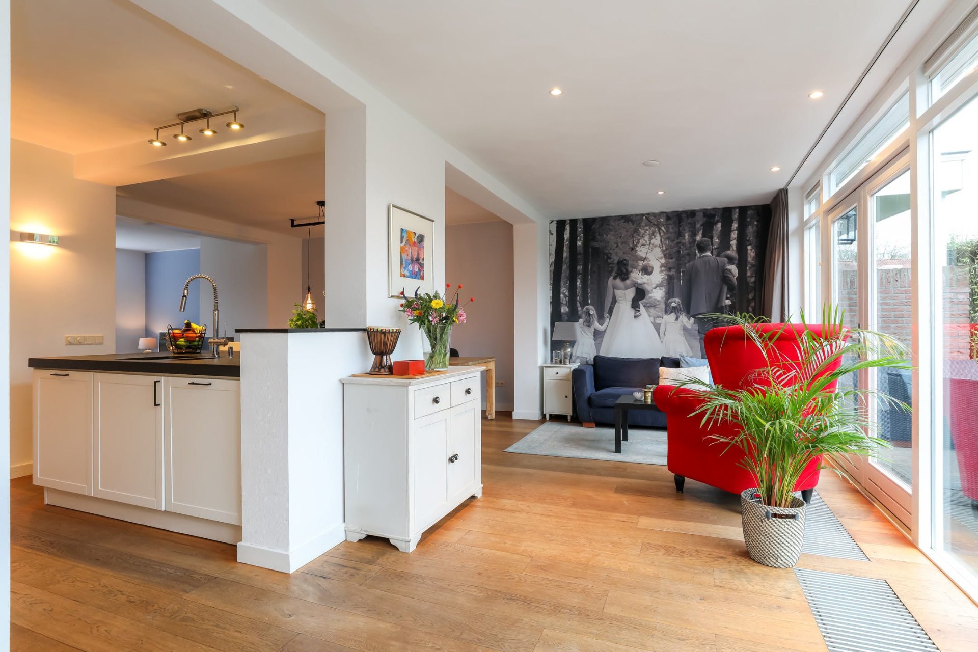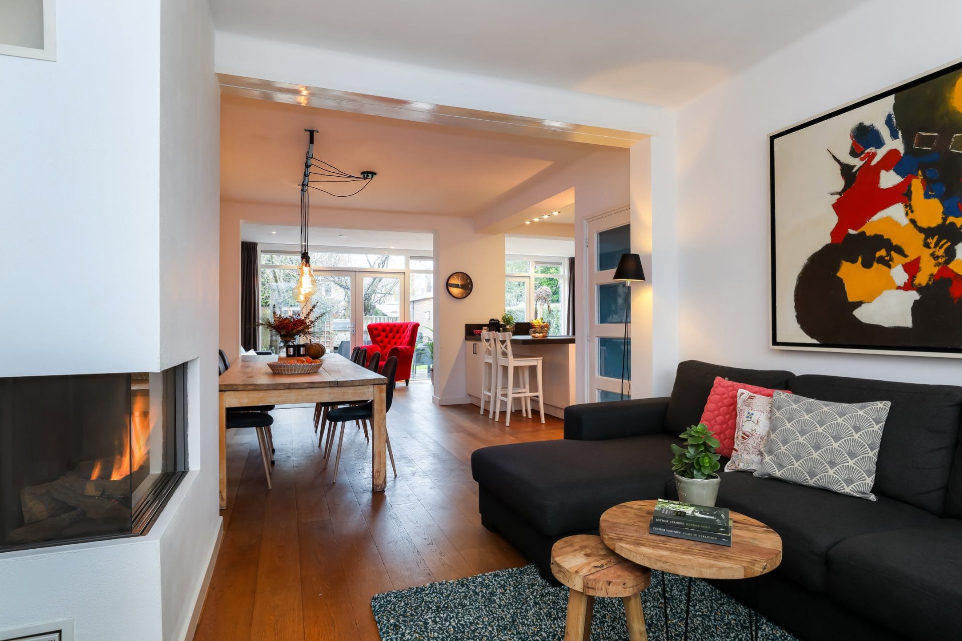 Verrassend ruim opgezette leefruimte met mooie houten vloer, met aan de voorzijde een zithoek v.v. gashaard.