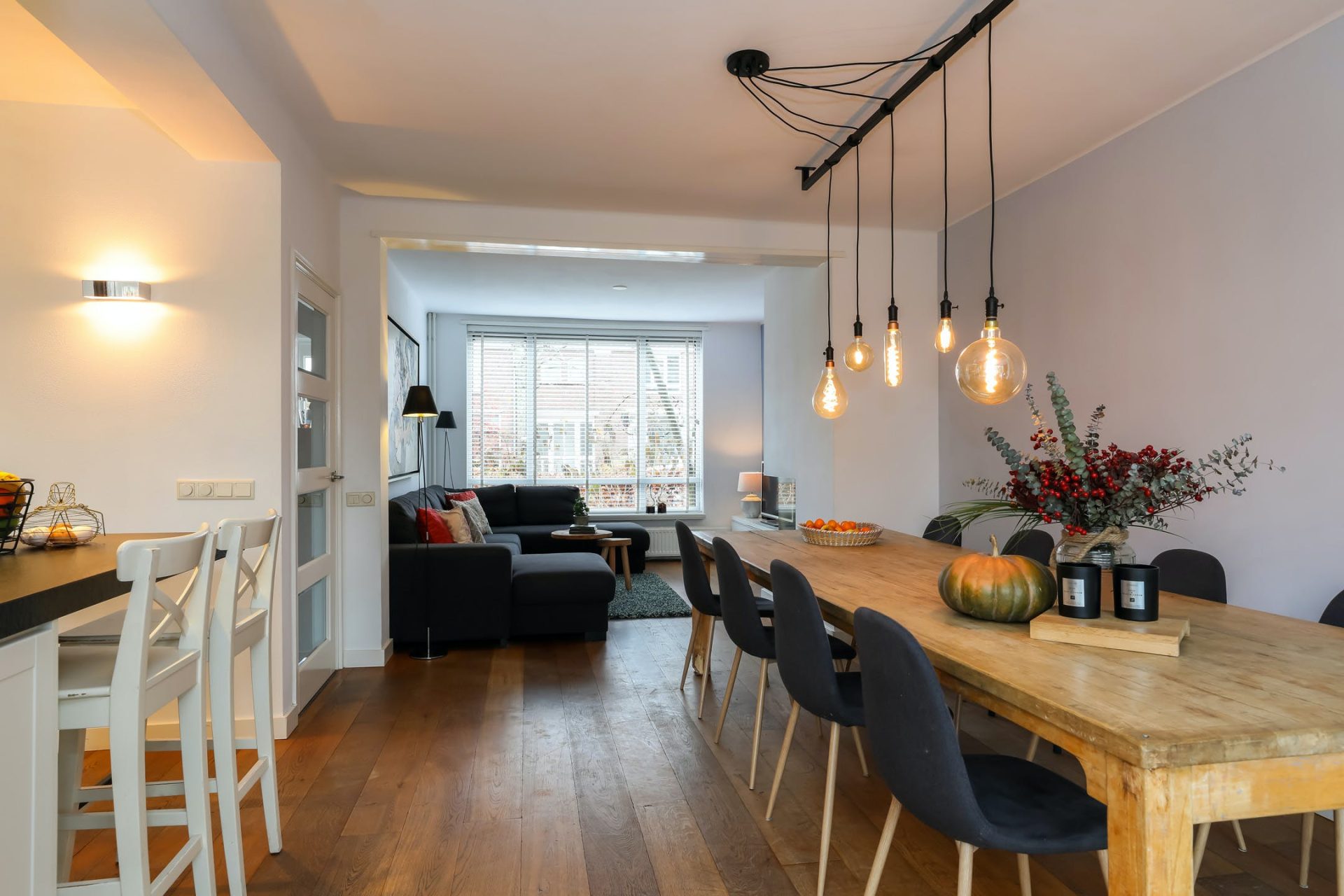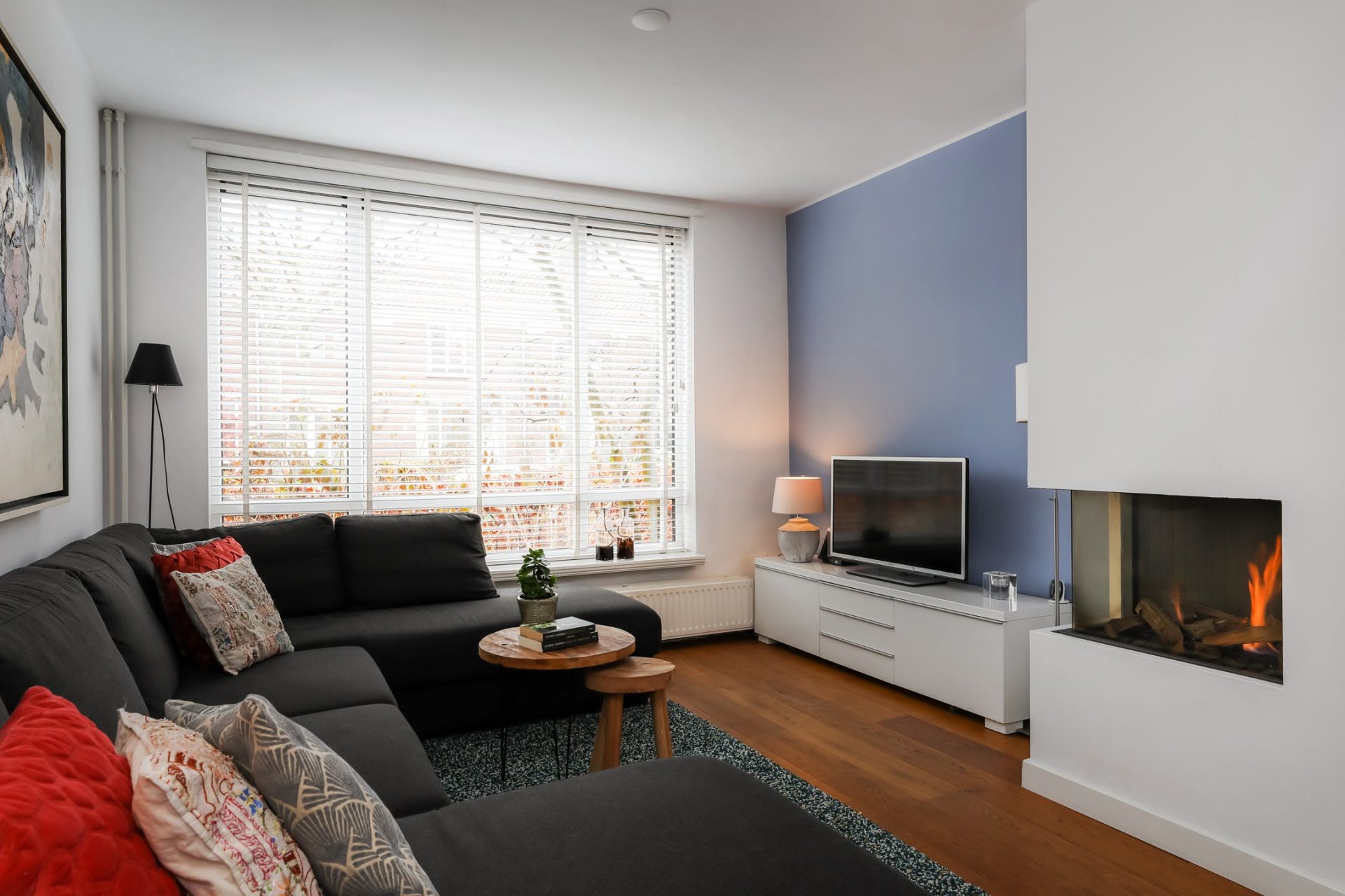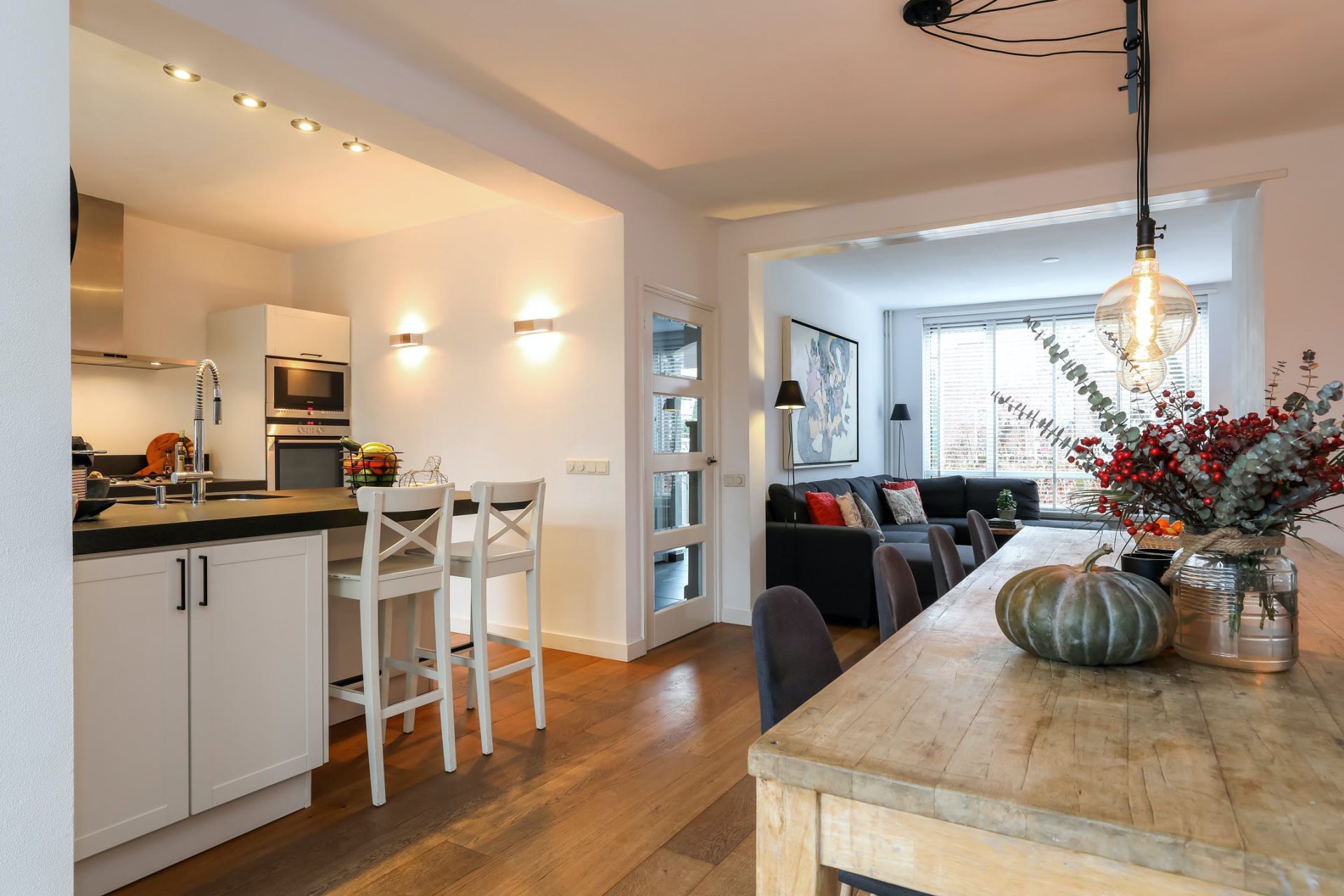 Verrassend ruim opgezette leefruimte met mooie houten vloer, met aan de voorzijde een zithoek v.v. gashaard.