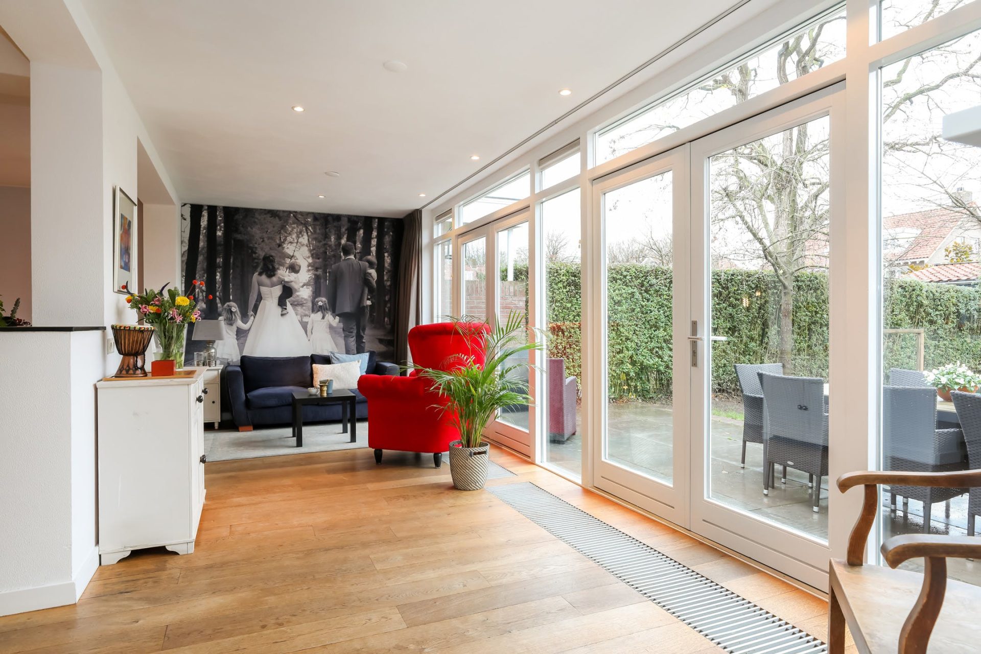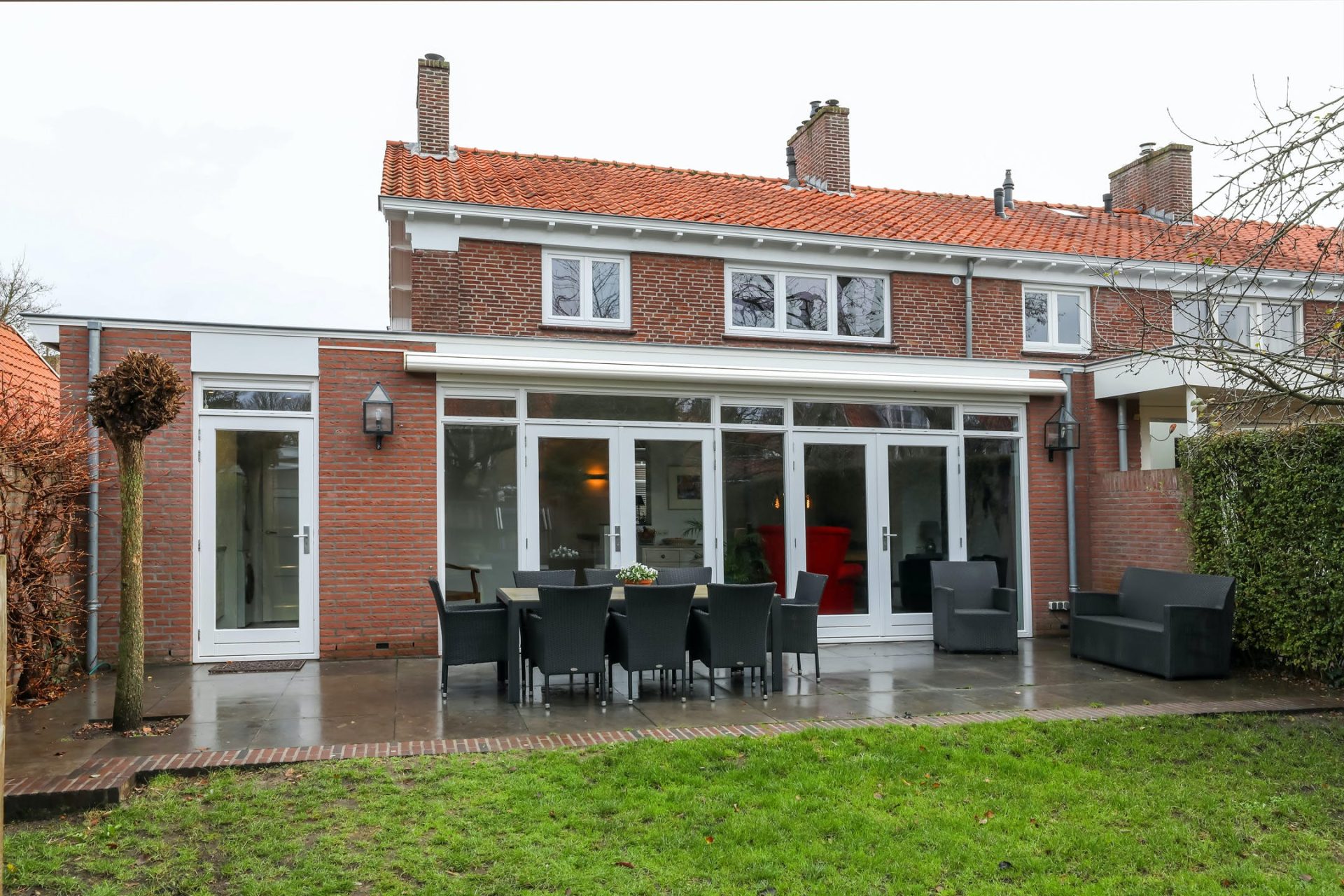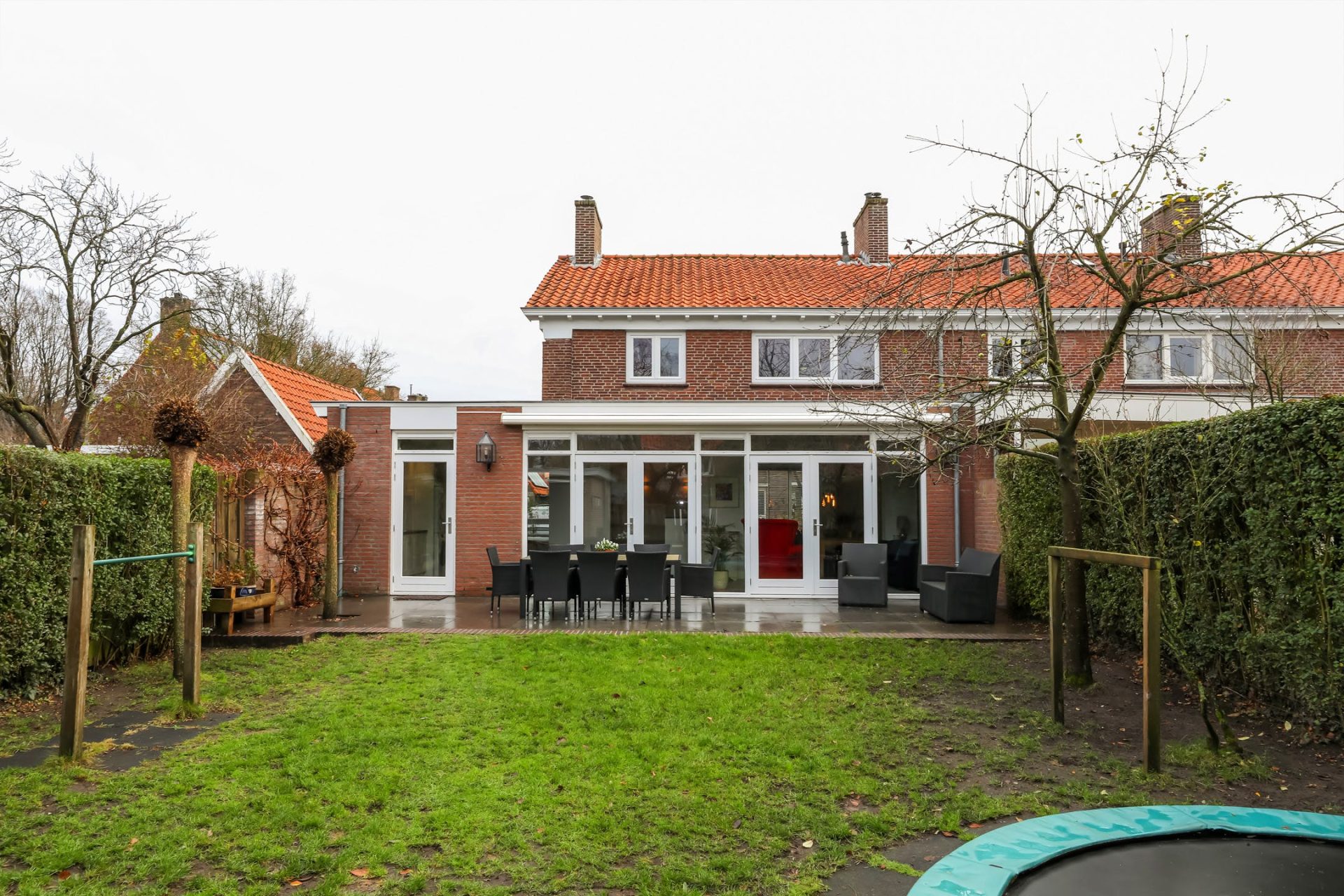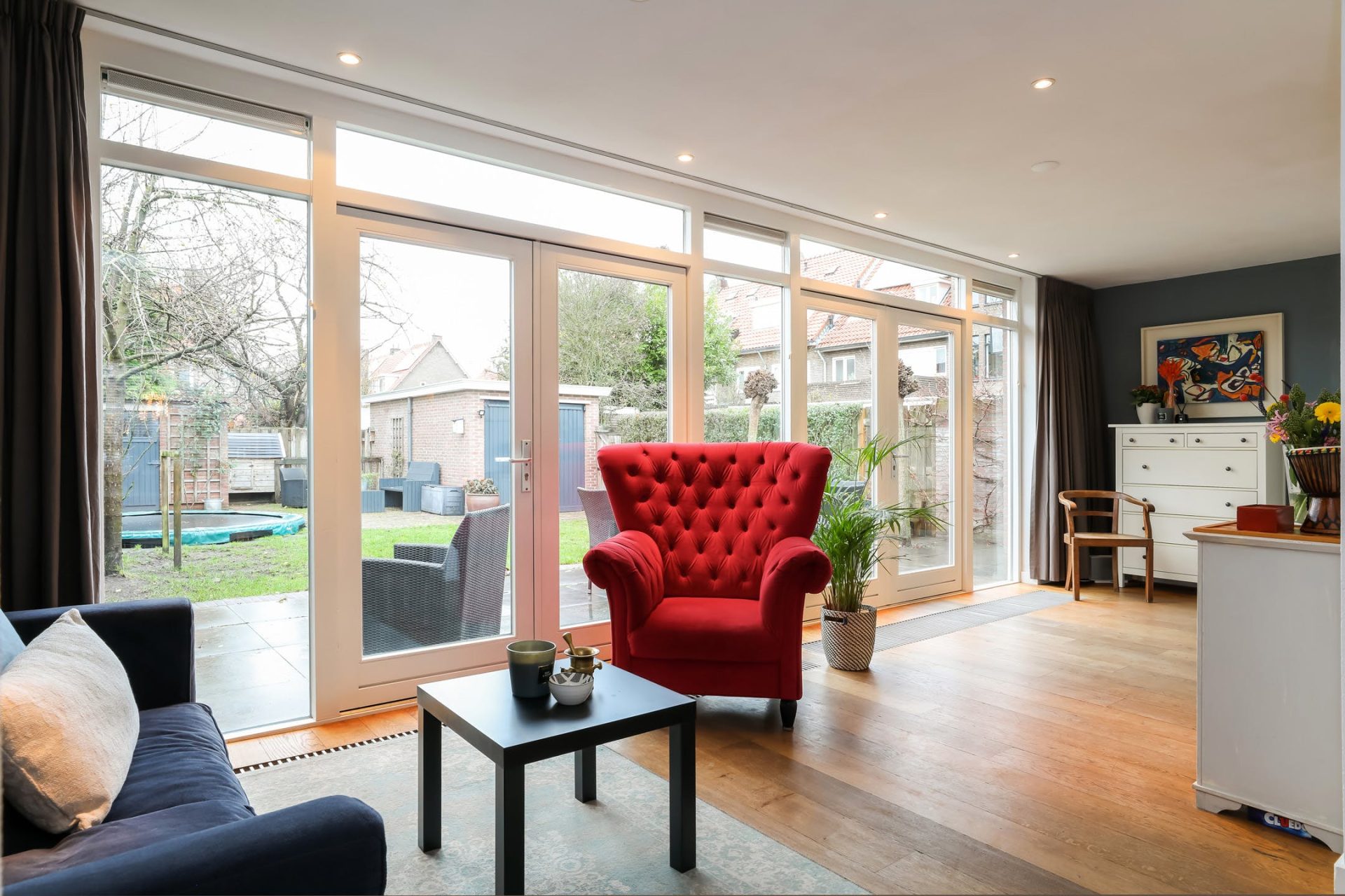 De achterzijde is over de gehele breedte uitgebouwd en kan multifunctioneel worden ingericht. De vele raampartijen en dubbele openslaande deuren zorgen voor volop lichtinval en een naadloze aansluiting met de tuin.