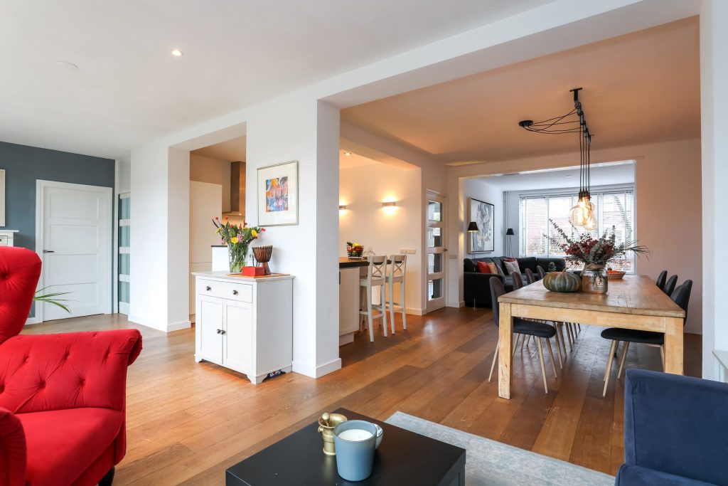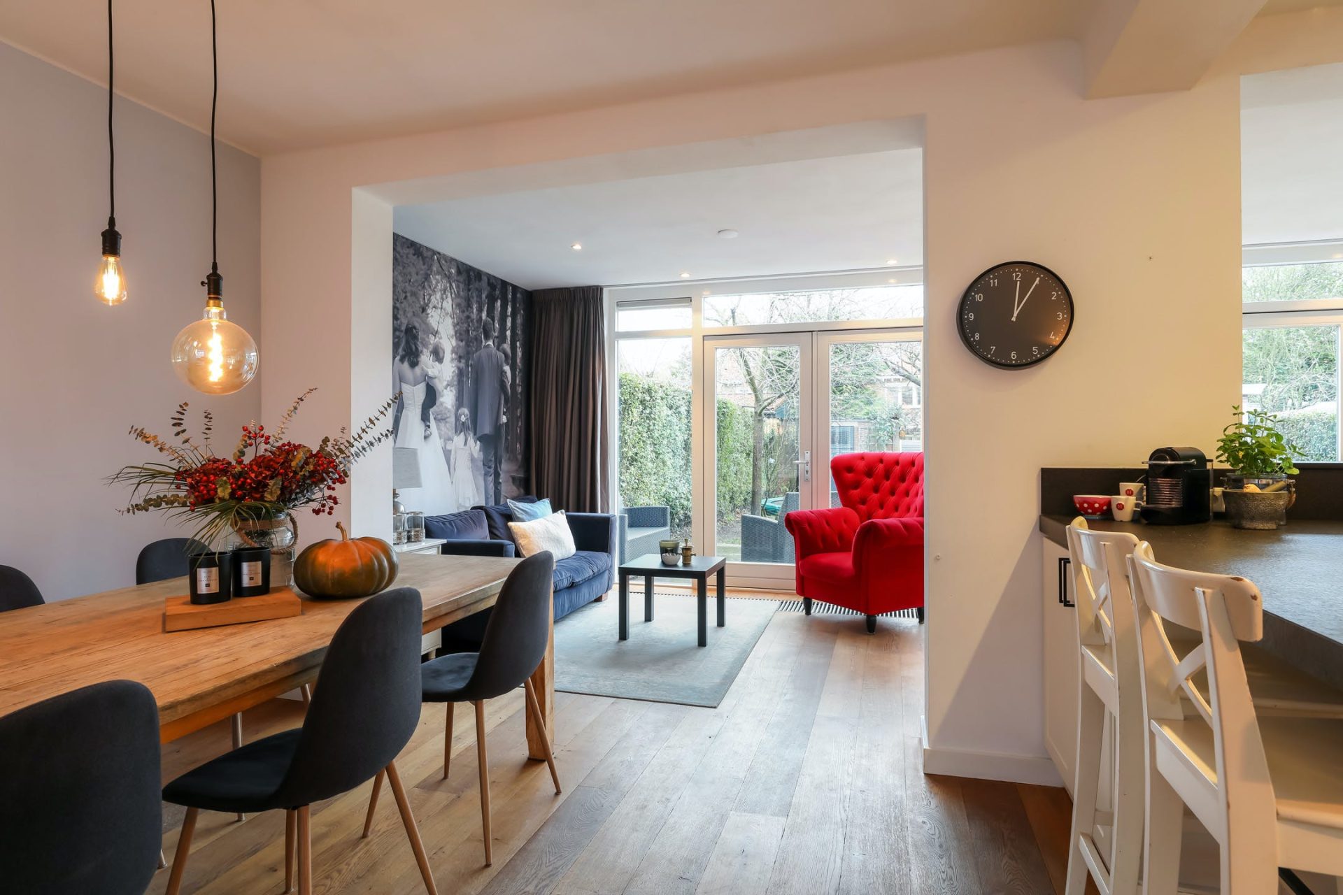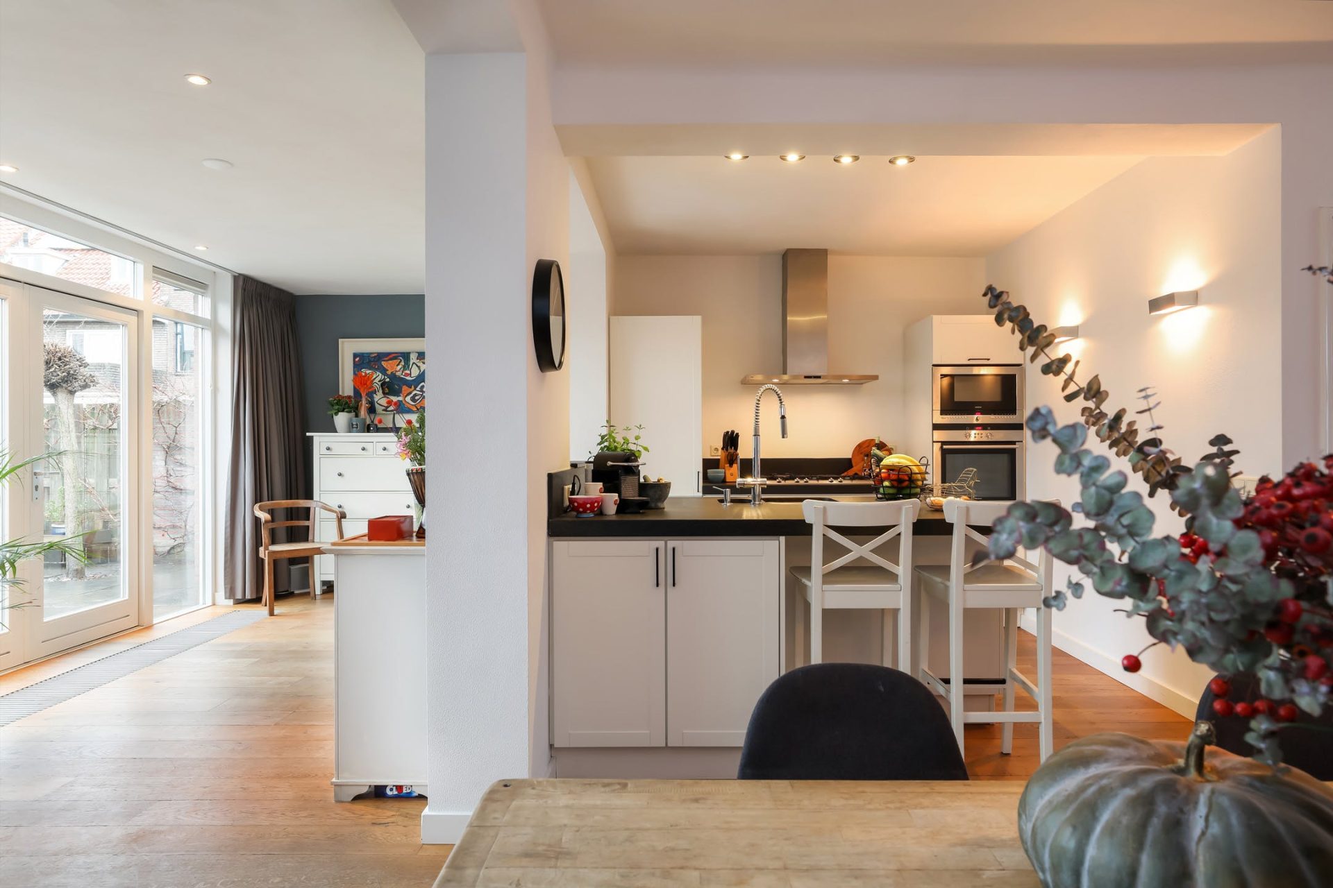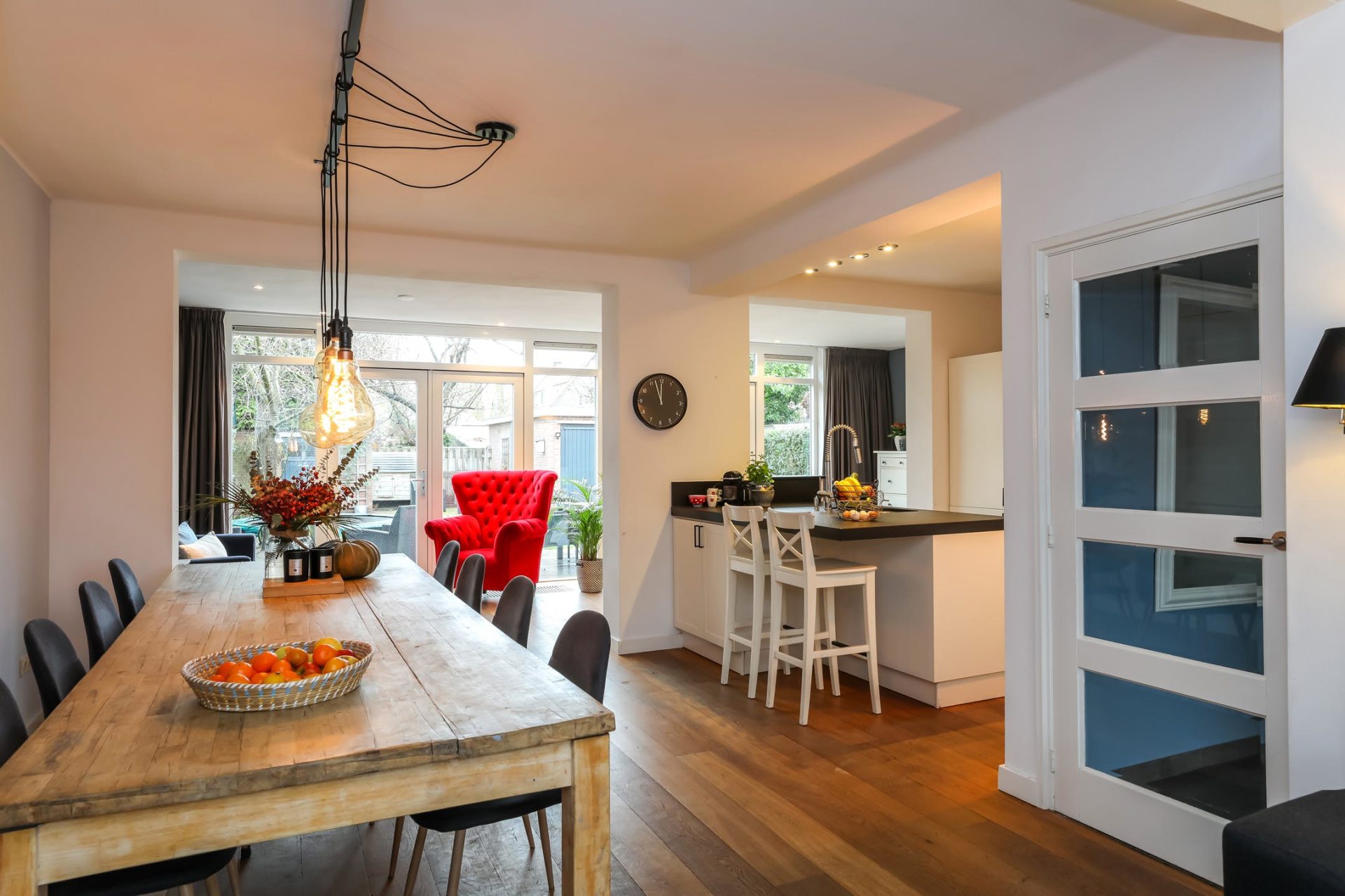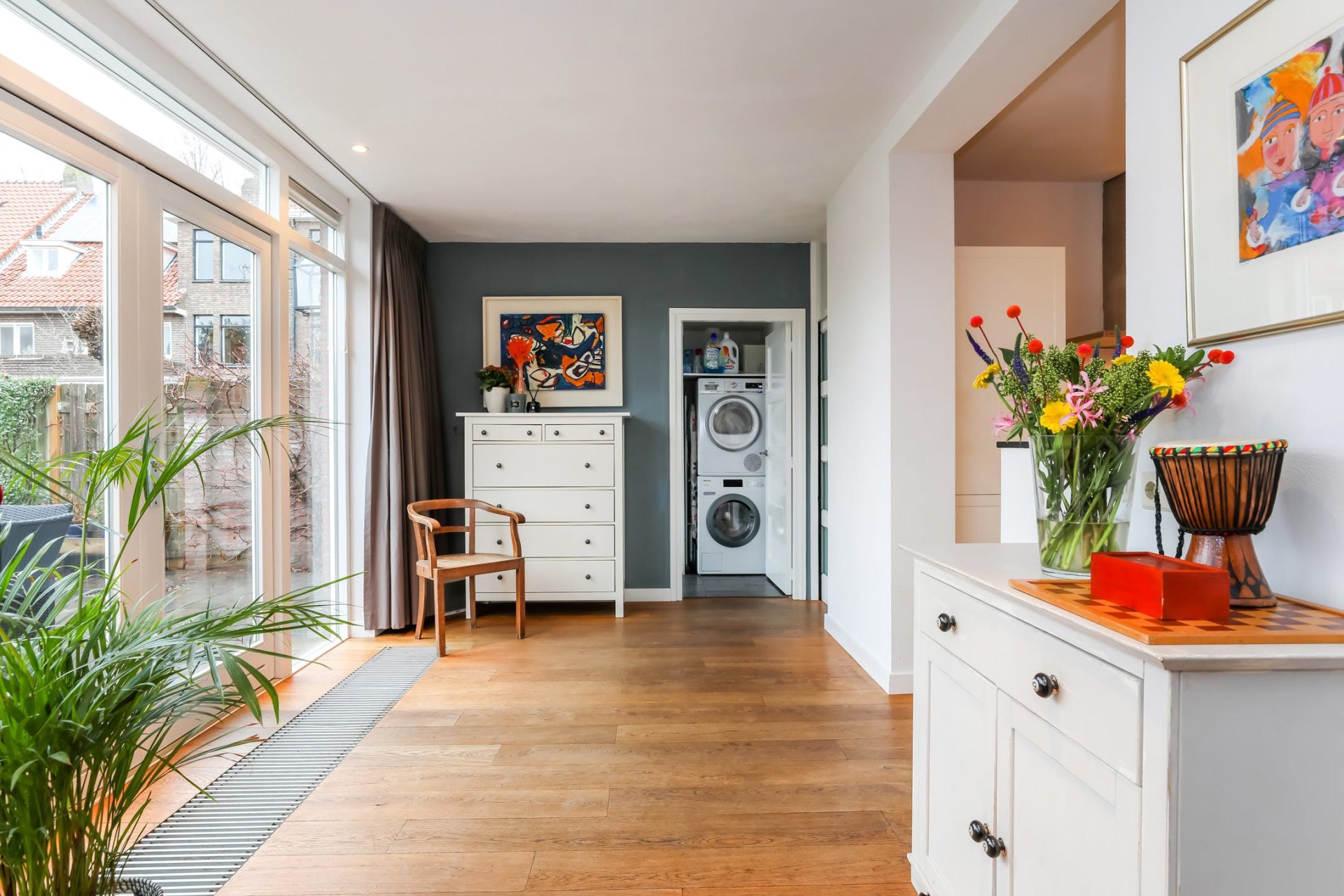 De achterzijde is over de gehele breedte uitgebouwd en kan multifunctioneel worden ingericht. De vele raampartijen en dubbele openslaande deuren zorgen voor volop lichtinval en een naadloze aansluiting met de tuin.