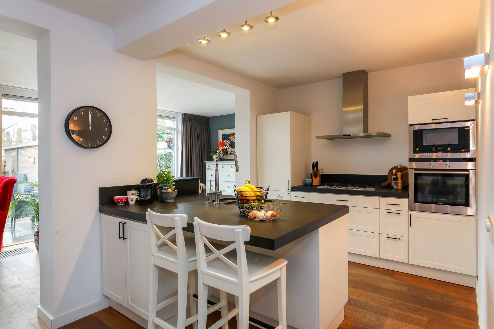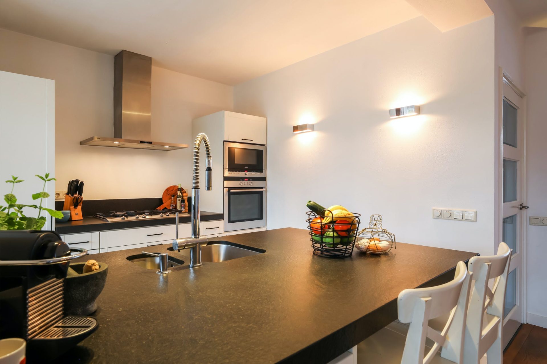 In het midden tref je de open keuken met ruimte voor een grote eethoek. De keuken is uitgerust met de volgende (inbouw)apparatuur; heteluchtoven, combi-oven, vaatwasmachine, 5-pits gaskookplaat, afzuigkap, koel-/vriescombinatie en 1,5 spoelbak.