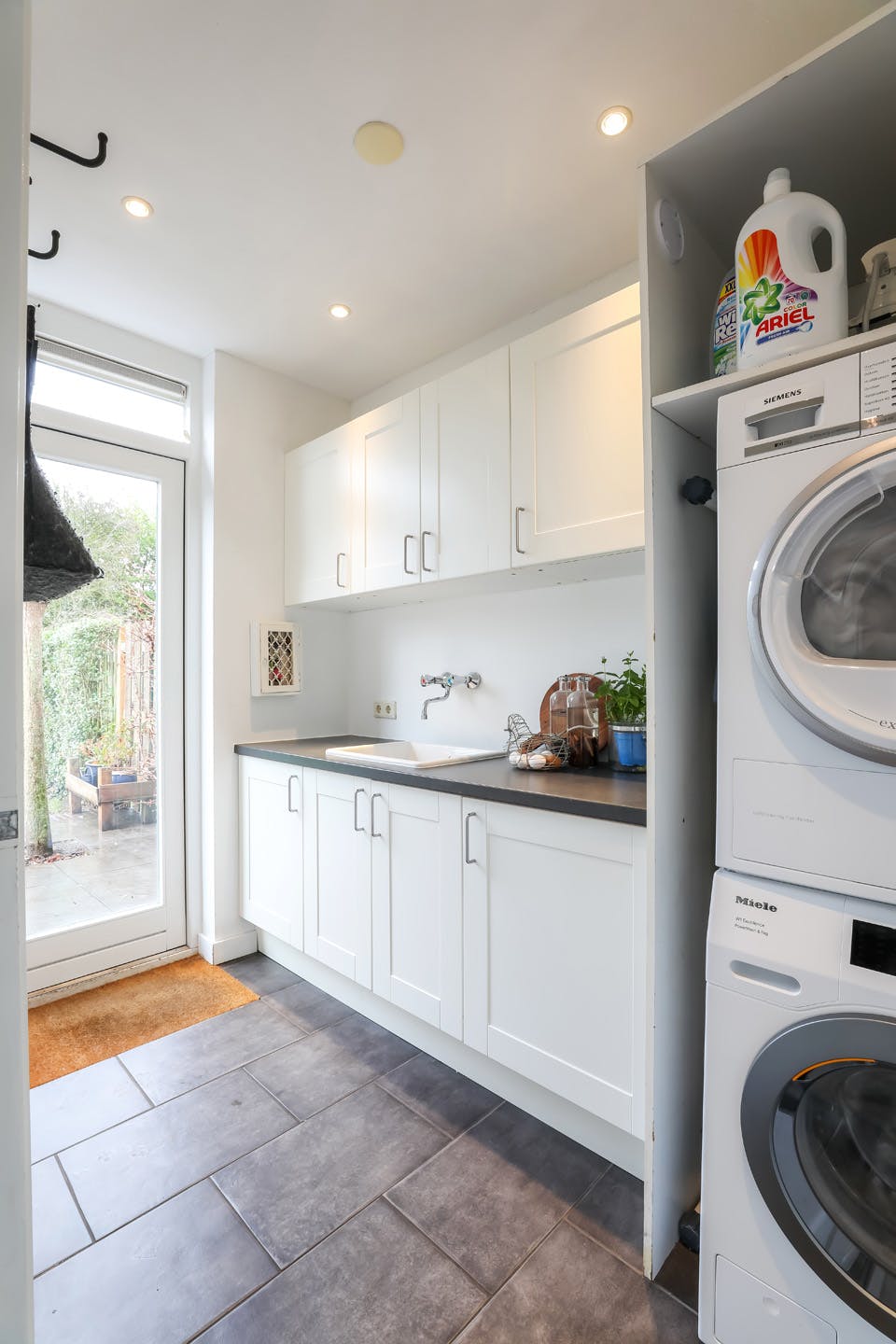 Praktische bijkeuken met tegelvloer, aansluitingen voor wasapparatuur, pantry v.v. spoelbak en loopdeur naar de tuin.