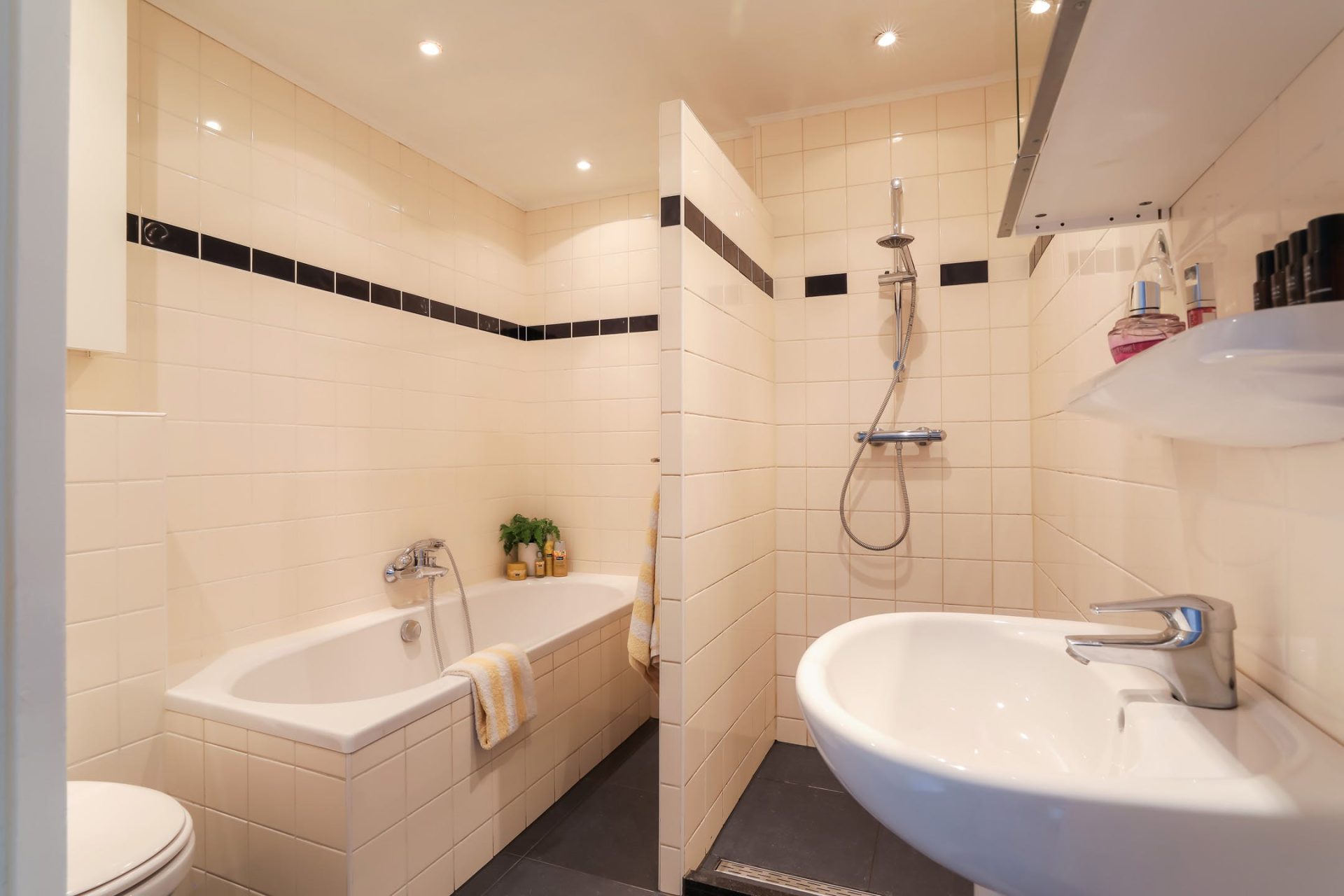 Ruime, geheel betegelde badkamer, compleet met vaste wastafel, inloopdouche, duo-ligbad en een tweede toilet. De badkamer is voorzien van vloerverwarming en een design-radiator.