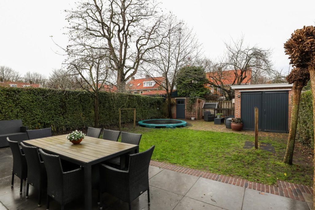 Zeer brede en diepe achtertuin op het westen gericht met direct aan de woning grenzend terras voorzien van elektrisch bedienbare zonneluifel, gazon, tweede terras achter in de tuin, trampoline, garage en berging beiden v.v. elektra.