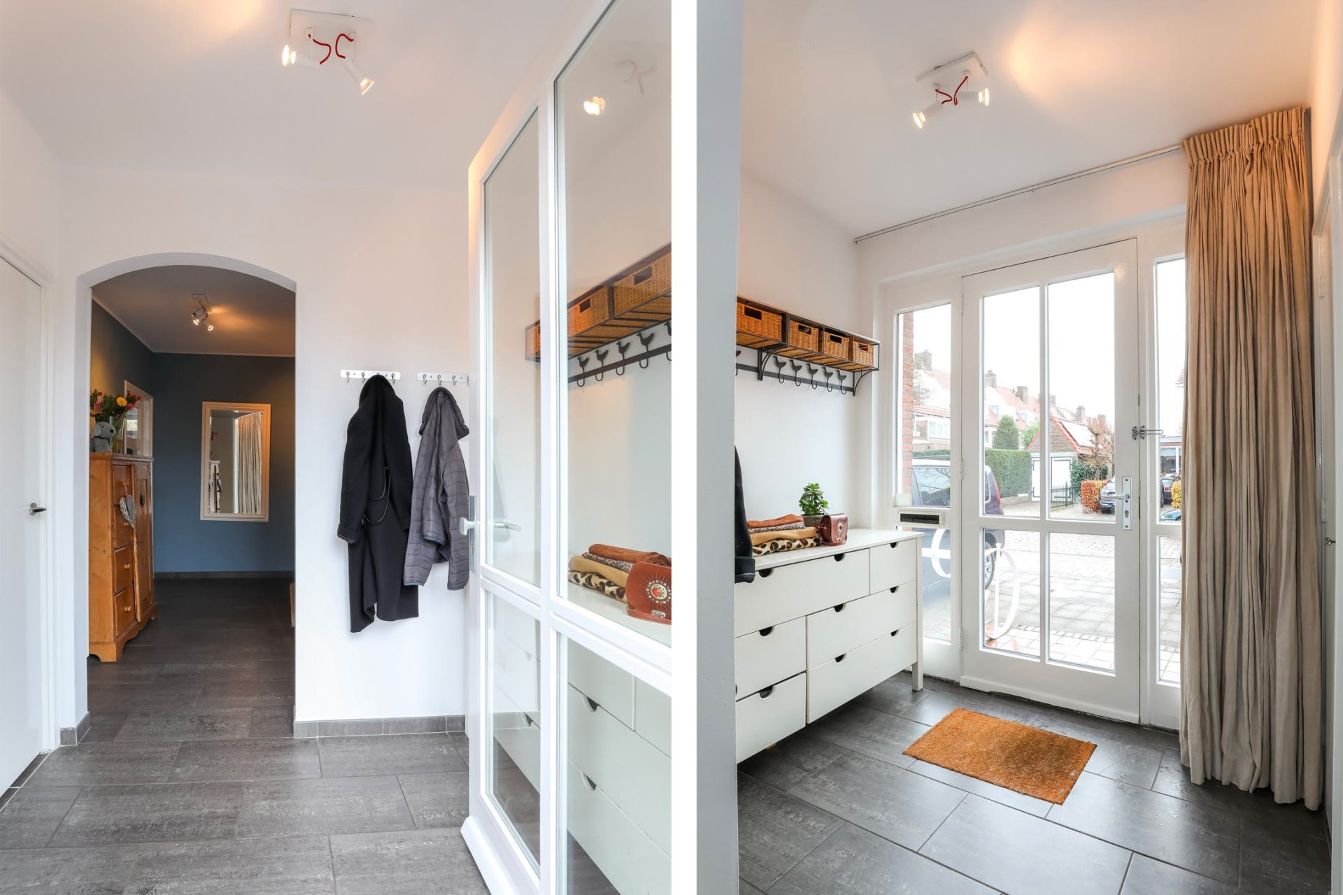 Je komt binnen in een voorportaal met tegelvloer en waar ruimte is voor een kapstok, meterkast en inbouwkast.