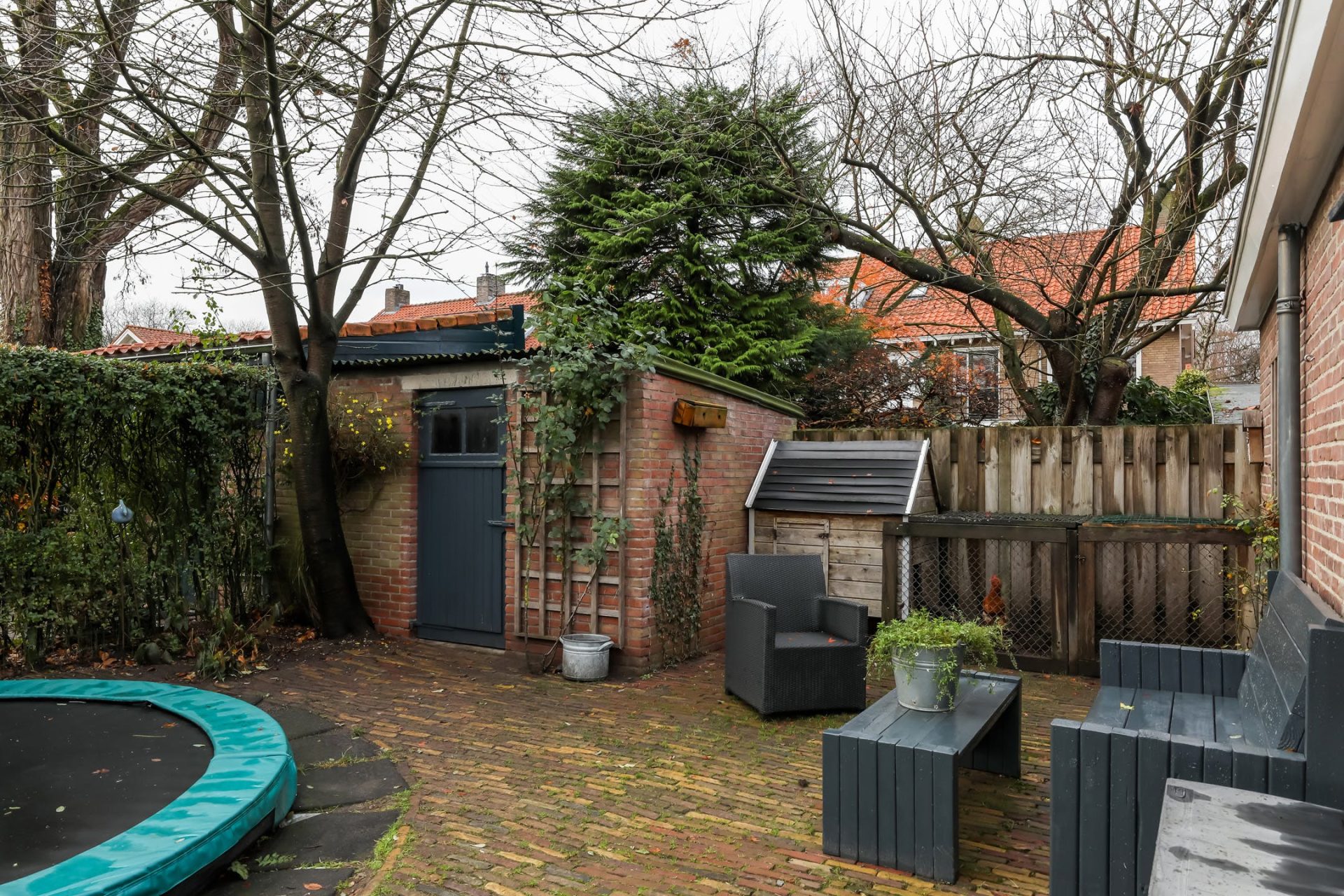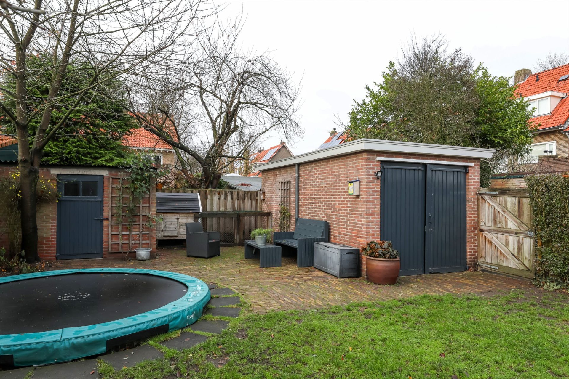 De tuin is vrij te bereiken via een poort aan de zijkant van de woning.