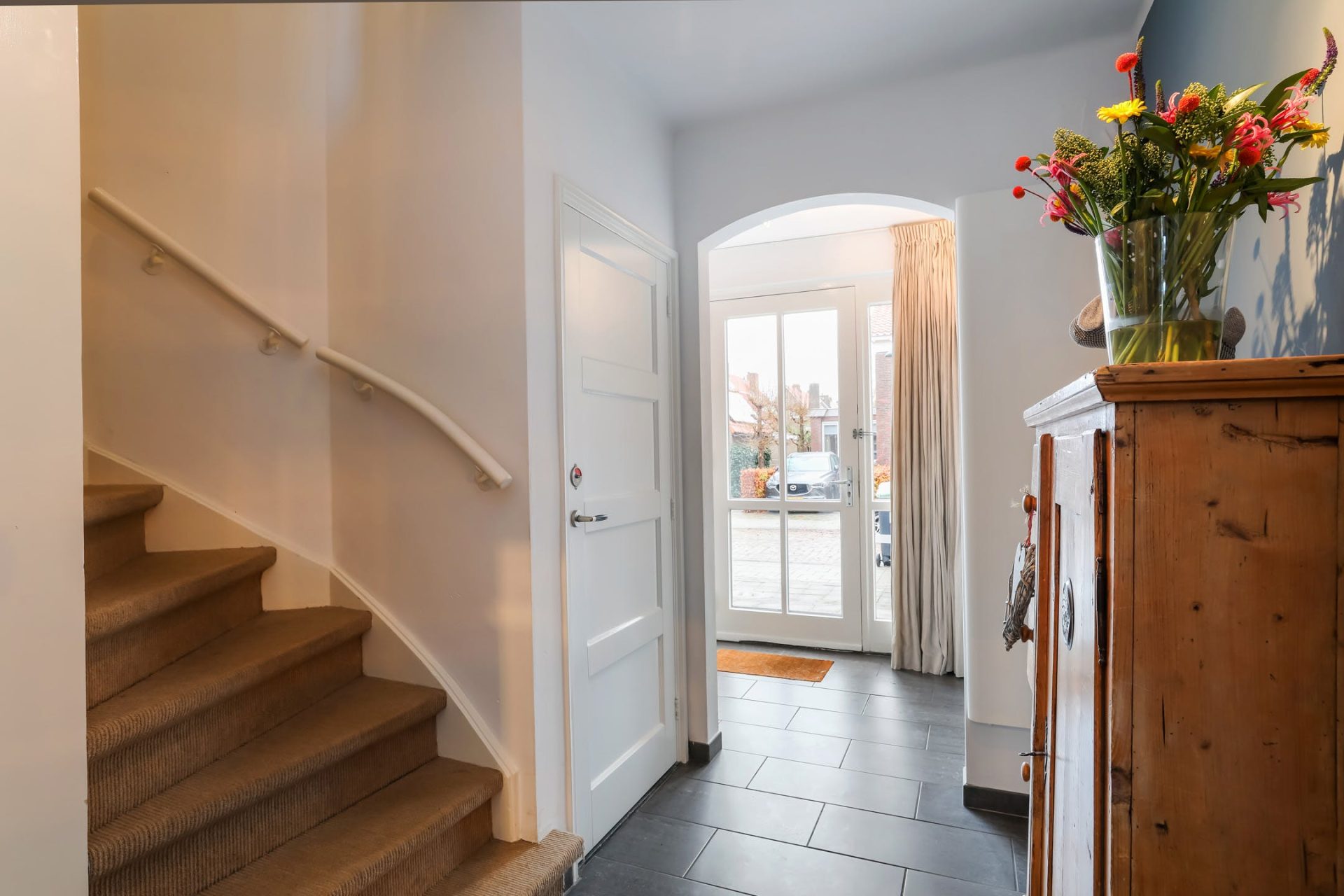 Vanuit de hal is er een trapopgang naar de verdieping en een deur naar de woonkamer.