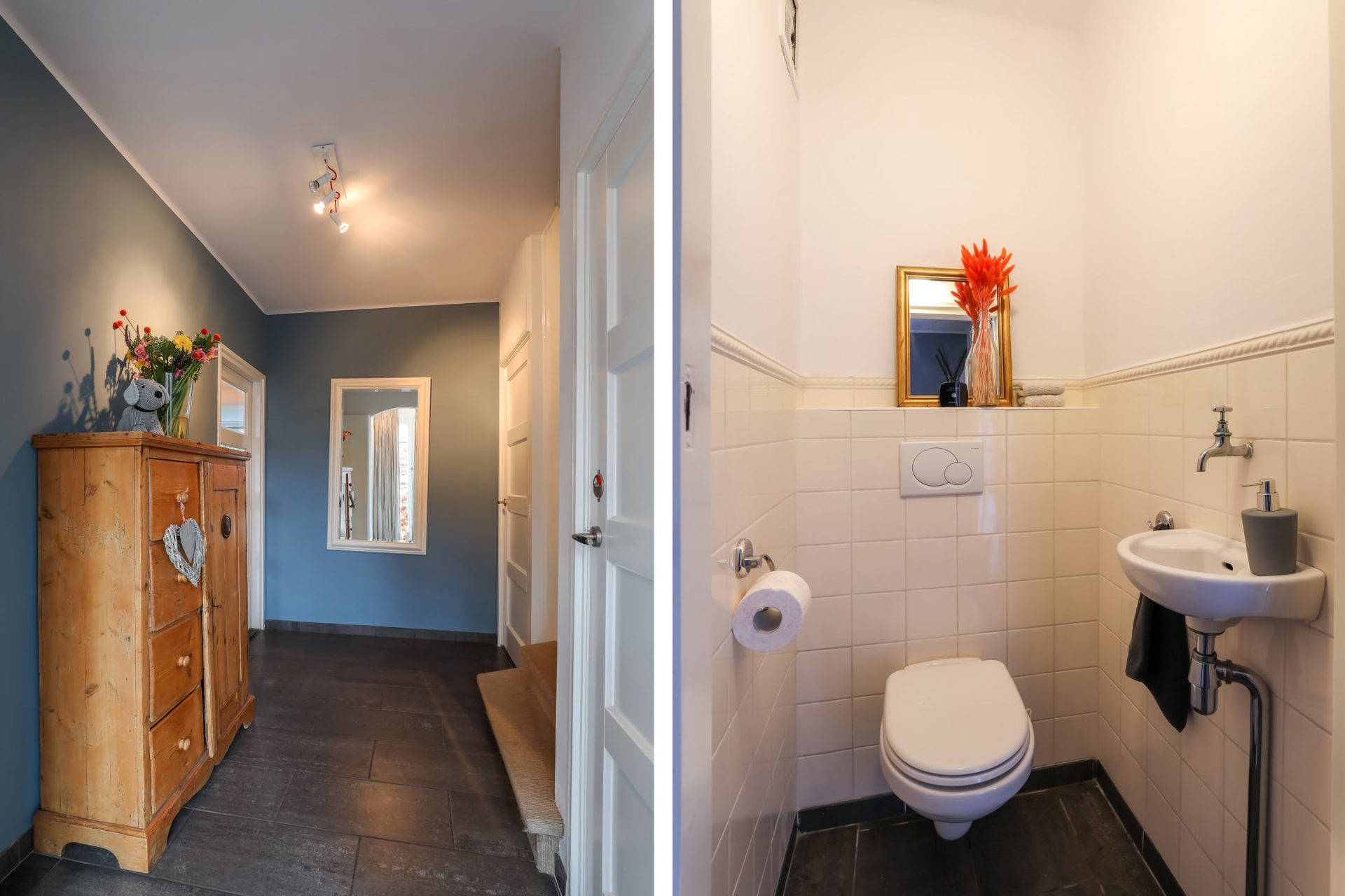 Aansluitend de hal met tegelvloer, verdiepte trapkast en gastentoilet met zwevend closet en fonteintje.