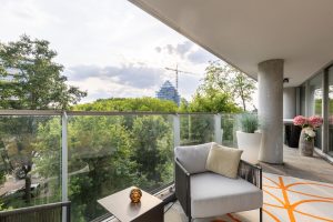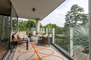 Via de grote schuifpui in de woonkamer bereikt u de loggia van ca. 31 m²: een royaal balkon met veel privacy, een ideale zonligging en zicht op het park. Dankzij de beschutte ligging is dit een perfecte plek om het hele jaar door te genieten van buiten.