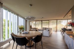 De hal geeft direct een gevoel van ruimte en licht, mede dankzij de kamer hoge glazen deur die zicht biedt op de woonkamer. De leefruimte is opvallend licht en royaal opgezet, met ramen tot aan de vloer aan drie zijden en vrij uitzicht over het park. De luxe open keuken (2024) is op maat gemaakt en voorzien van een kookeiland met bar, wijnklimaatkast, ingebouwde afzuiging, kokend waterkraan en hoogwaardige inbouwapparatuur. Het plafond is stijlvol doorgetrokken in donker hout en vormt een warm contrast met de lichte vloer.