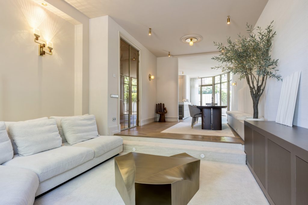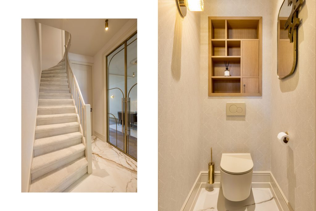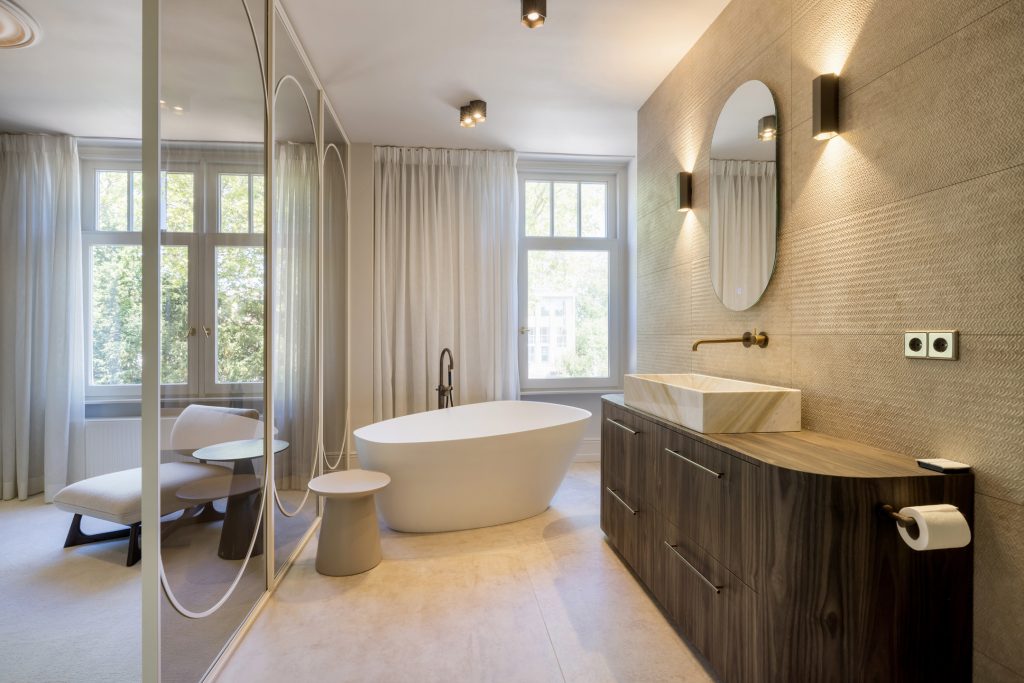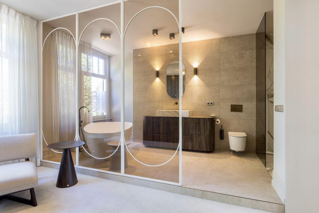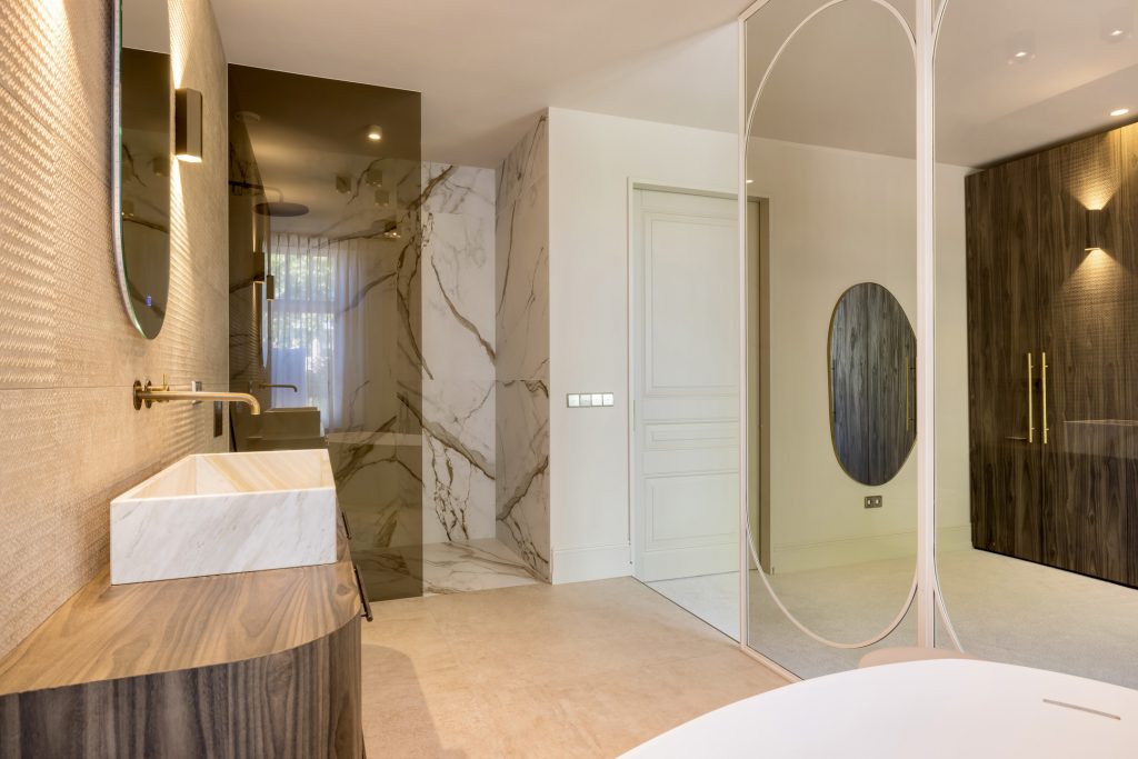 De luxe badkamer op deze verdieping is een ware oase, met een inloopdouche voorzien van een regen- en hangende sproeier, een hangend toilet en een op maat gemaakt wastafelmeubel met een gouden wasbak en een spiegel met geïntegreerde afzuiging. Aansluitend bevindt zich een en-suite kleedkamer, een droom voor iedere modeliefhebber.