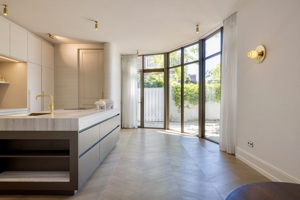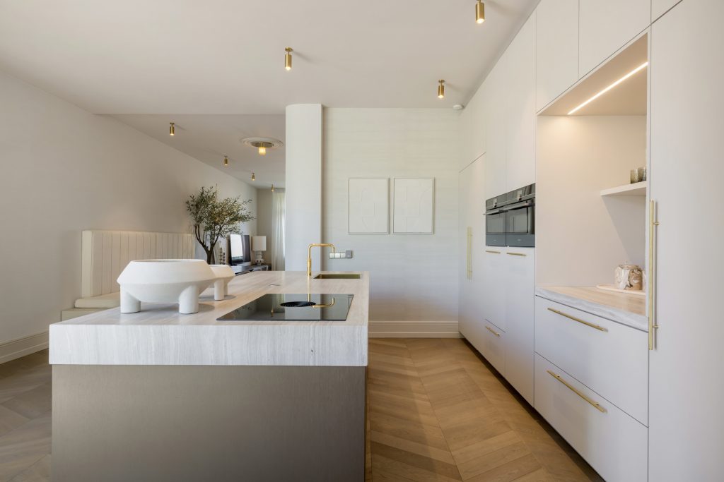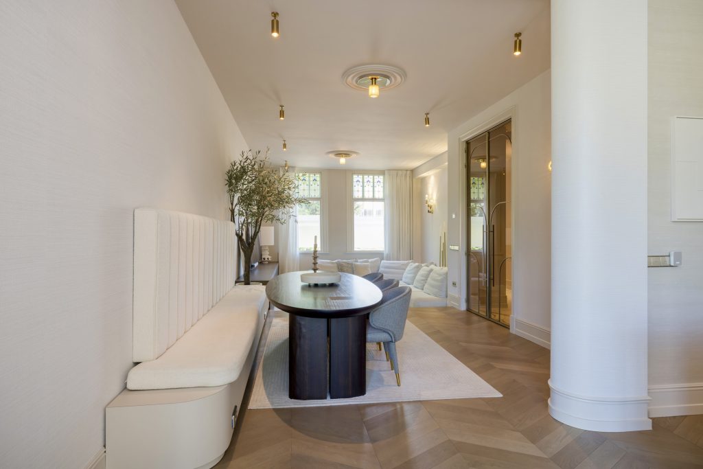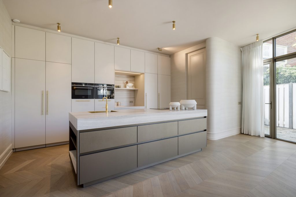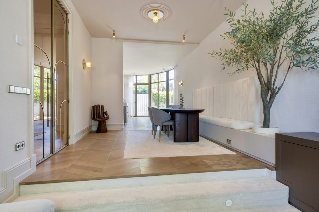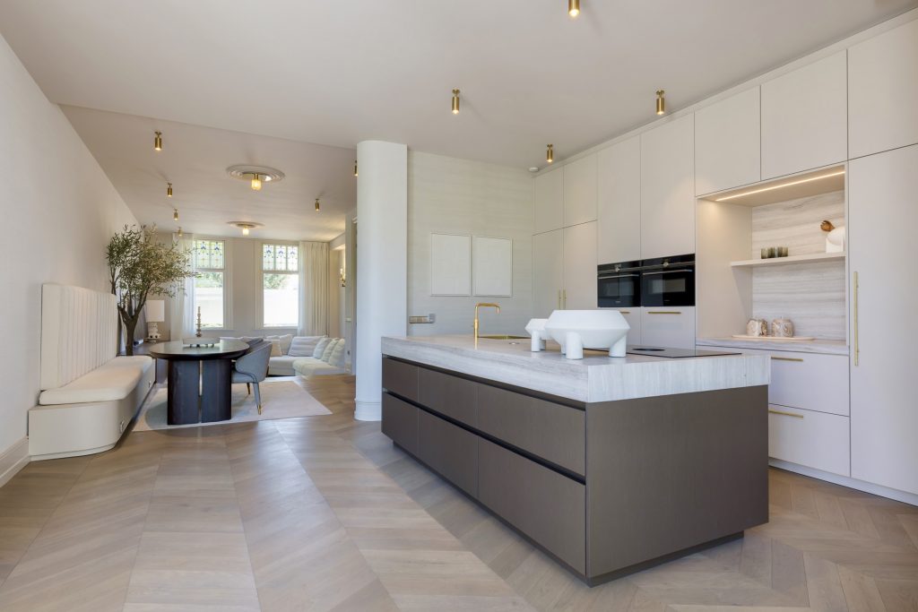Grenzend aan de zitkuil bevindt zich de sfeervolle eethoek, compleet met een ingebouwde wandbank en strategisch geplaatste stopcontacten voor ultiem gebruiksgemak. De open leefkeuken is een droom voor kookliefhebbers: een riant kook- en spoeleiland voorzien van een travertine blad met ingebouwde stopcontacten en een geavanceerd afzuigsysteem verwerkt in de kookplaat van Bora Schott Ceran. De wandzijde van de keuken bevat een nis met subtiele ledverlichting en hoogwaardige inbouwapparatuur, waaronder een hoge koelkast, een aparte grote vriezer, een vaatwasser op hoogte en een Quooker. Twee ovens, waarvan één stoomoven, maken deze keuken tot een culinair walhalla. Een verborgen kast biedt toegang tot een ingenieus kruidenrek en een diepe trapkelder, perfect voor opslag.