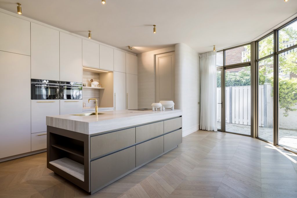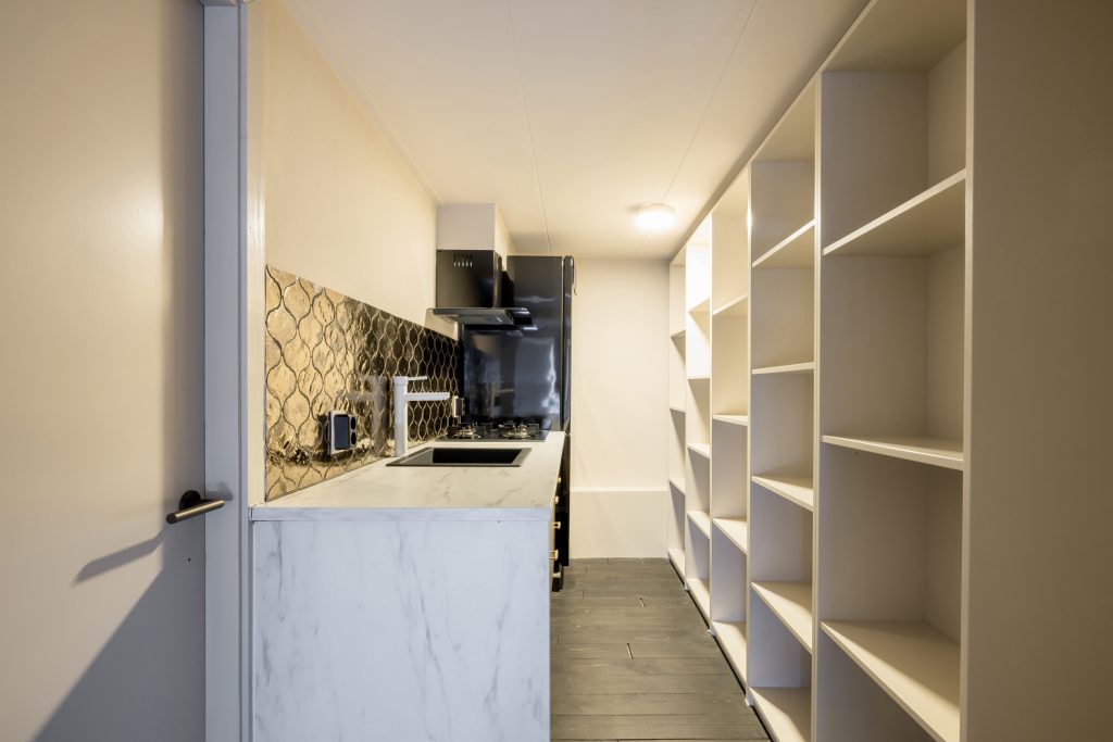 Aan de andere zijde is een ruime pantrykast, toegankelijk via een schuifdeur, waar de wasmachine en droger fraai zijn weggewerkt in maatwerkkasten.