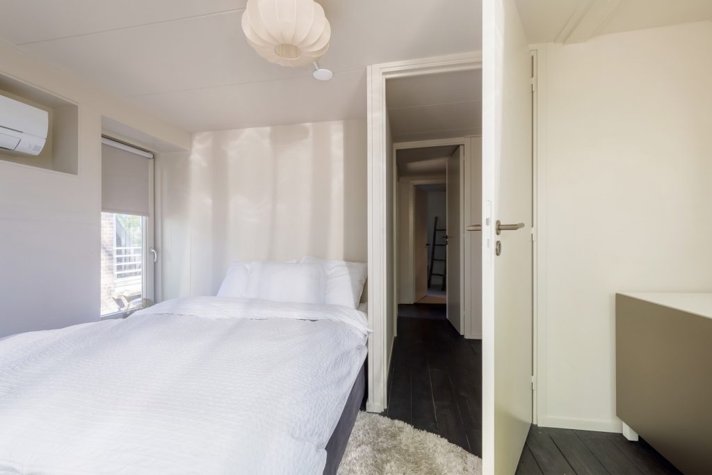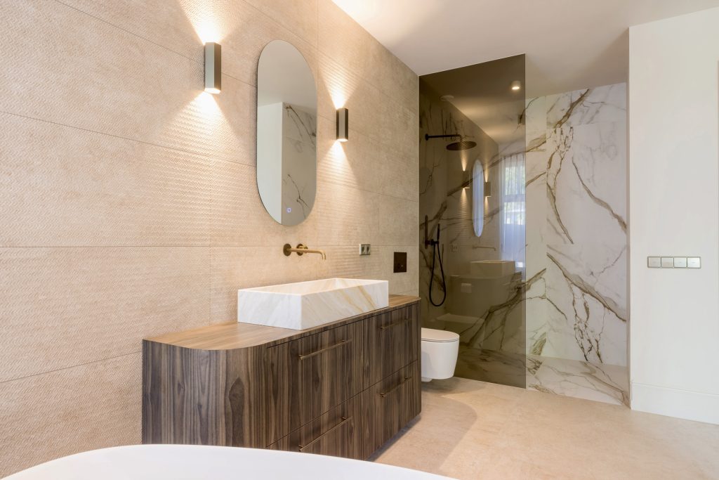 Op de eerste verdieping bevinden zich twee stijlvolle slaapkamers. De kleinere kamer biedt toegang tot een riant balkon, terwijl de masterbedroom pure luxe uitstraalt met een eigen balkon en een en-suite bad- en kleedkamer, toegankelijk via een elegante schuifdeur. Deze kamer is voorzien van airconditioning en een prachtig vrijstaand ligbad, een royale regendouche met losse handdouche en een op maat gemaakt wastafelmeubel. De vrijstaande wasbak met chromen kranen en het hangend toilet vervolmaken de verfijnde uitstraling.