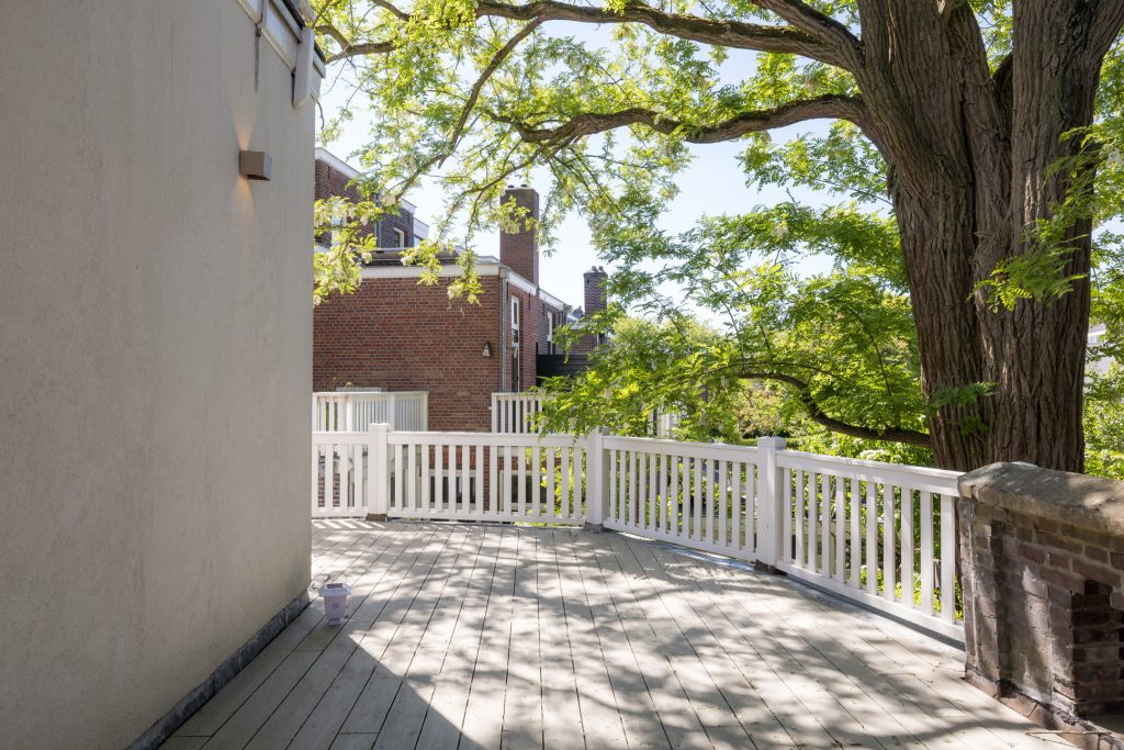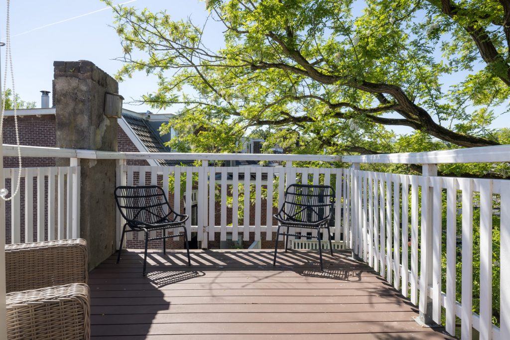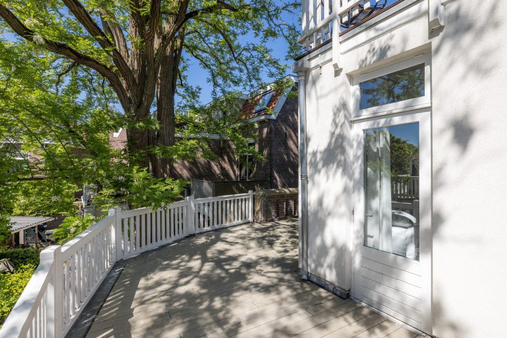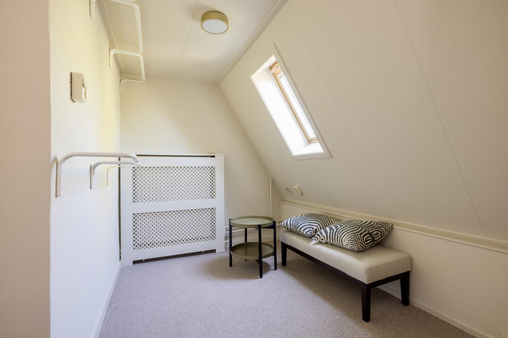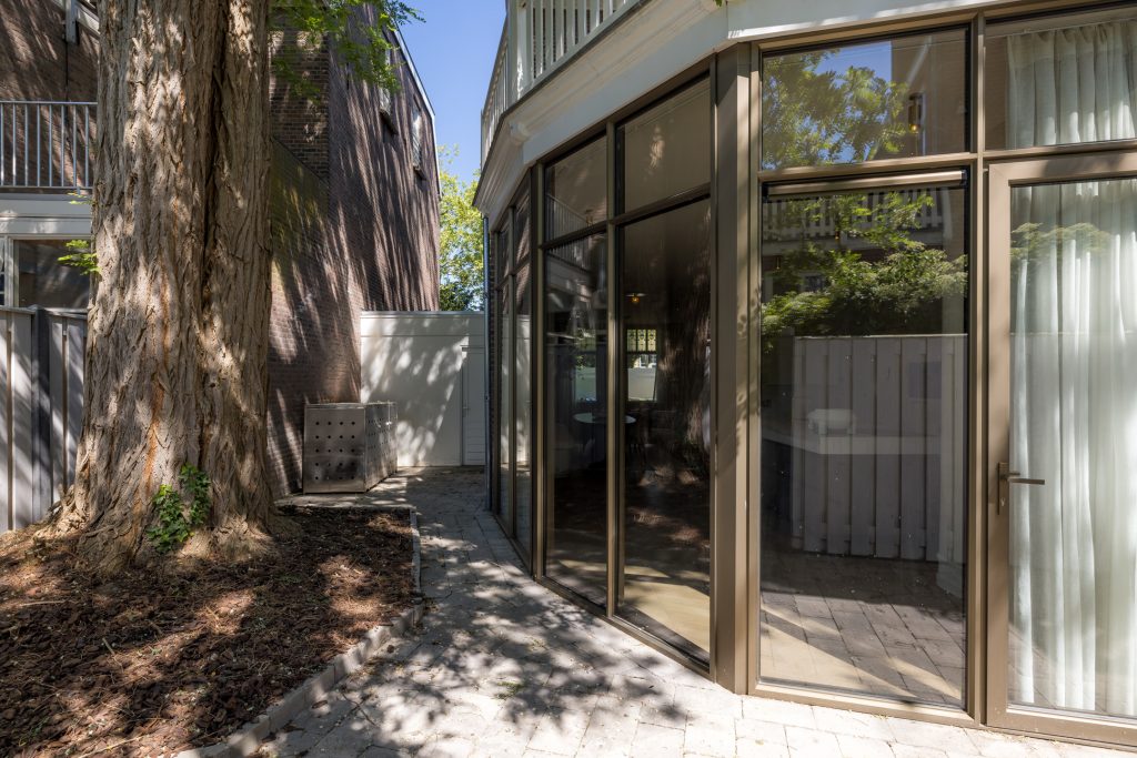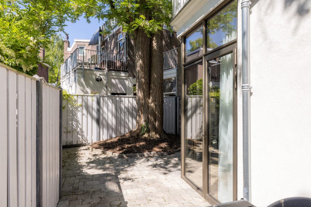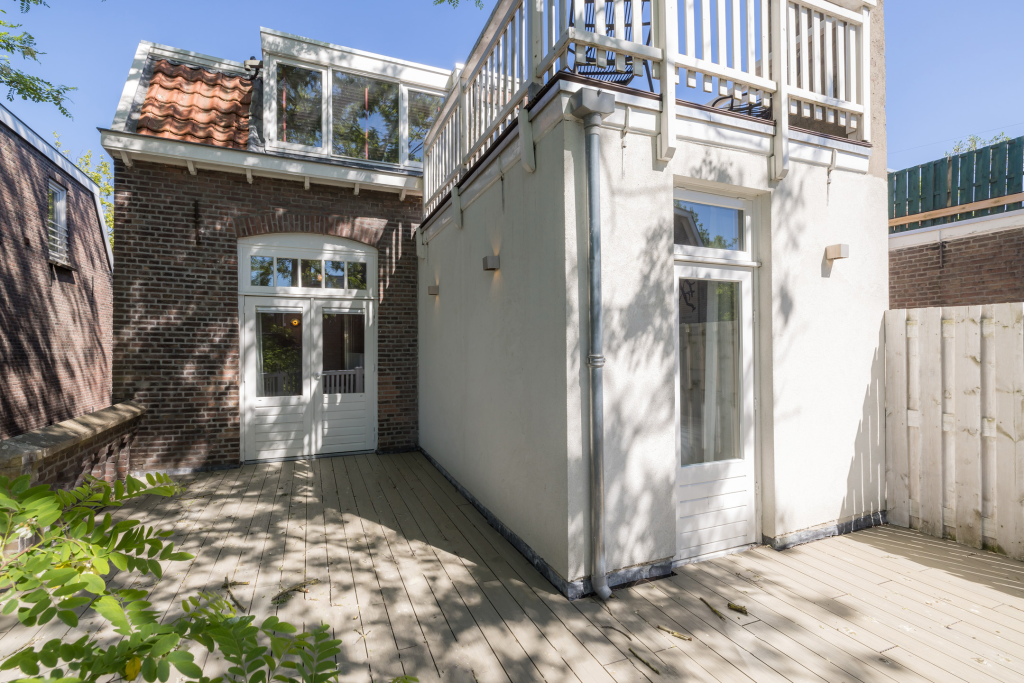 De achterdeur in de woonkamer leidt u naar een sfeervolle stadstuin met toegang tot de garage. In de tuin is plek voor een diner tafel en bbq waar u heerlijk met vrienden of familie kunt genieten van een gezellige avond. Een elegante RVS-constructie geplaatst om de hoek van de tuin, grenzend aan de garage, om de vuilcontainers uit het zicht te houden. Een extra deur biedt toegang tot het achterliggende gangetje, ideaal om fietsen veilig en gemakkelijk weg te zetten.