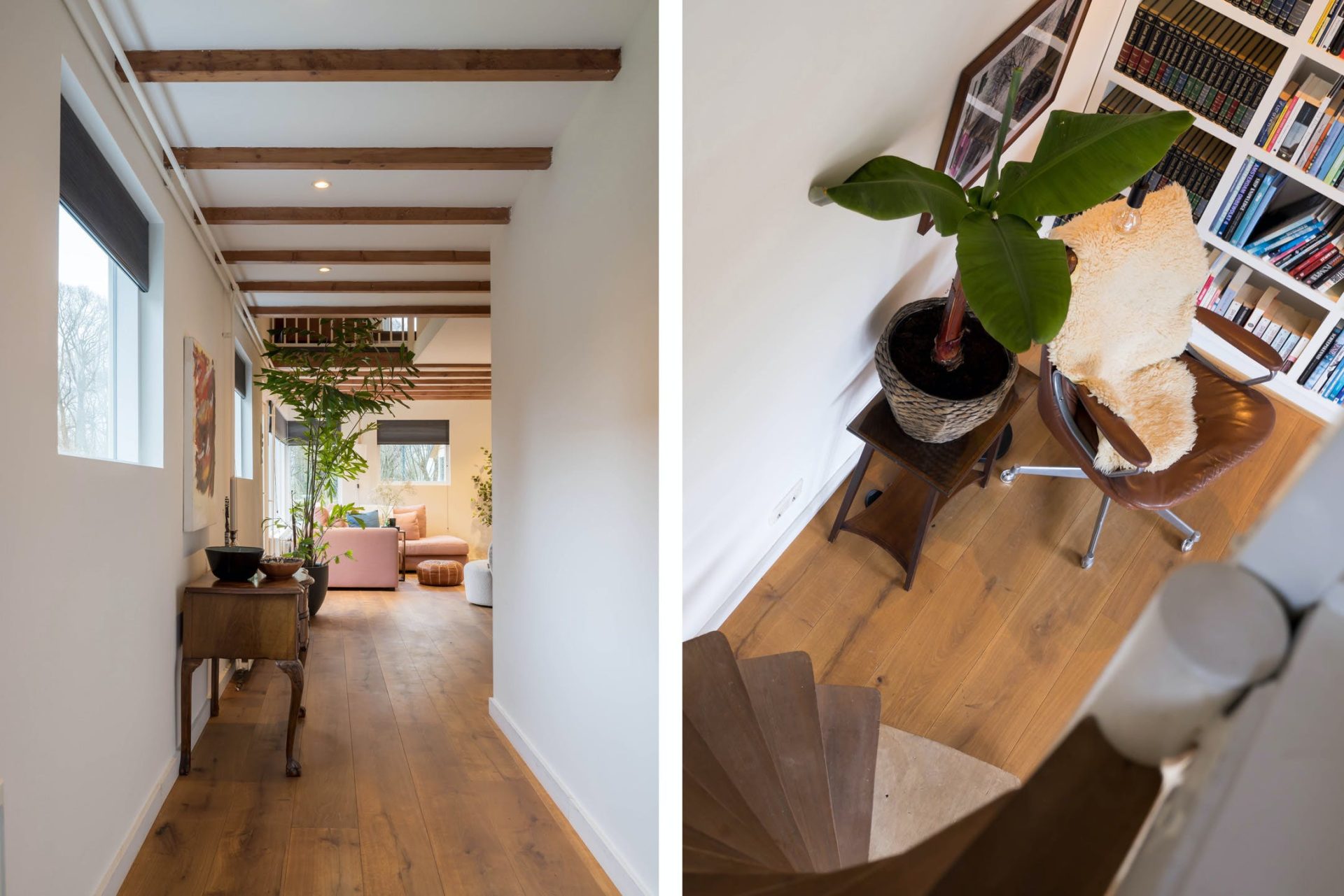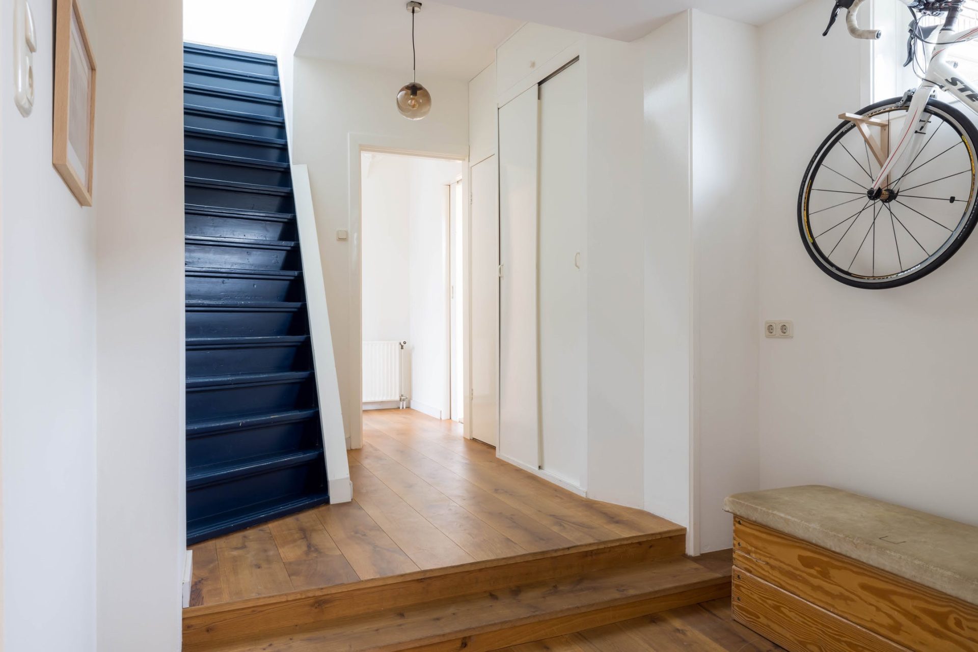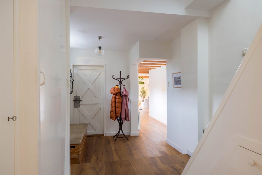 Aan de andere zijde van de hal zijn het toilet en de trap naar de eerste verdieping. Ook zie je hier de meterkast, provisiekast en de garderobe. Met een schuin oog kijk je naar het tweede deel van de hal met een deur naar de tuin en mooi lichtinval.