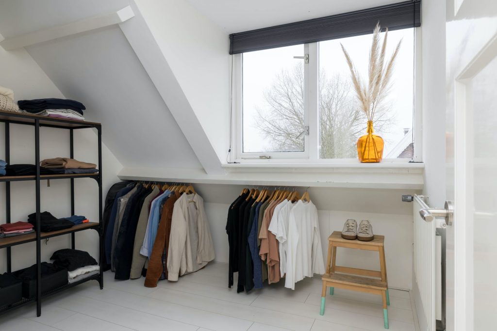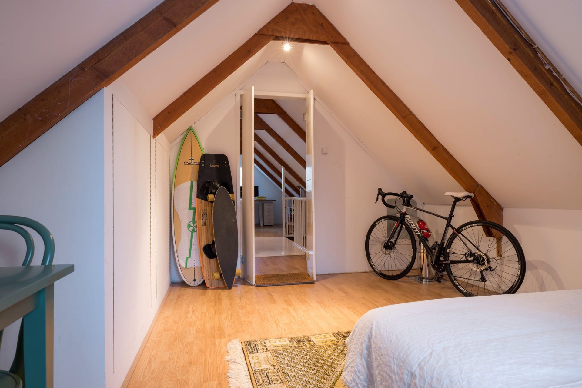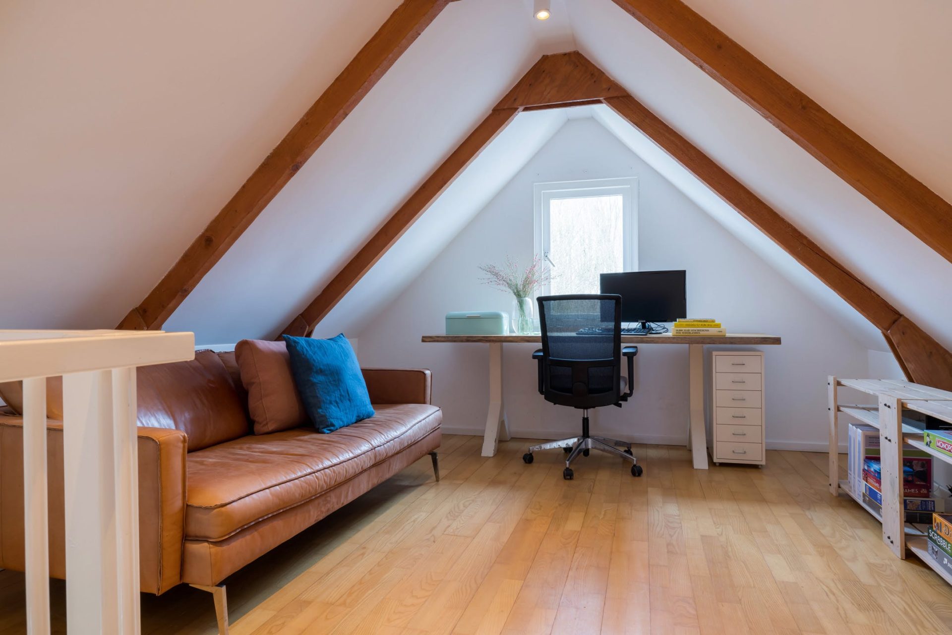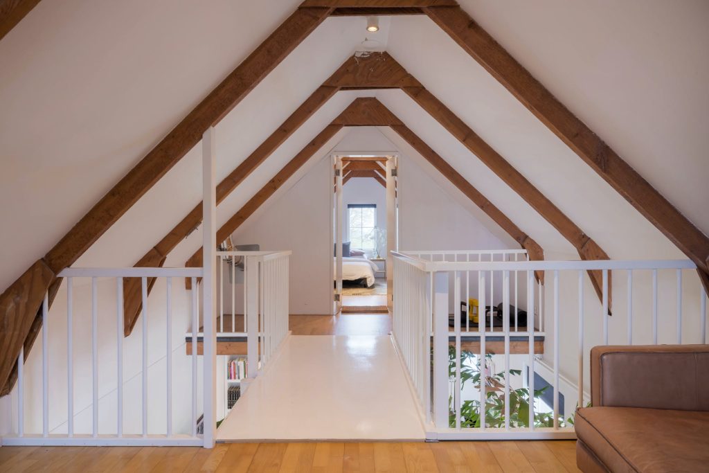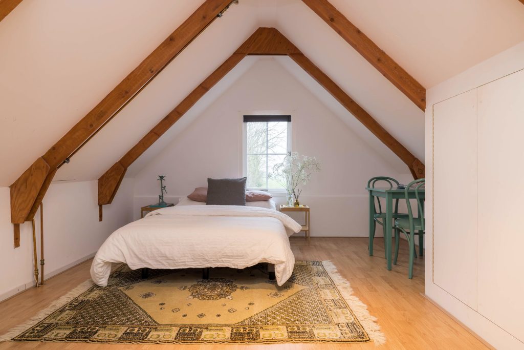 In de nok van de woning is een ruime bergzolder, waar gebukt gelopen kan worden.
