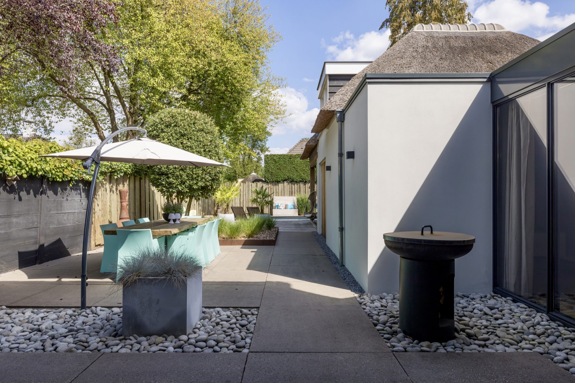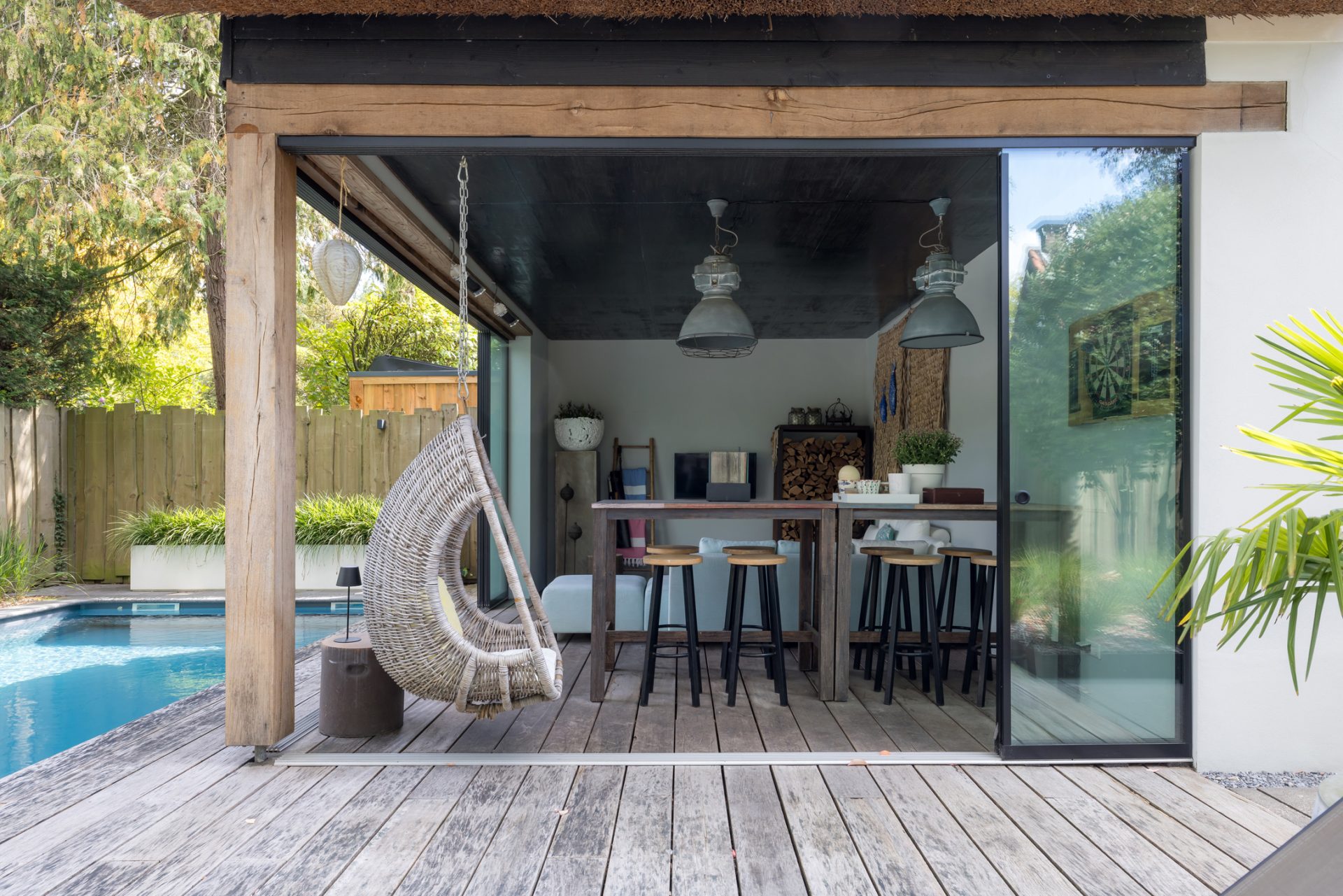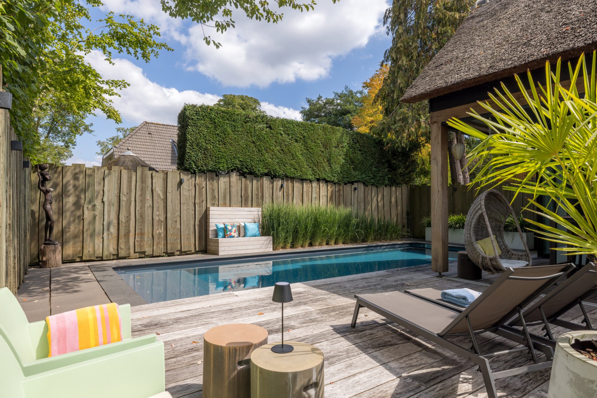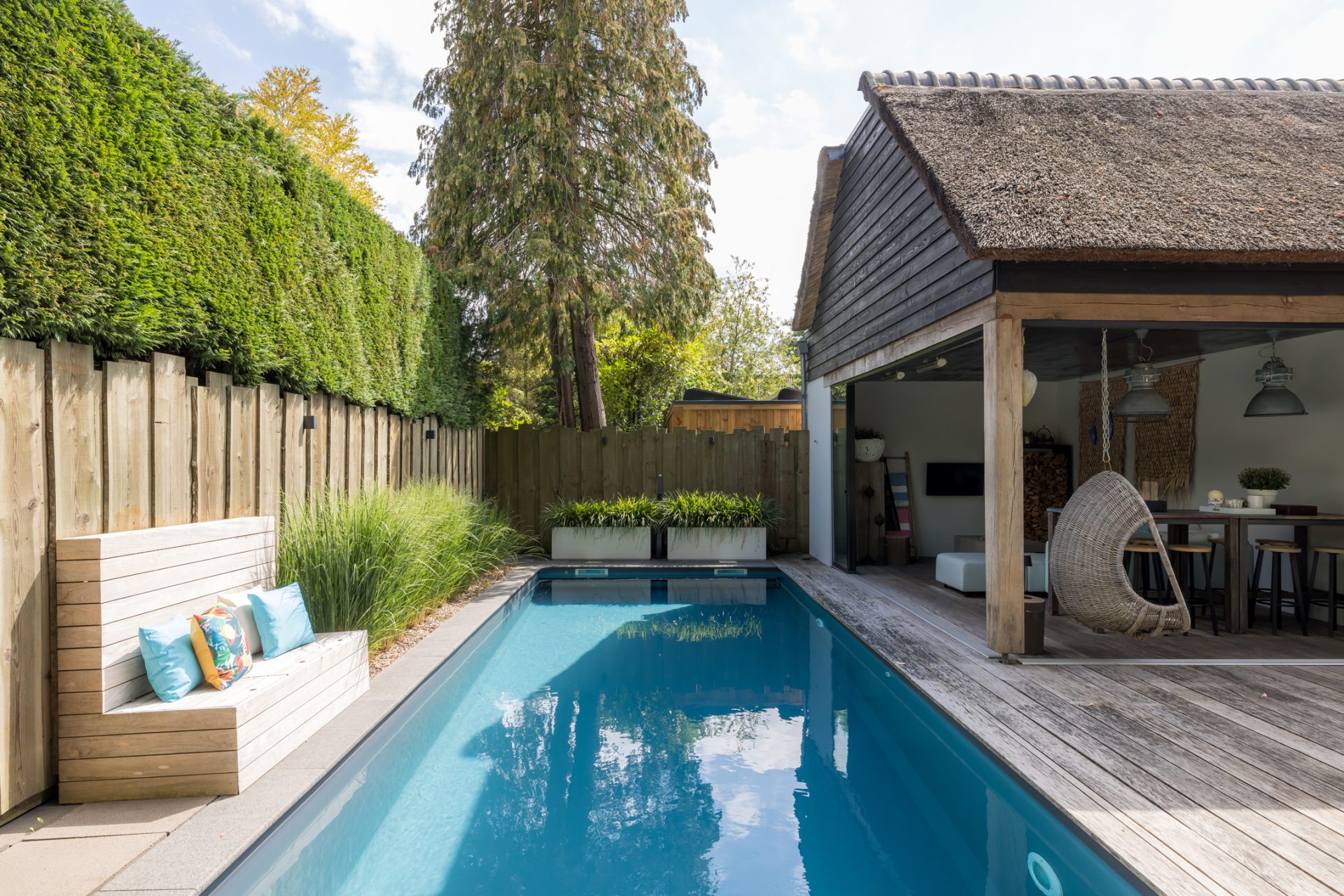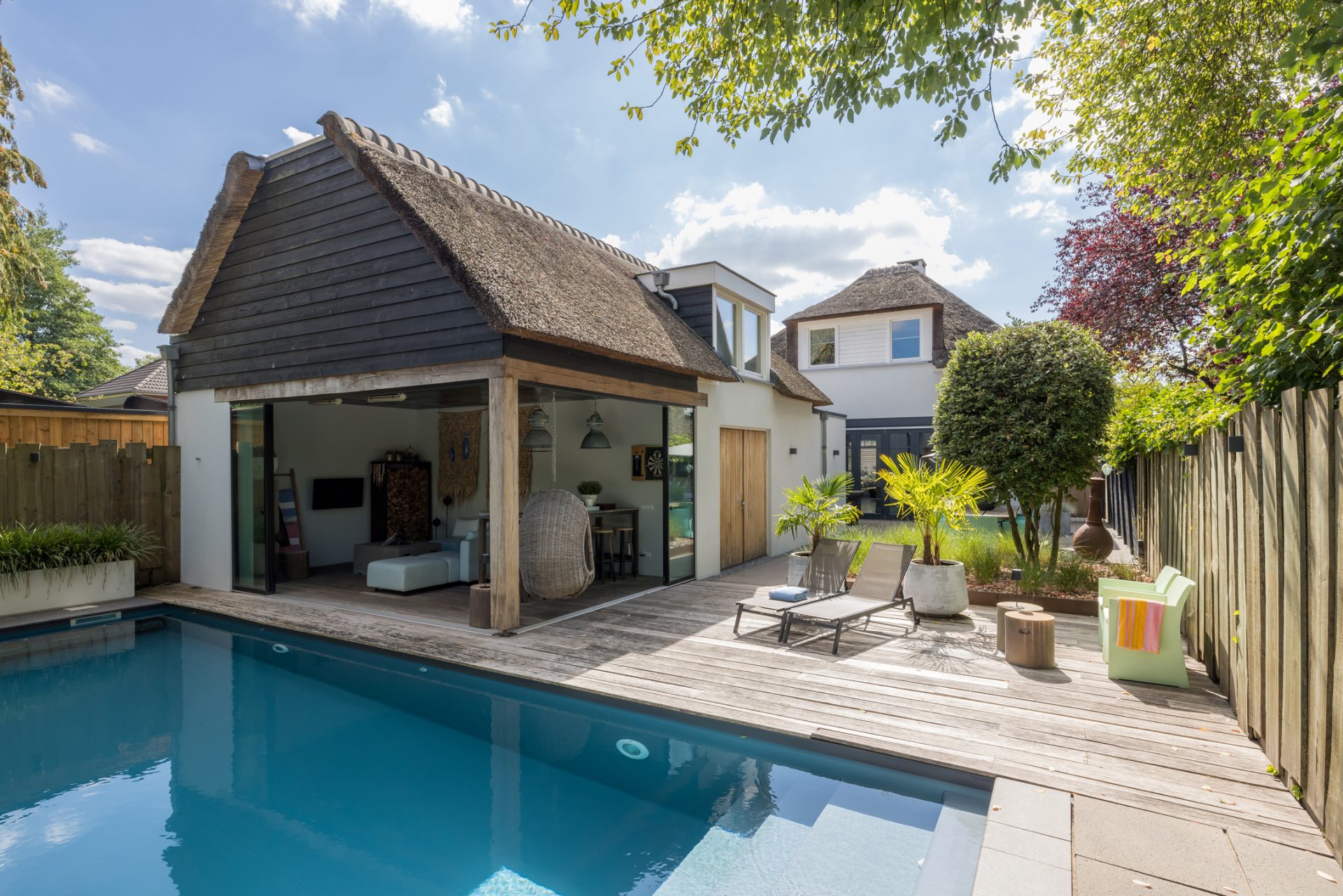 Achter de charmante gevel van deze rietgedekte woning uit ca. 1920 – verscholen tussen het groen en met niets dan rust om zich heen – schuilt een paradijs dat zó fotogeniek is, dat je zou geloven op een tropisch eiland te zijn beland. En toch ben je gewoon in Oisterwijk.
