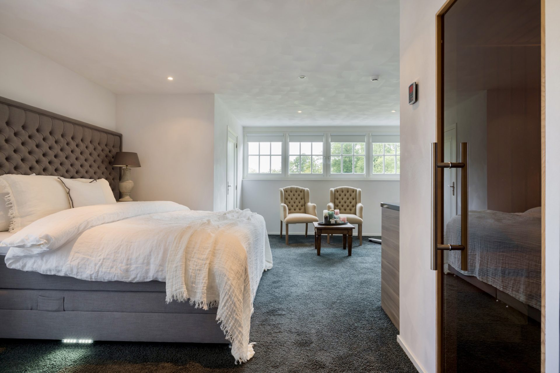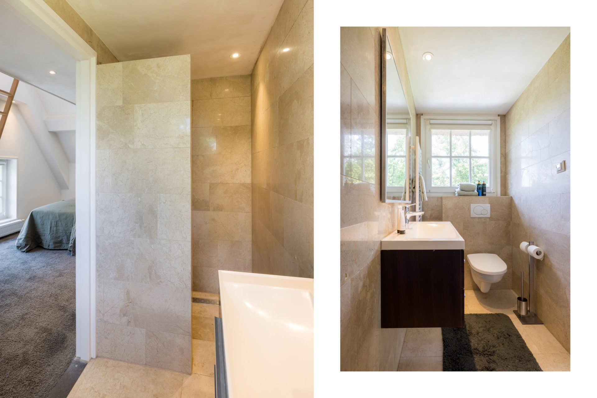 Op de eerste verdieping biedt de overloop toegang tot de hoofdslaapkamer met een eigen badkamer, uitgerust met een bad, douche en wastafel. Een tweede slaapkamer beschikt ook over een compleet ingerichte badkamer. De tweede verdieping herbergt twee slaapkamers, elk met een luxe badkamer, wat de villa ideaal maakt voor gezinnen of gasten.