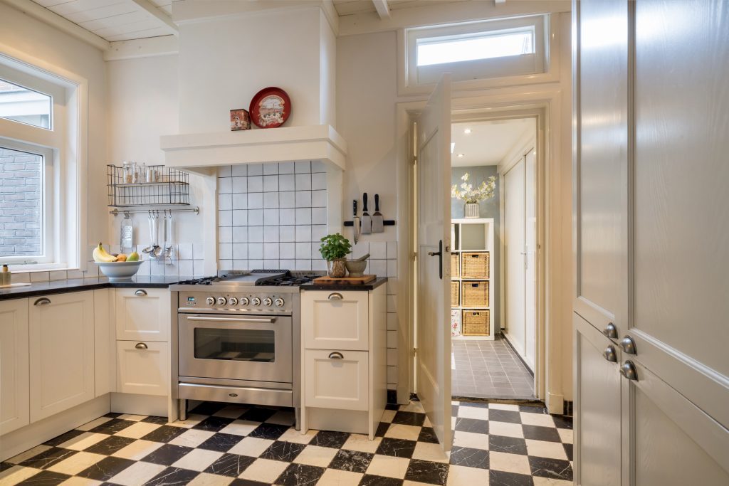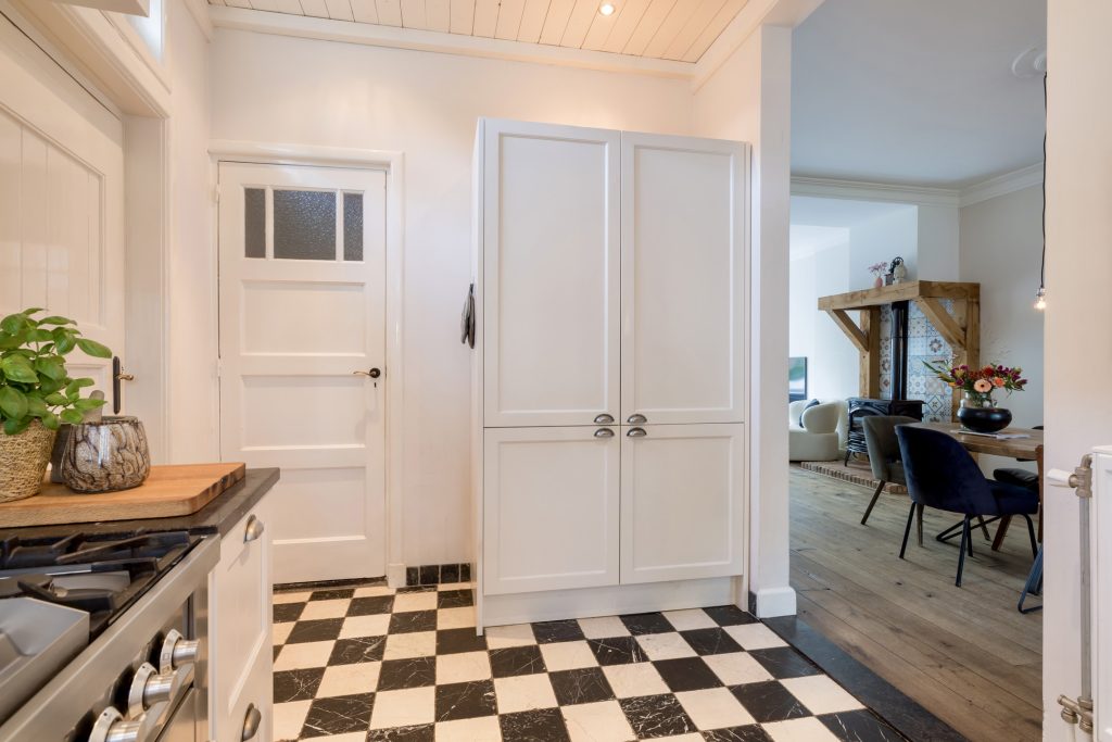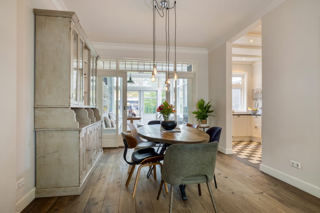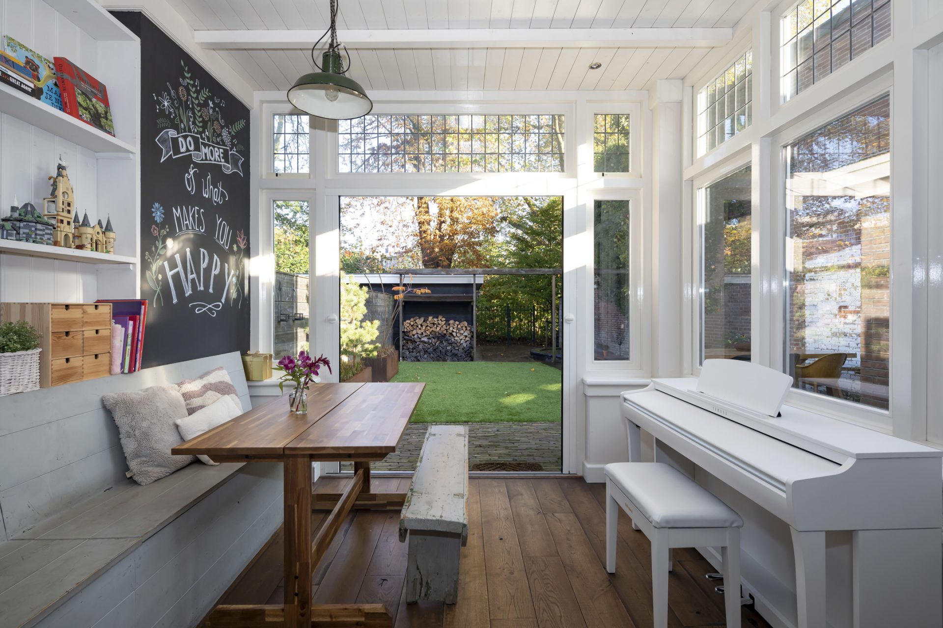 Via de klassieke entree betreedt u de vestibule, die leidt naar de hal met de trapopgang en een modern toilet. De woonkamer met houtkachel straalt warmte en gezelligheid uit en biedt toegang tot de lichte tuinkamer, die ideaal is voor ontspanning met uitzicht op de tuin. De halfopen keuken, in een praktische hoekopstelling, is voorzien van diverse hoogwaardige inbouwapparatuur. Achter de keuken ligt de bijkeuken met aansluitingen voor wasapparatuur, en er is een trap naar de kelder, die dienstdoet als voorraad- of wijnkelder.
