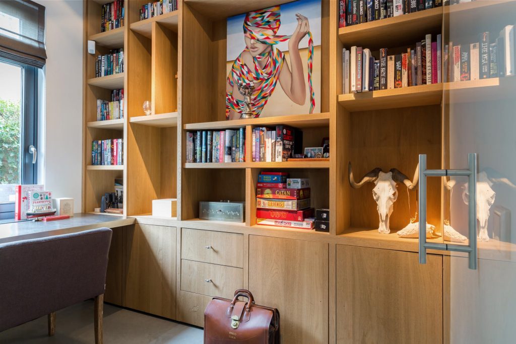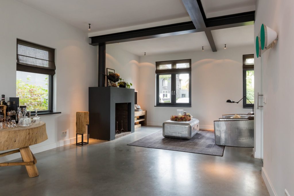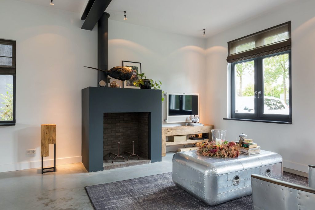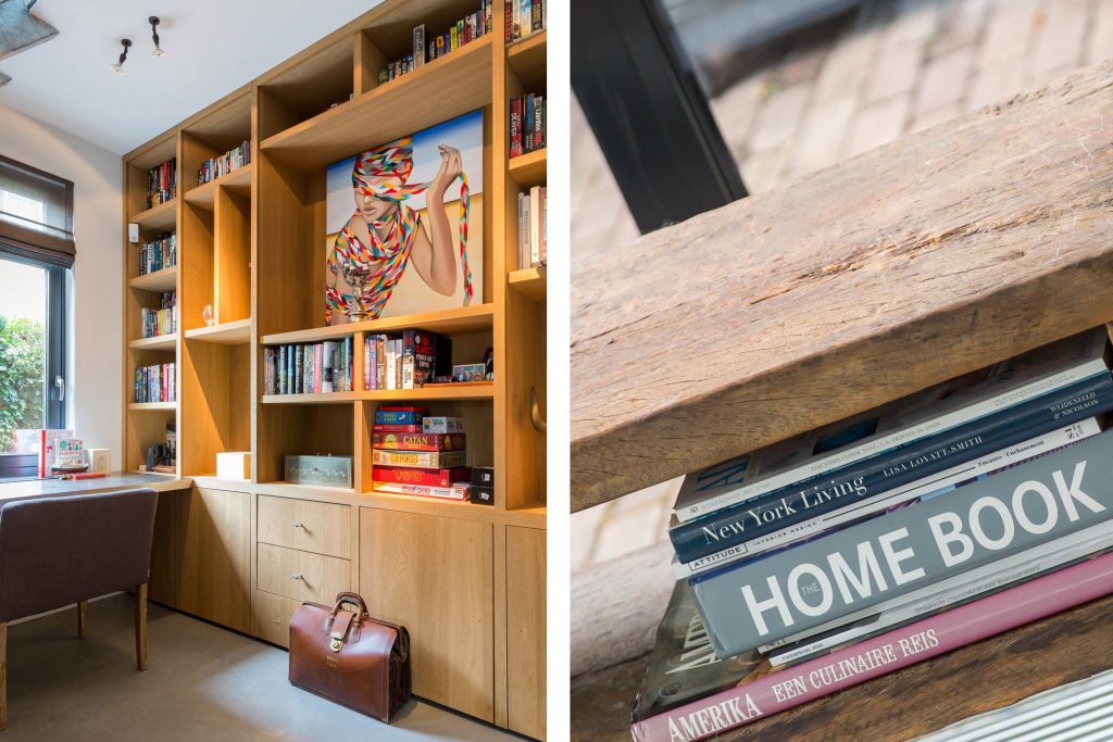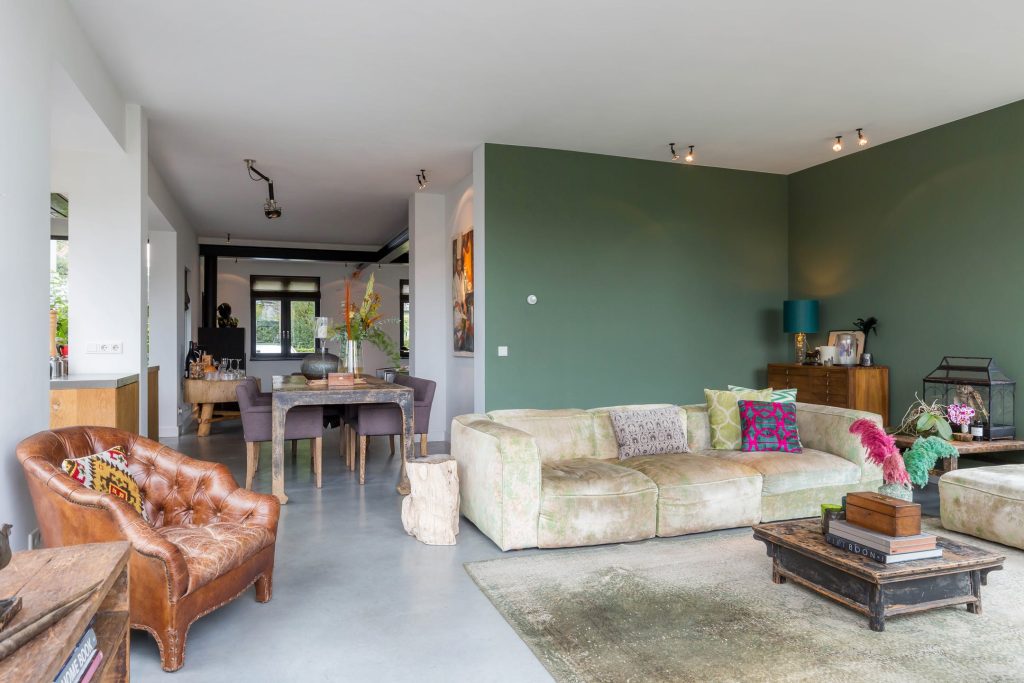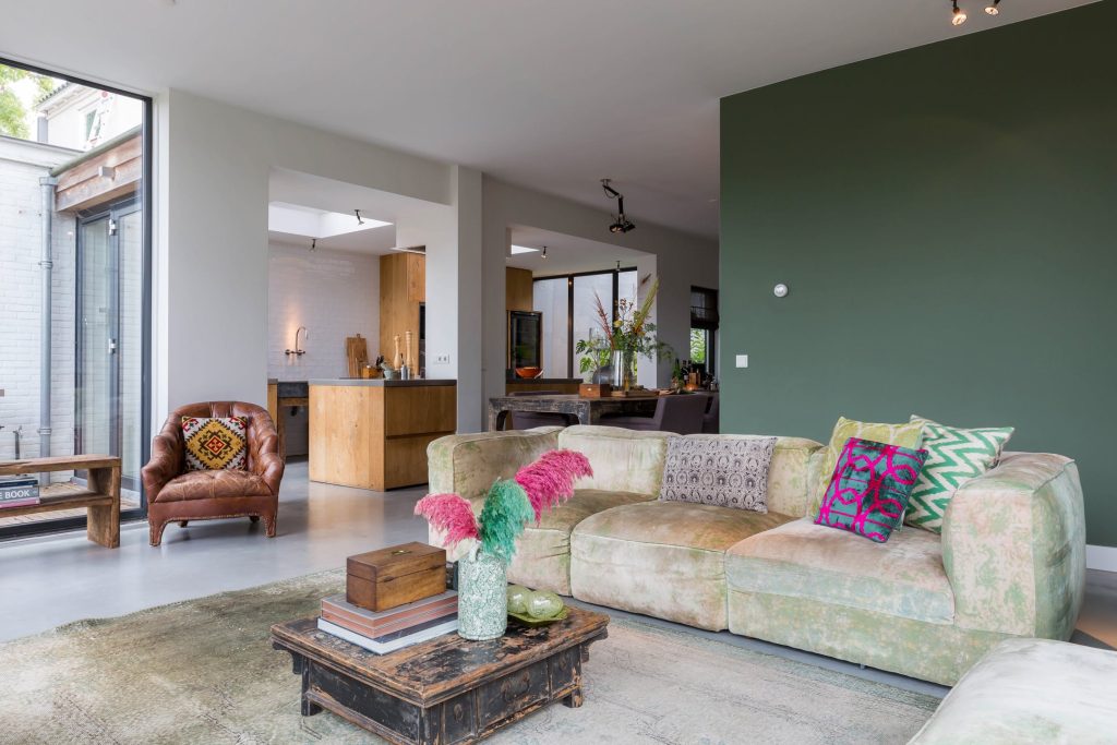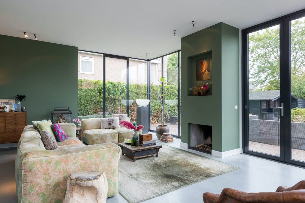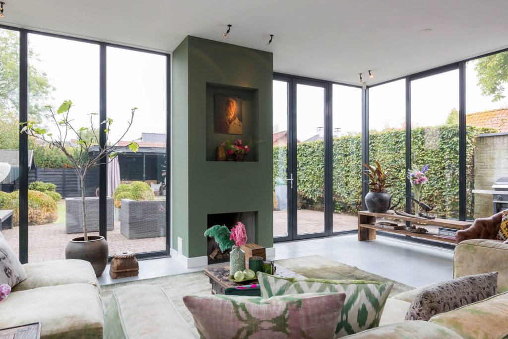 Dankzij de gedurfde, moderne uitbouw aan de achterzijde is de totale living bijna 15 meter diep. Aan de voorzijde ligt de oorspronkelijke woonkamer, die nu in gebruik als tv-kamer met een grote open haard (hout). Aan de tuinzijde ligt een prachtige tweede zitkamer met eveneens een open haard (gas). De grote hoge ramen en openslaande deuren naar de tuin zorgen voor veel daglicht en een uitstekende verbinding met de tuin. Tussen de tv-kamer aan de voorzijde en de zitkamer aan de achterzijde bevindt zich een werkkamer en de keuken met het eetkamer gedeelte. Een heerlijke plek om met zijn allen te dineren aan een grote eettafel. Ook hier drukken fijn stucwerk met hoge plinten en elementen zoals onbehandeld hout, stalen balken en glazen deuren hun stempel op deze fantastische leefruimte.