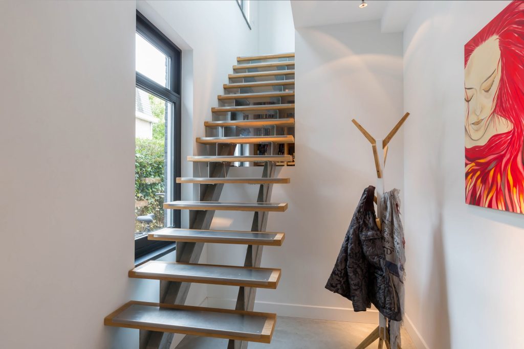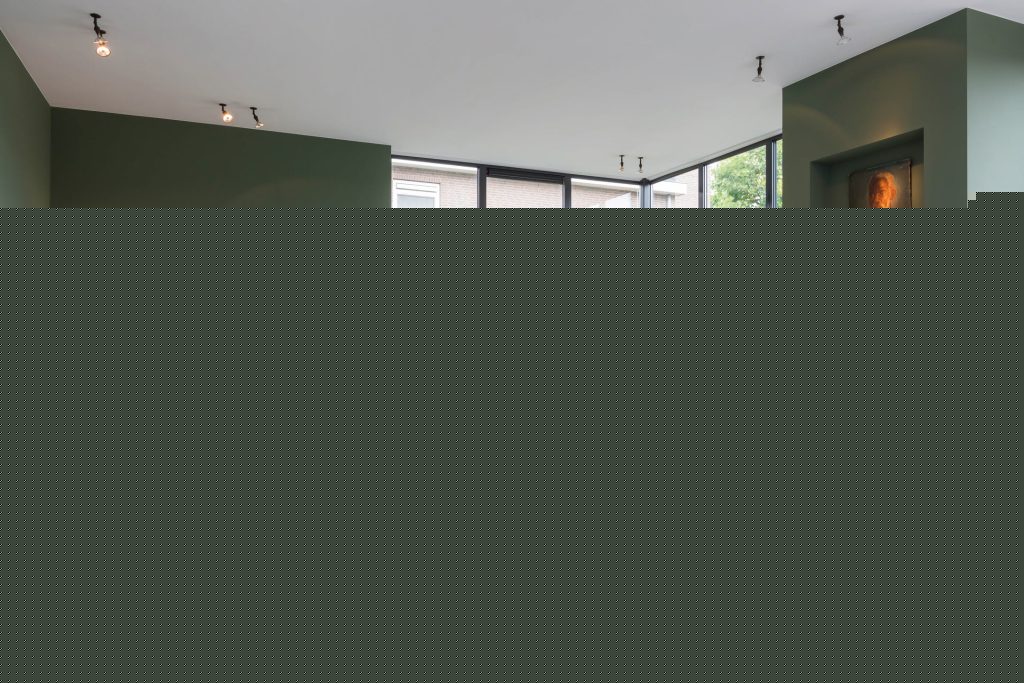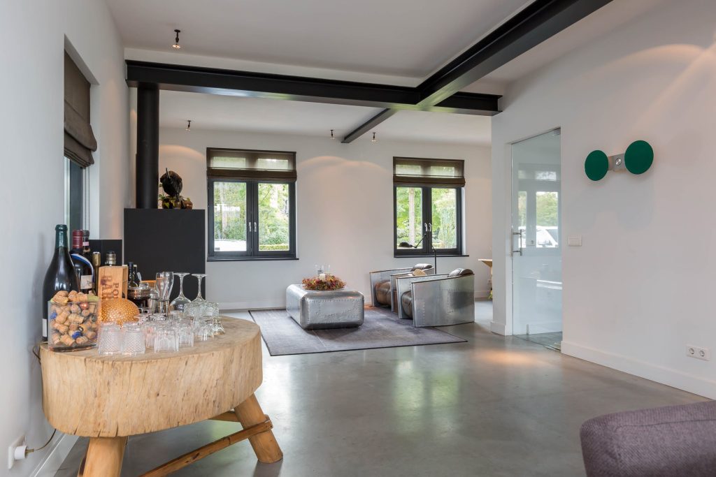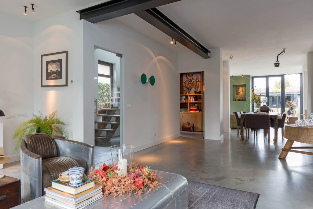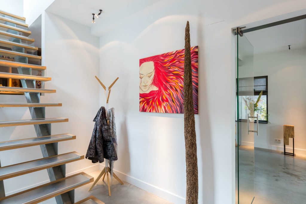 Entree, aan de linkerzijde van de woning. Gelijk na binnenkomst ervaart u in de hal het geslaagde resultaat van een ingrijpende verbouwing, waarbij gebruik is gemaakt van moderne materialen en kleuren. Zo is de vloer afgewerkt met BetonCiré (met vloerverwarming) en zijn de wanden en plafonds strak gestuct. Samen met massief onbehandeld hout en fraai hang en sluitwerk wordt de toon gelijk gezet.