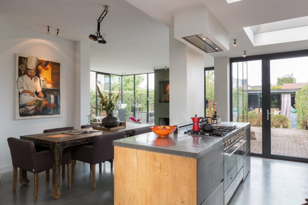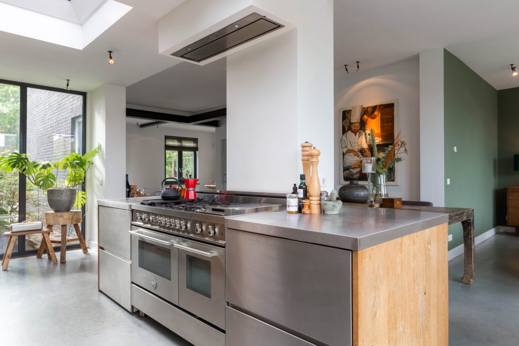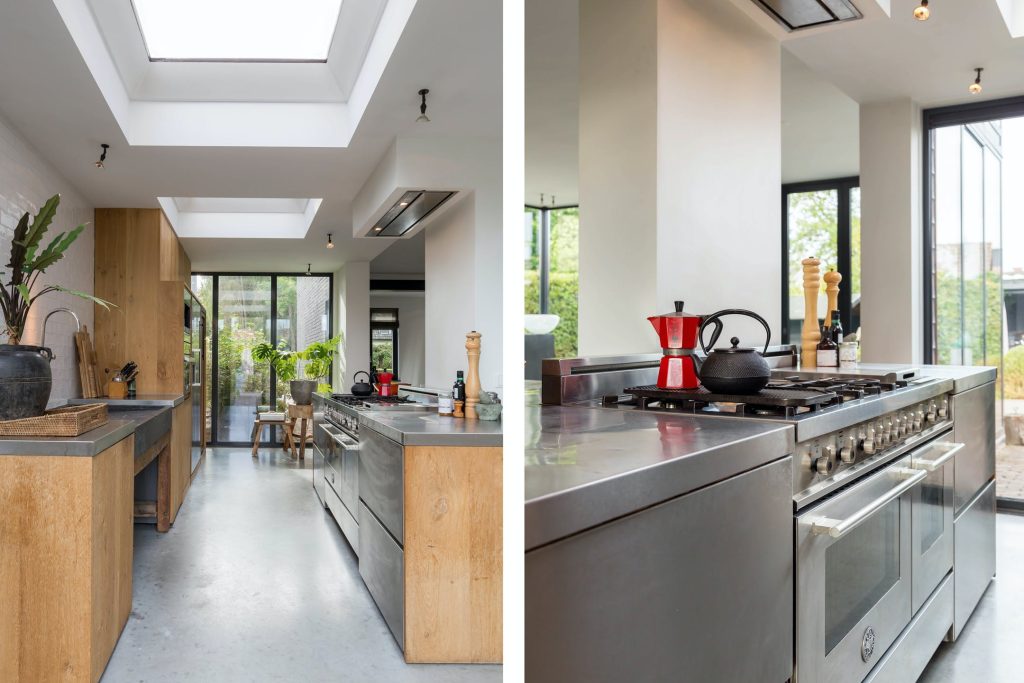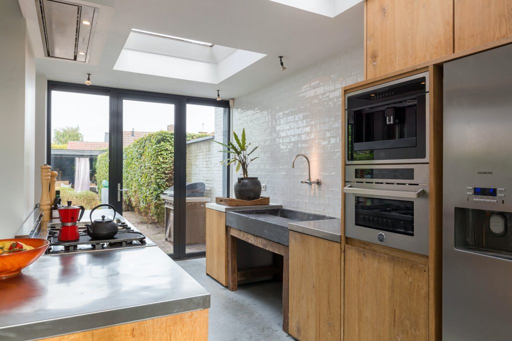 De stijlvolle halfopen keuken met de op maat gemaakte massief houten keukenopstelling heeft een krachtige en stoere uitstraling. De keuken is voorzien van inbouwapparatuur van topkwaliteit. Zowel blikvanger als sfeerelement zijn het grote gasfornuis met dubbele oven en de hoge wijnkast. Diverse lichtkoepels, hoge ramen en openslaande deuren zorgen voor een mooi uitzicht over de voor- en achtertuin.