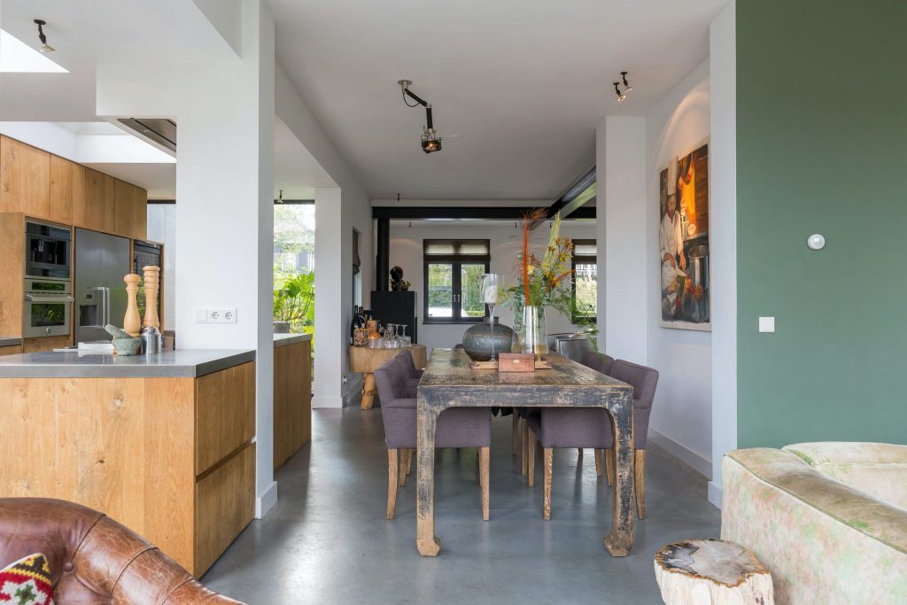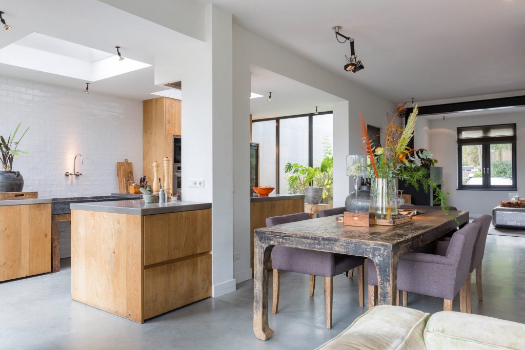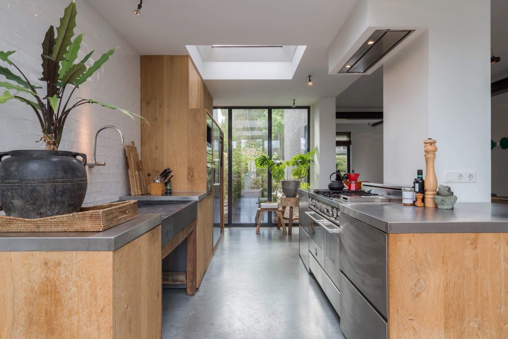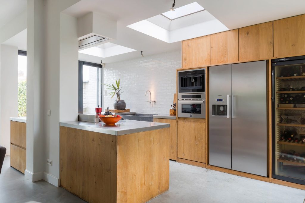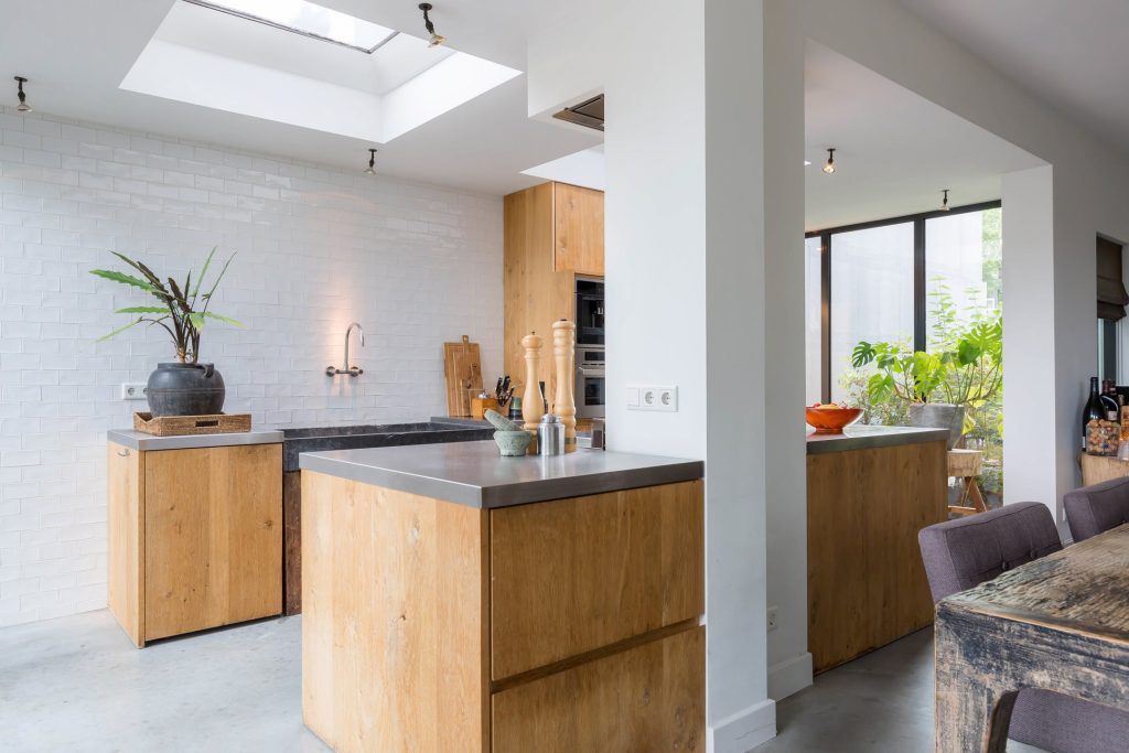 De stijlvolle halfopen keuken met de op maat gemaakte massief houten keukenopstelling heeft een krachtige en stoere uitstraling. De keuken is voorzien van inbouwapparatuur van topkwaliteit. Zowel blikvanger als sfeerelement zijn het grote gasfornuis met dubbele oven en de hoge wijnkast. Diverse lichtkoepels, hoge ramen en openslaande deuren zorgen voor een mooi uitzicht over de voor- en achtertuin.