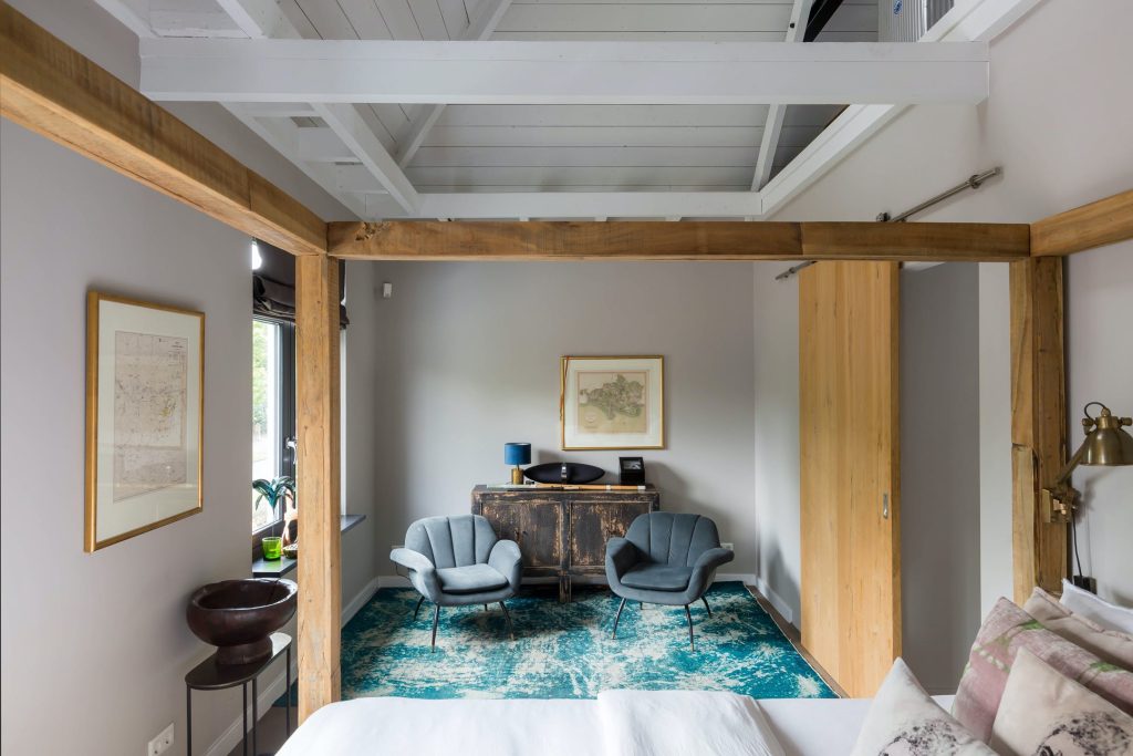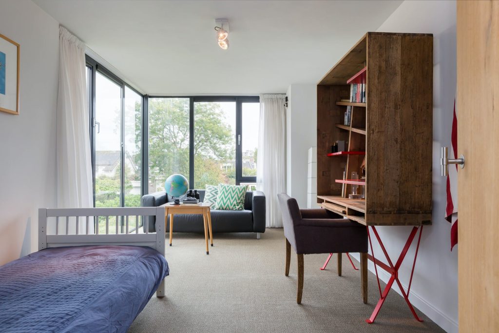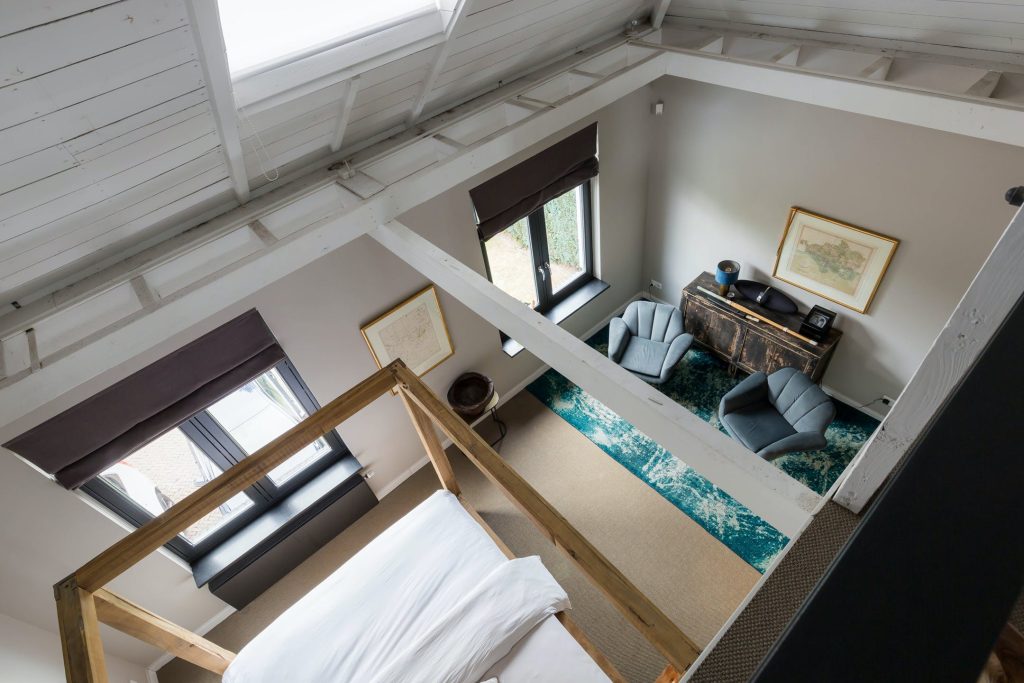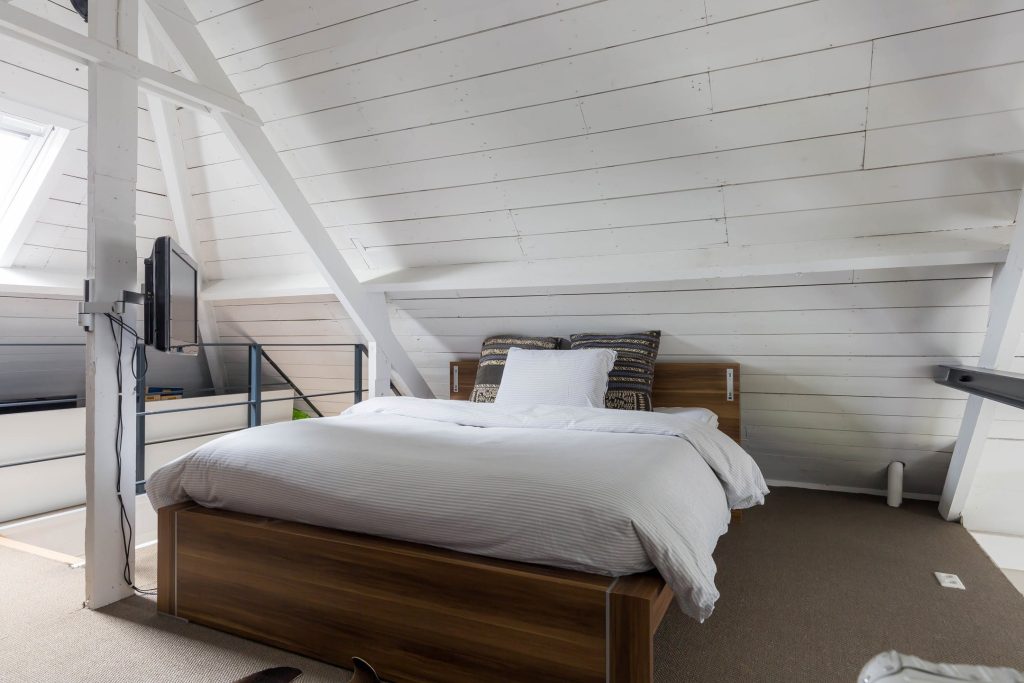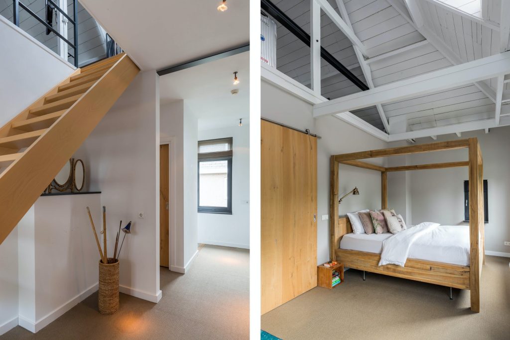 Aan de voorzijde ligt een grote master-bedroom. In deze kamer heeft u zicht tot in de nok van de opengewerkte kap en ook hier voelt u de aangename sfeer van de woning dankzij de combinatie van kleuren en materialen.