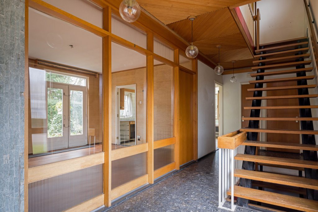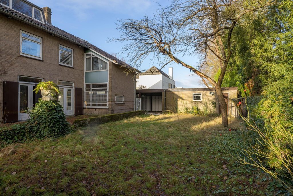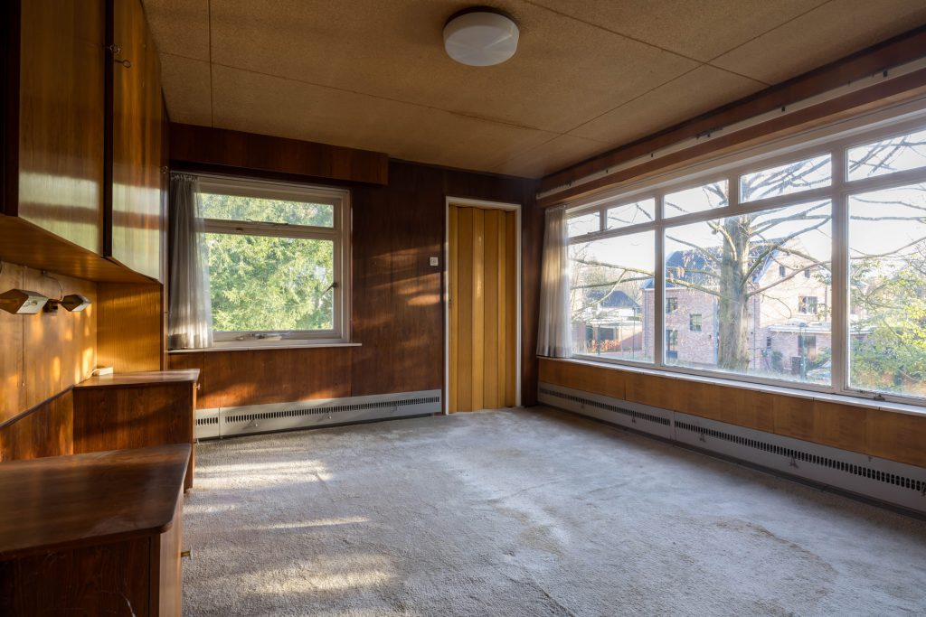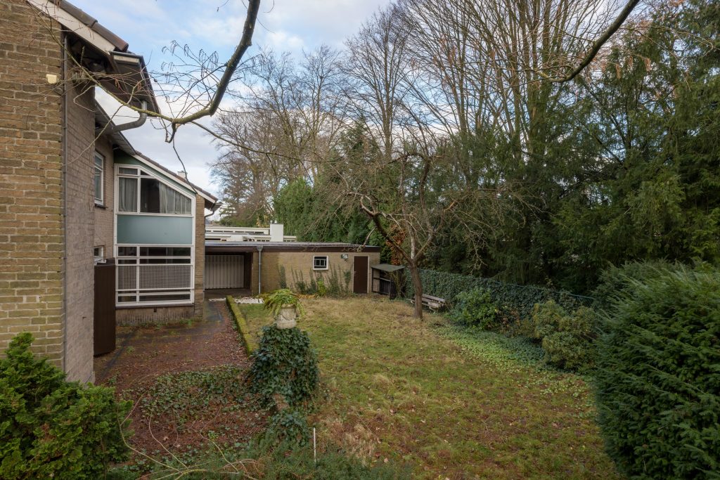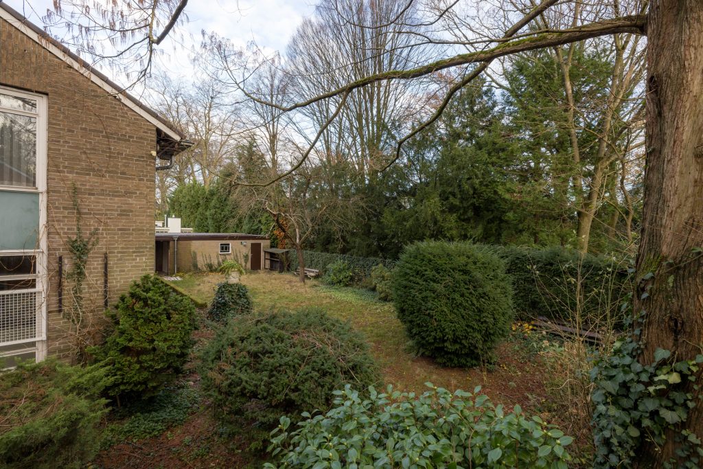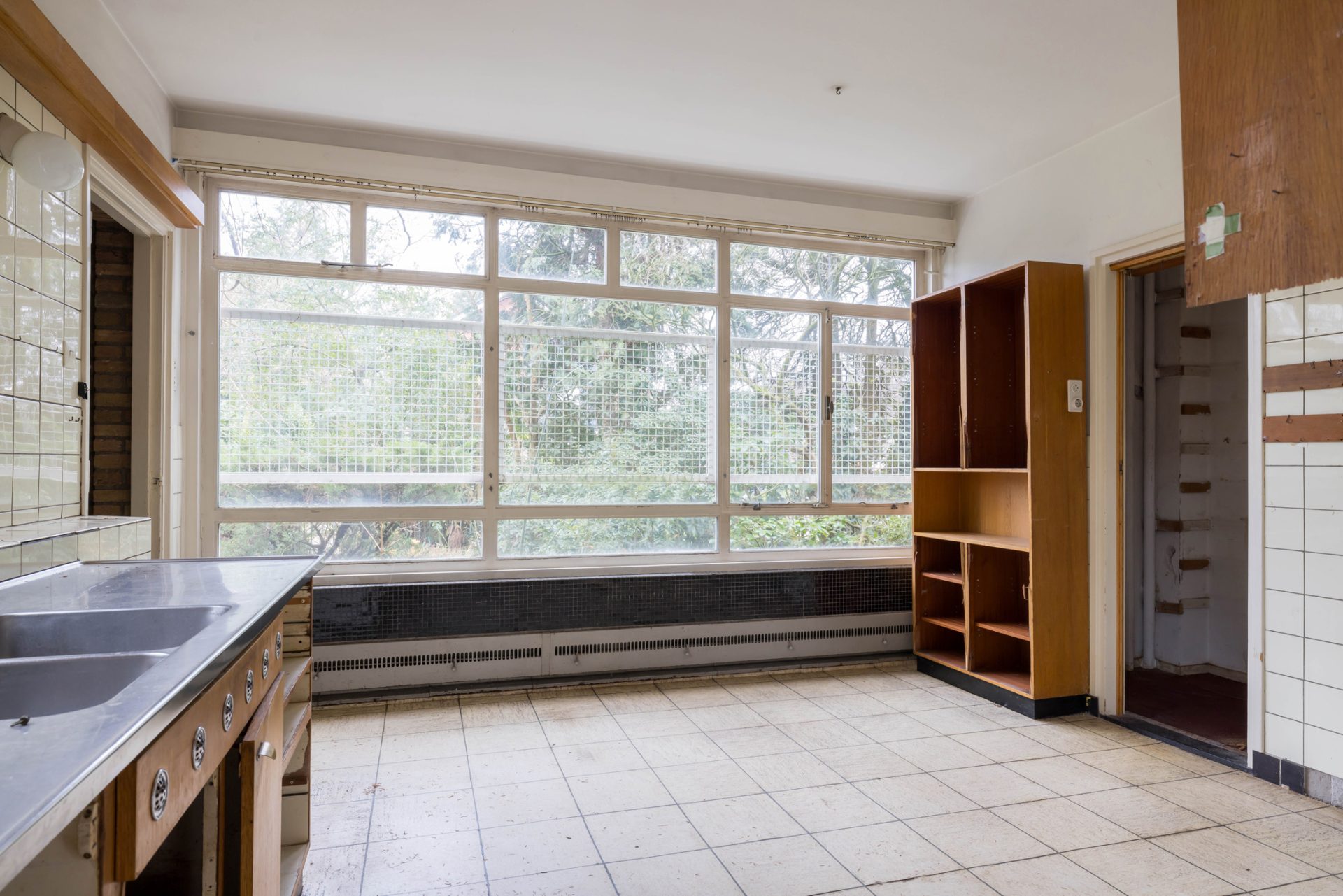 Via het eetgedeelte is de lichte keuken te bereiken, die grenst aan het portaal naar de tuin en een berging/provisieruimte. De jaren ’60 keukenopstelling heeft de kwalificatie ‘retro’, waardoor je de kans hebt om hier een droomkeuken naar eigen smaak te realiseren.