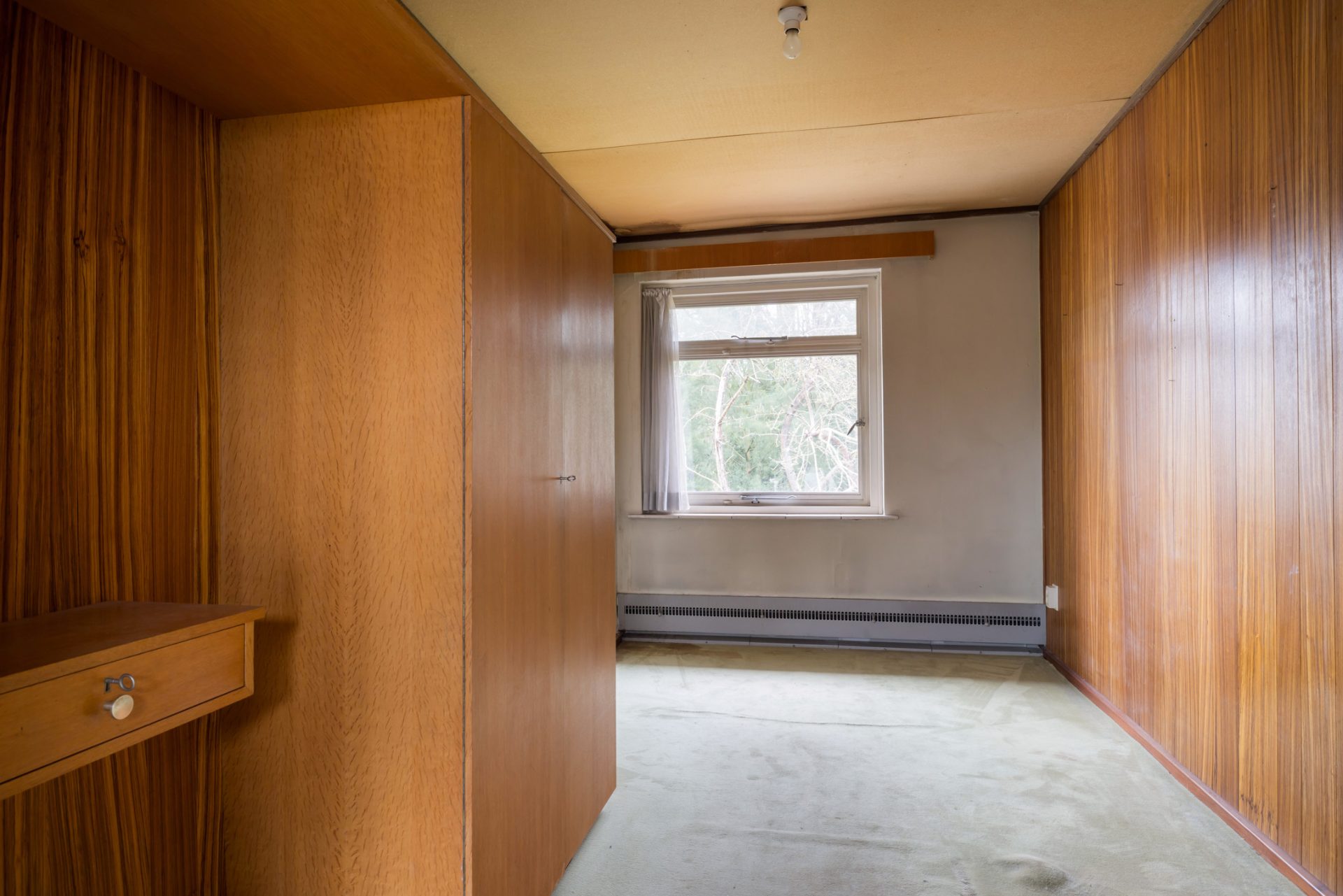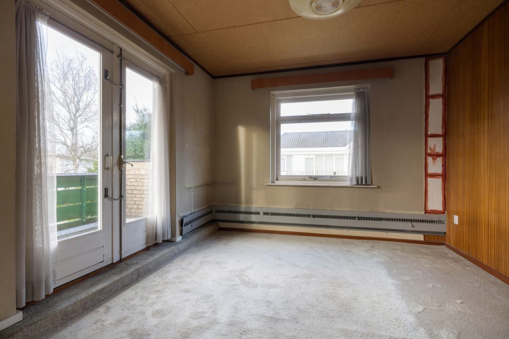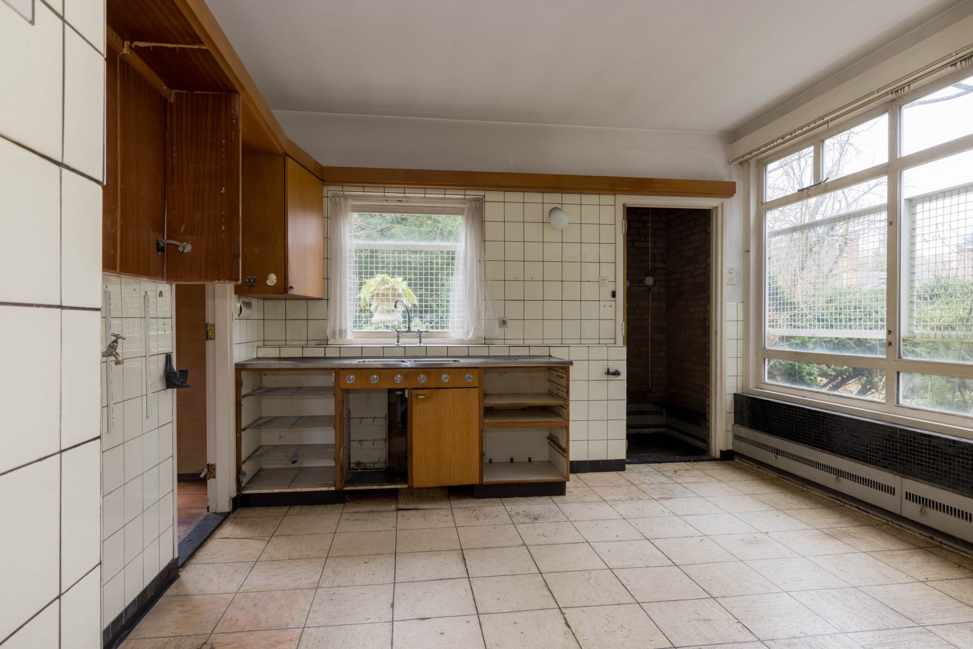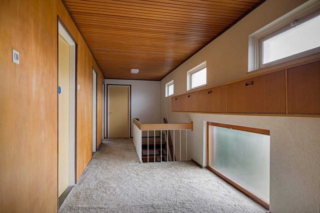 Via het eetgedeelte is de lichte keuken te bereiken, die grenst aan het portaal naar de tuin en een berging/provisieruimte. De jaren ’60 keukenopstelling heeft de kwalificatie ‘retro’, waardoor je de kans hebt om hier een droomkeuken naar eigen smaak te realiseren.