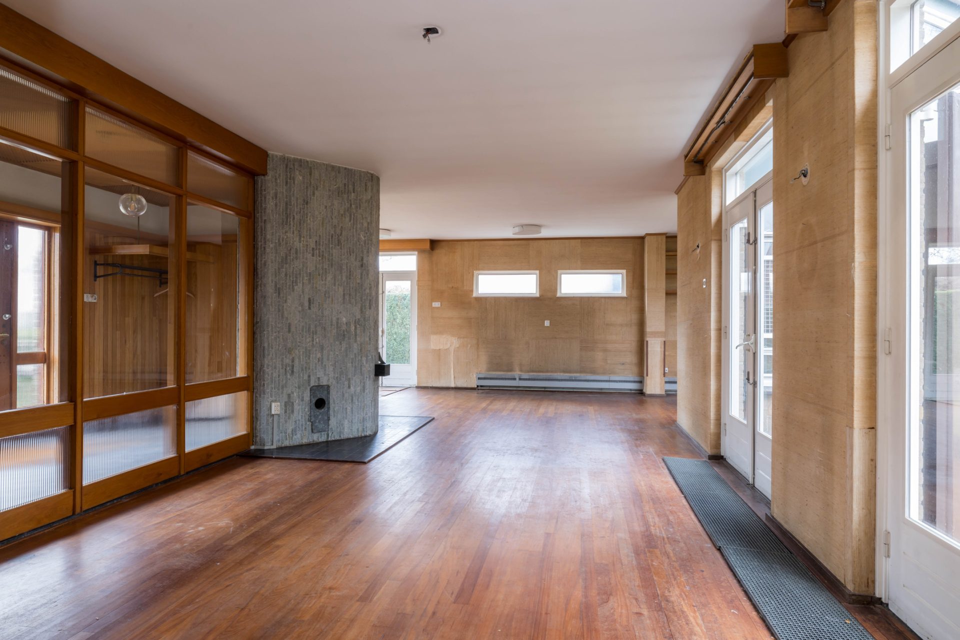 Aan de voorzijde, naast de erker, is de entree van dit ruime familiehuis. De hal heeft, heel bijzonder, een breedte van bijna 8 meter en oogt heel ruimtelijk dankzij de grote ramen aan de woonkamerzijde. Aan de rechterzijde zijn het trappenhuis, de meterkast en de toiletruimte met fonteintje.