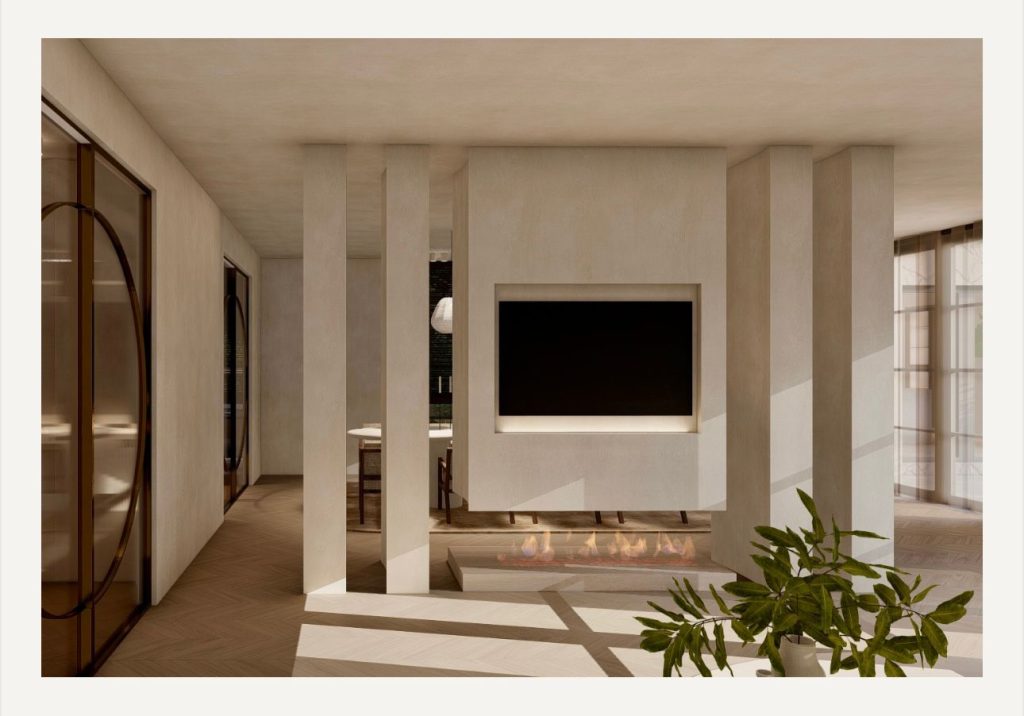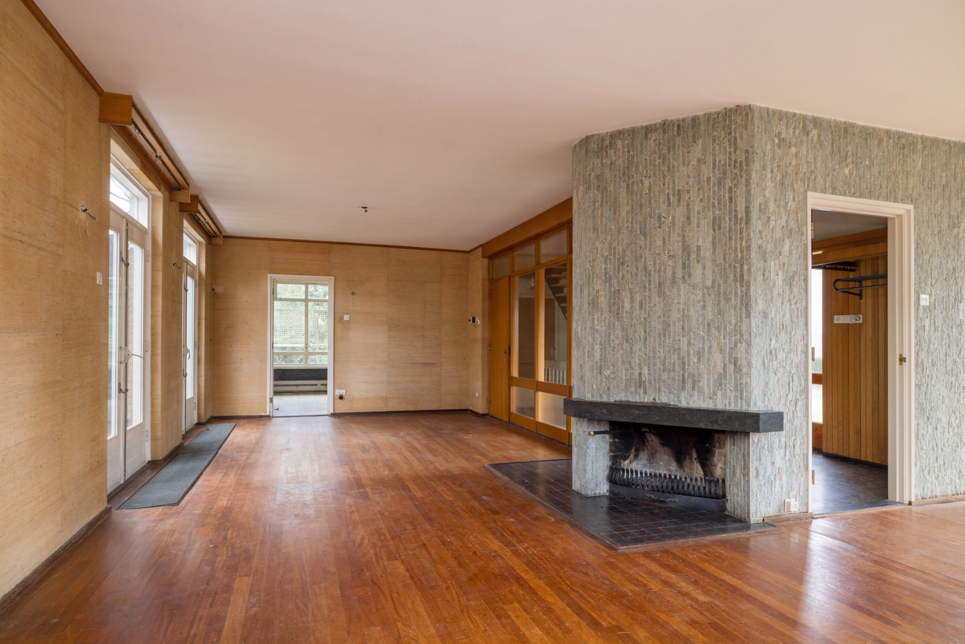 De verrassend ruime, goed ingedeelde T-vormige woonkamer biedt aan vier zijden fraai uitzicht naar de tuin. Meerdere openslaande deuren geven toegang tot de terrassen, waaronder het grote terras aan de achterzijde. Met een zithoek bij de haard, een apart tv-gedeelte en een grote eettafel voor een heerlijk diner is dit een perfecte woonkamer voor het ontvangen van gasten.