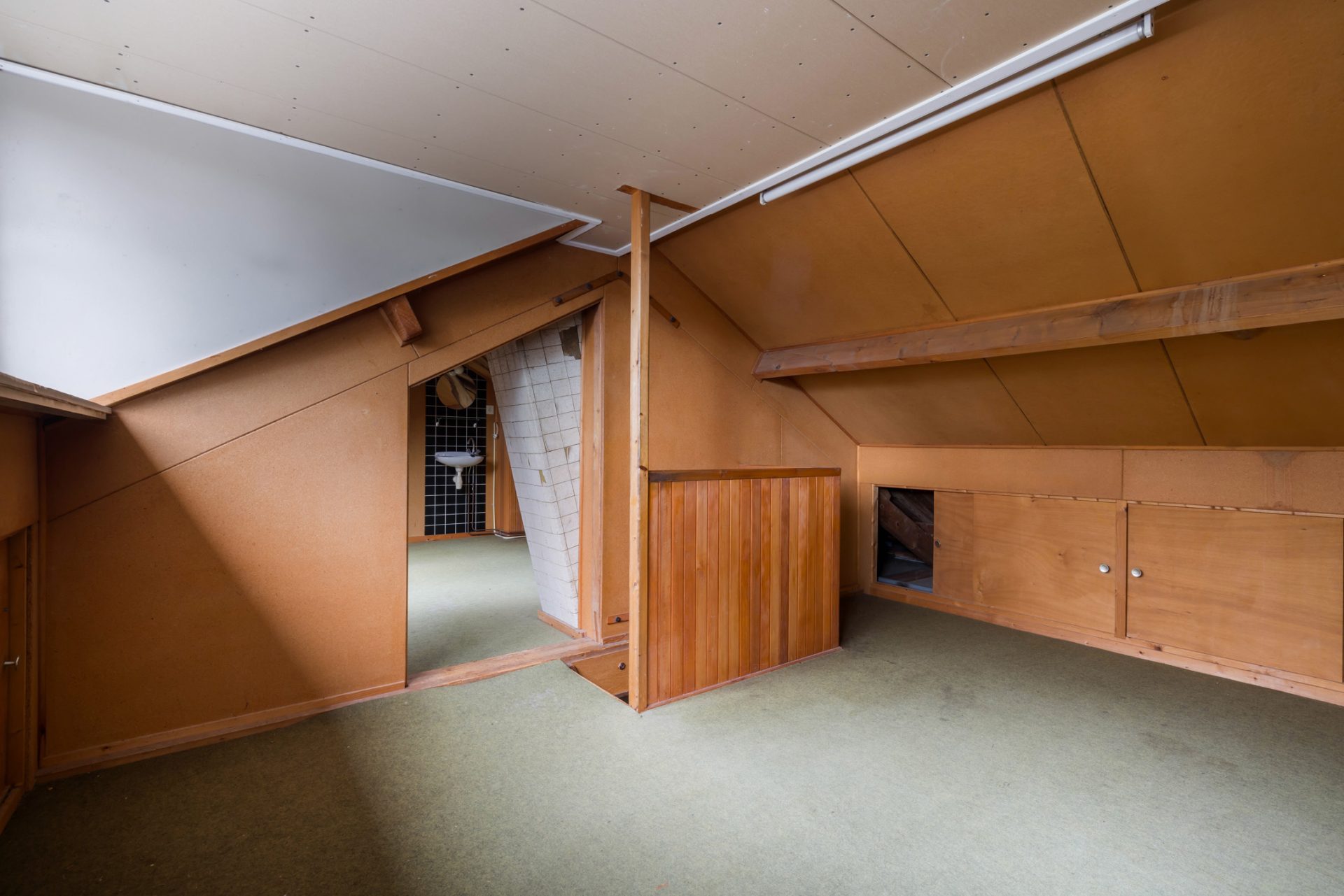 Er is een vaste trap naar de tweede verdieping, waar meerdere ruimtes vragen om een nieuwe invulling. Voorzieningen als water, elektra en afvoer zijn aanwezig, net als een grote dakkapel.