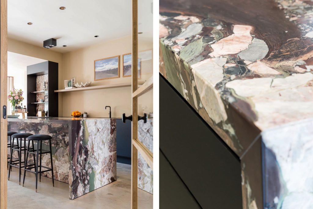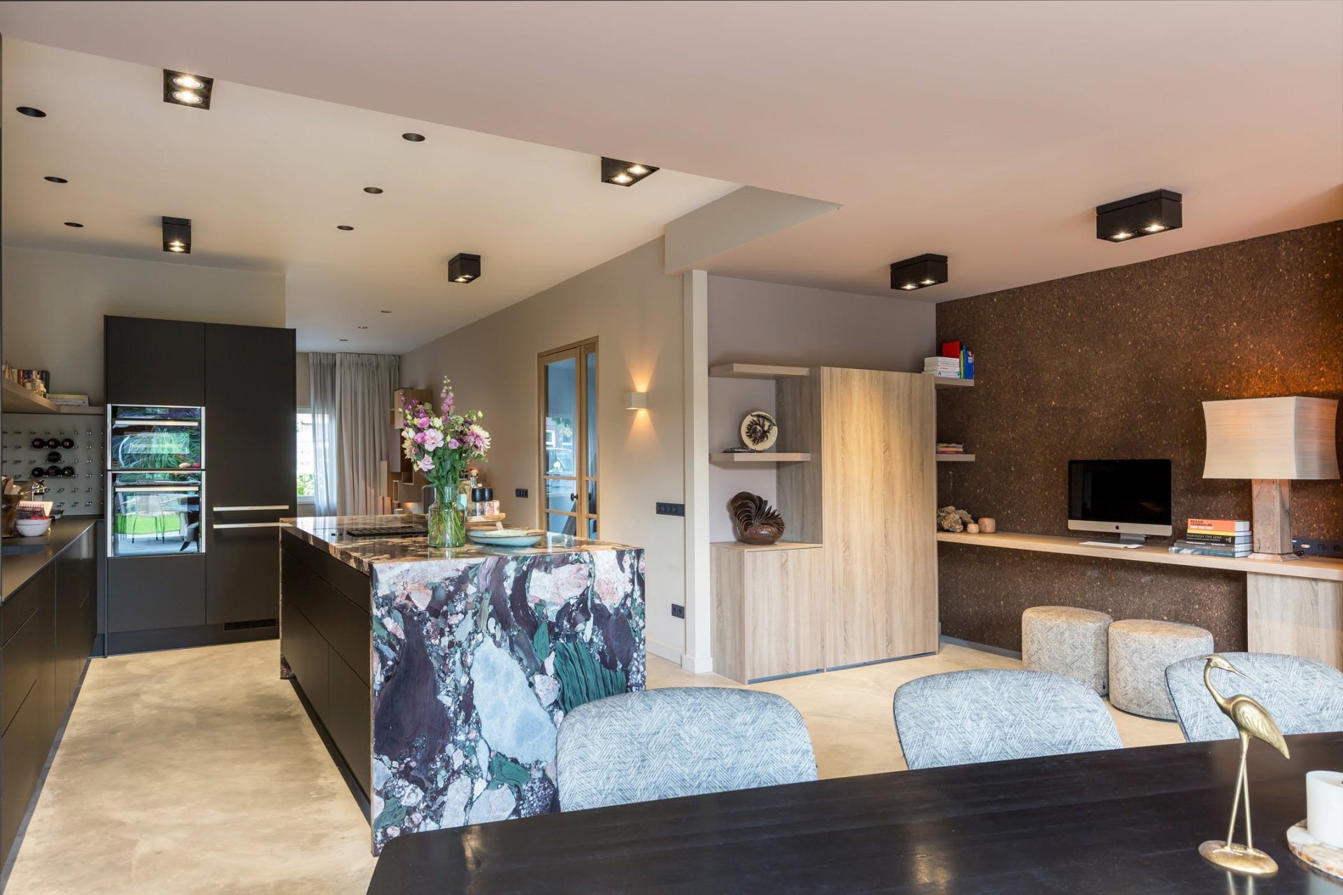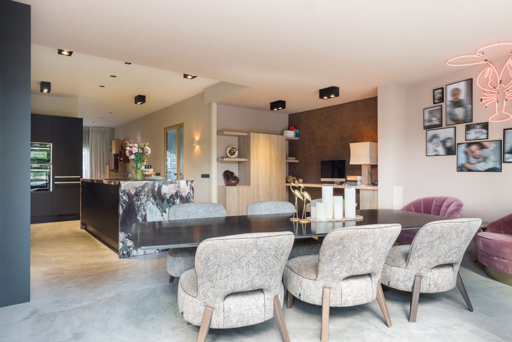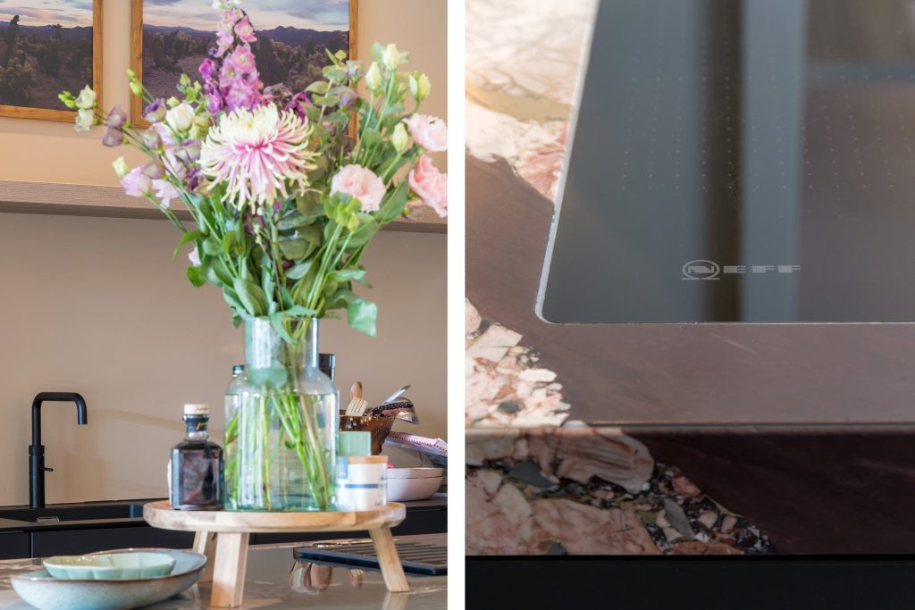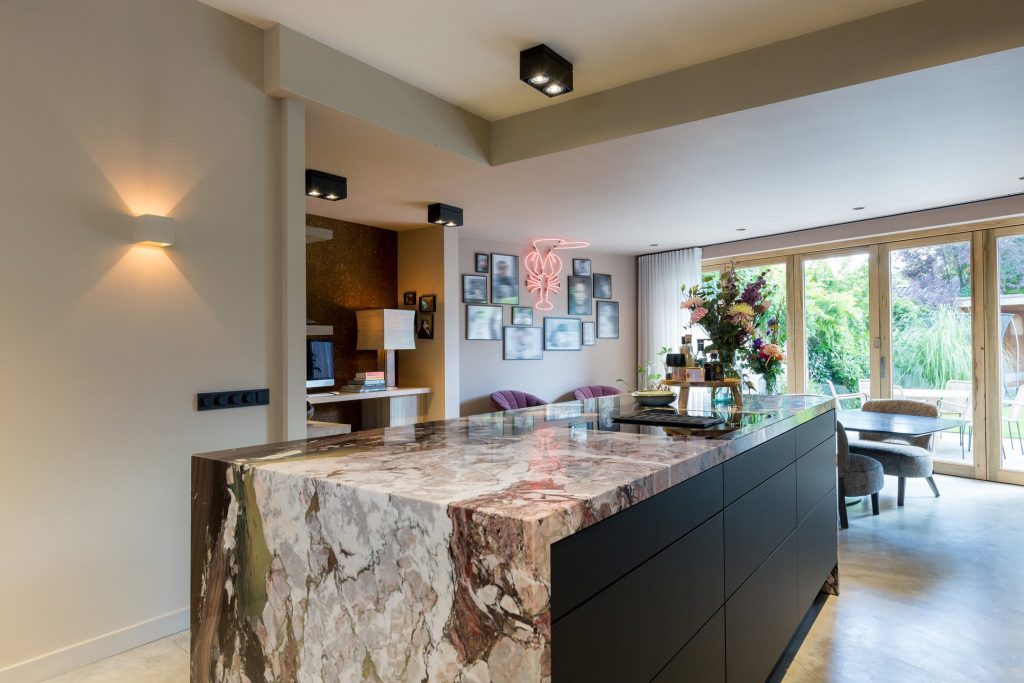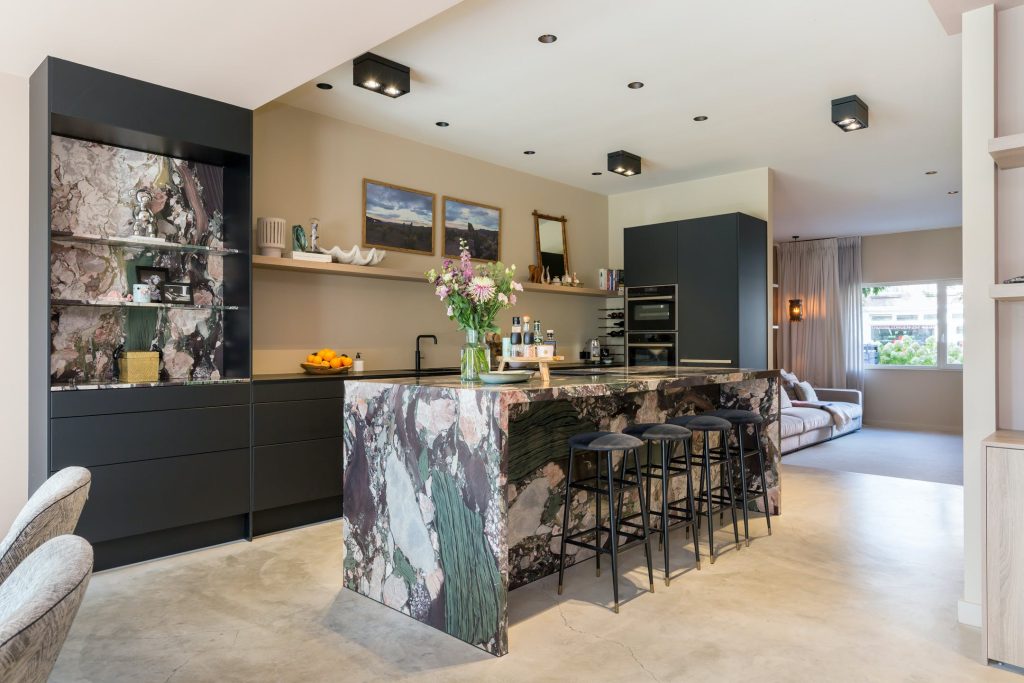 In de keuken zie je een prachtig marmeren kookeiland met de looks van een kunstwerk. De zwarte, brede lades en de zwarte kastenwand bieden veel bergruimte en alle denkbare apparatuur is ingebouwd: een inductiekookplaat met afzuiging, een tweetal vaatwassers, heteluchtoven, combi-stoomoven, koelkast en een vriezer. Dit is de ultieme keuken voor de kookliefhebber die zich graag laat omringen door stijl en klasse.