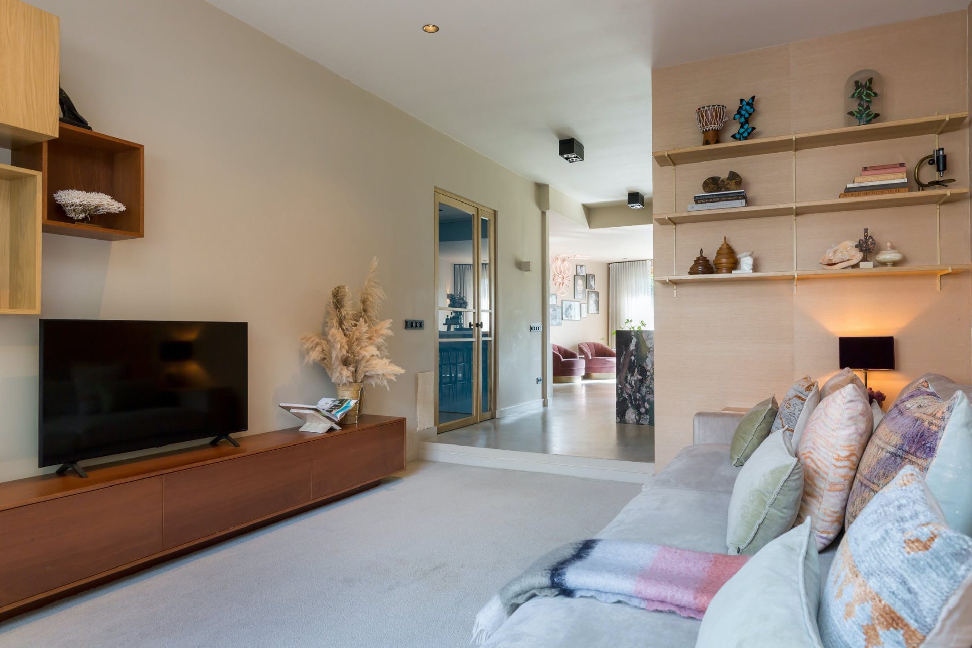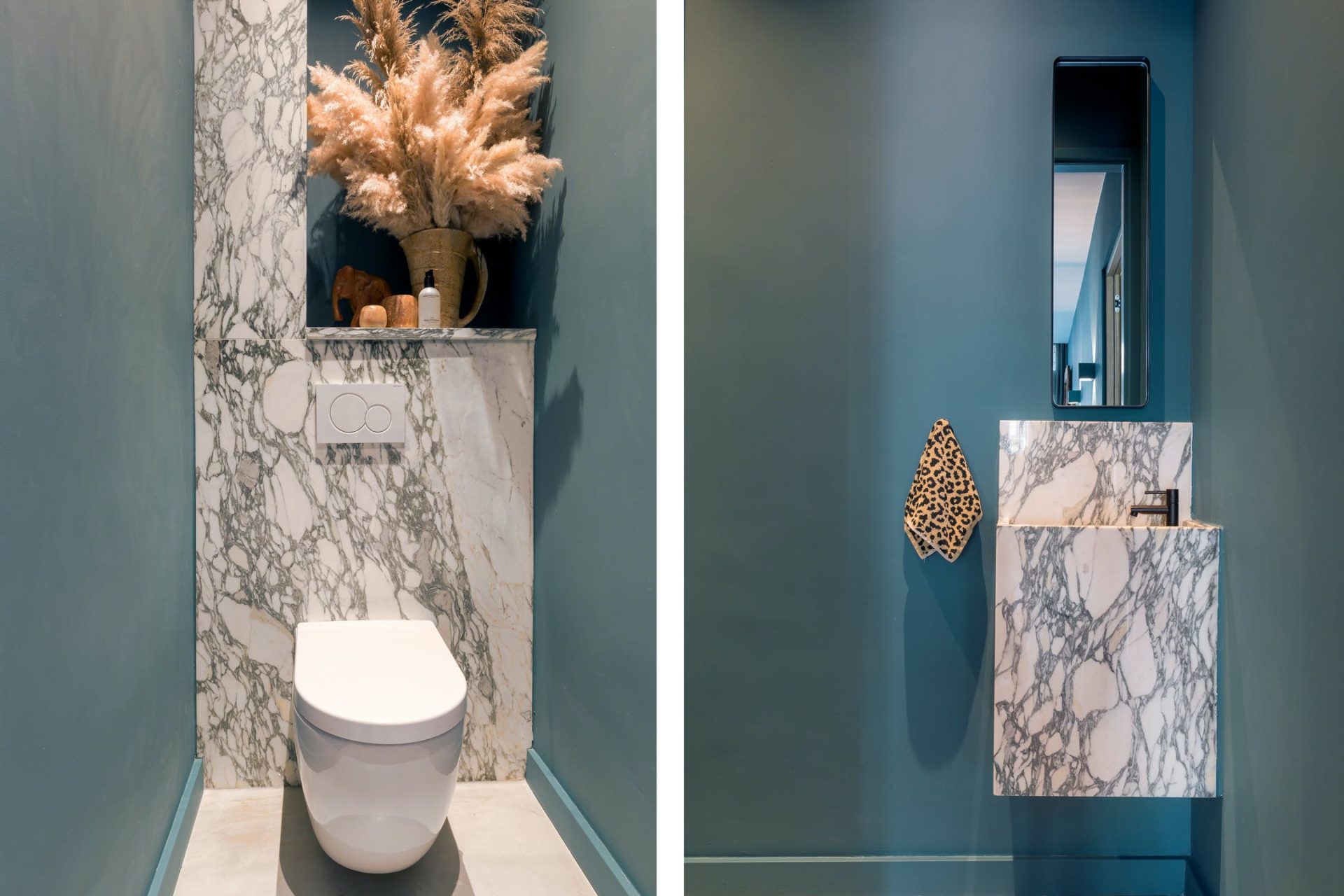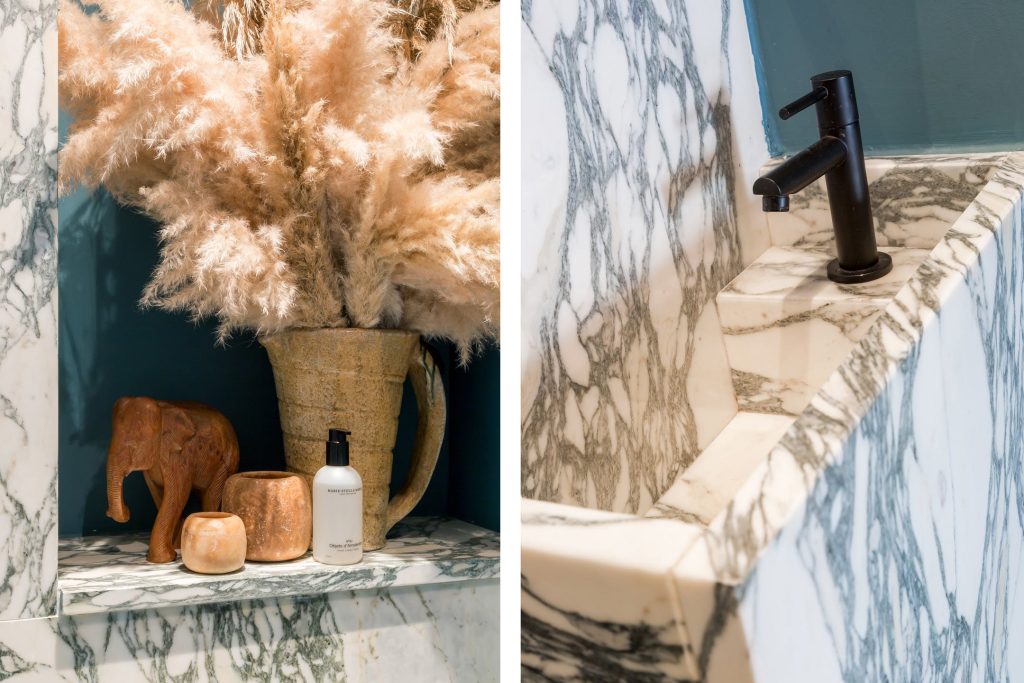 De entree straalt karakter uit dankzij de hardhouten voordeur en de glas-in-loodramen, onmiskenbare elementen uit de jaren ’20. In de hal zie je dat deze woning enkele jaren geleden met gebruik van hoogwaardige, moderne materialen is verbouwd. De gietvloer met vloerverwarming, de glad gestucte muren met wandverlichting, het stucplafond en de hoge deuren zijn de sfeermakers. Vanuit de hal heb je toegang tot twee bergkasten, de toiletruimte en de keuken. In de toiletruimte bewonder je het marmer, gecombineerd met een prachtige blauwe kleur op de muren.