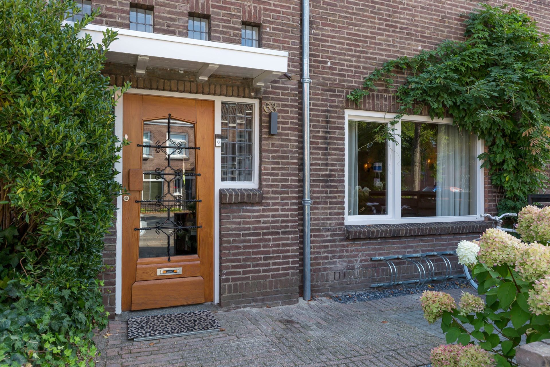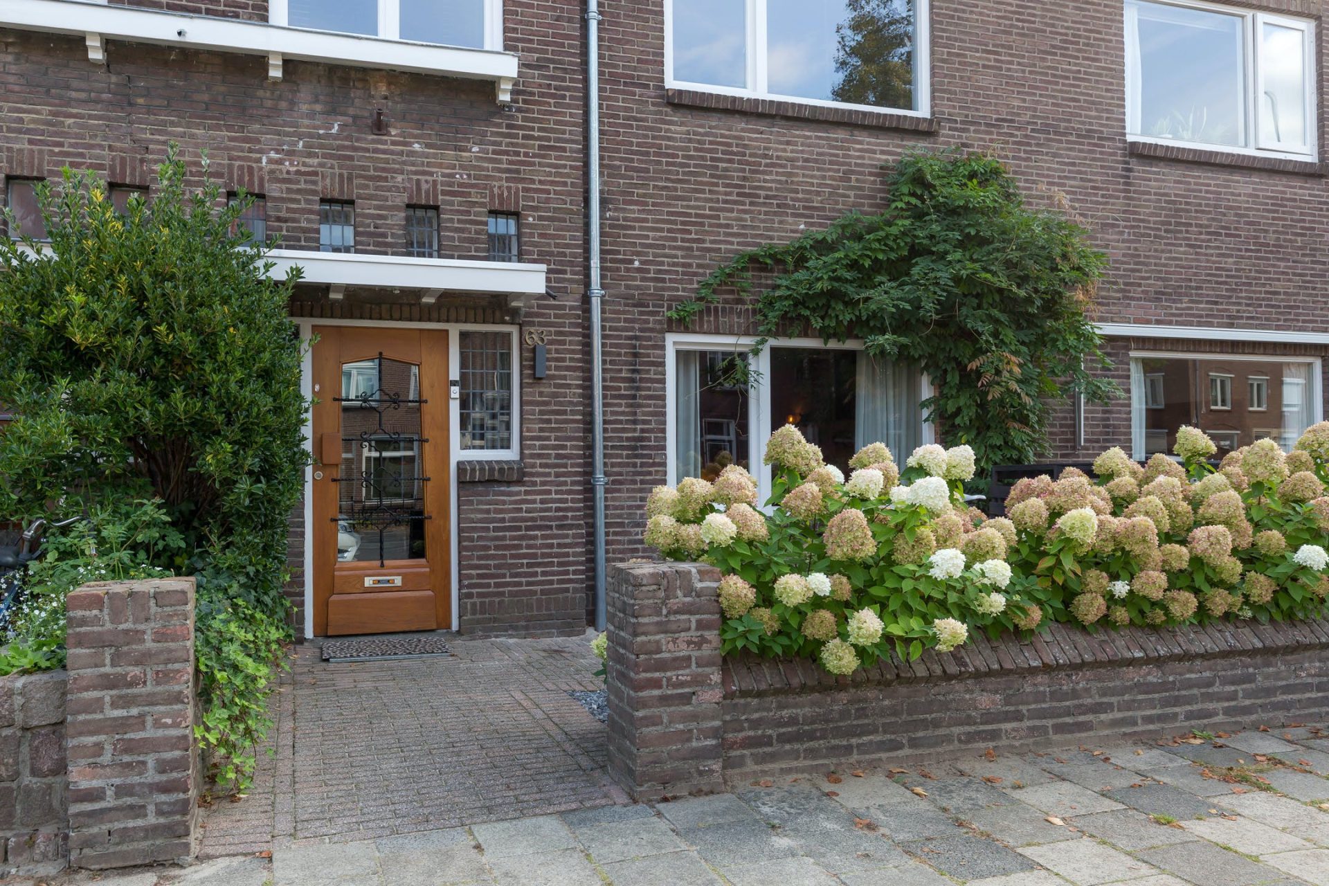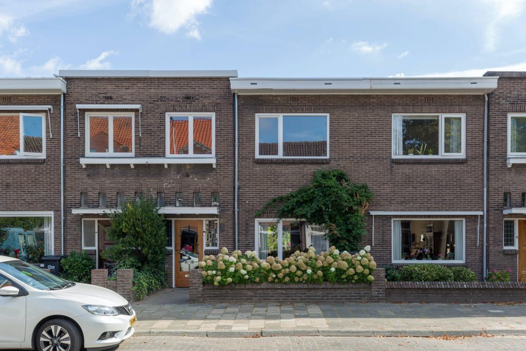 Deze parel in de Schrijversbuurt heeft een mooie voortuin met een rij witte hortensia’s, bestrating, grind en diverse planten waaronder een struik die zijn weg vindt rondom het woonkamerraam.