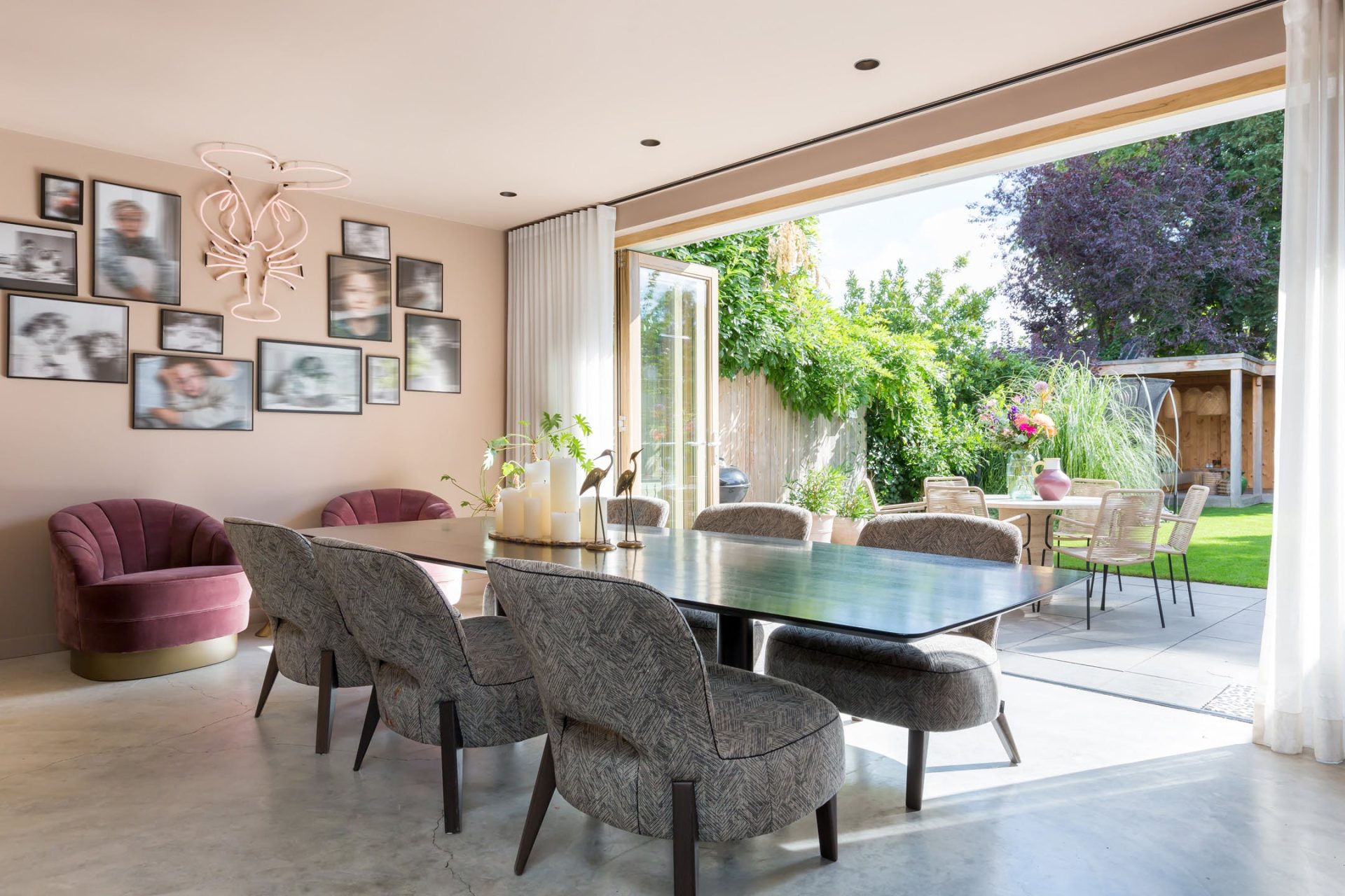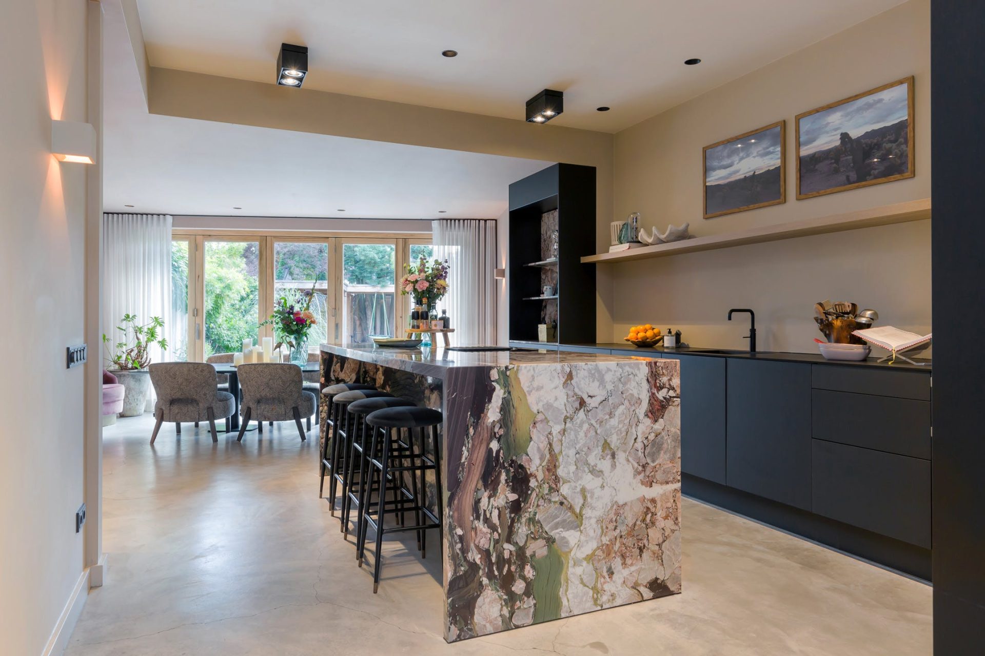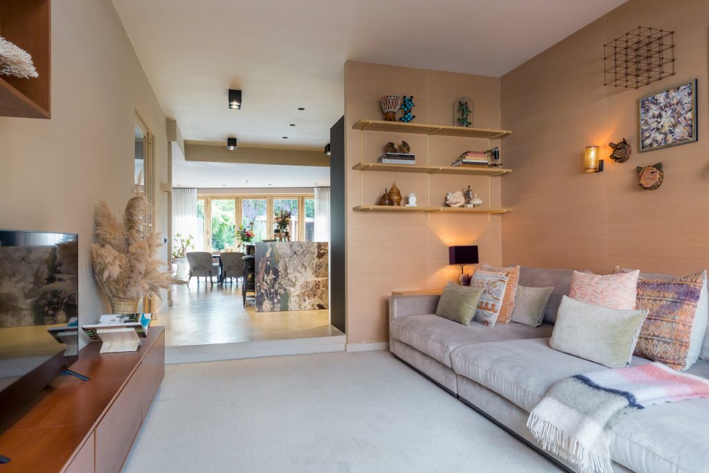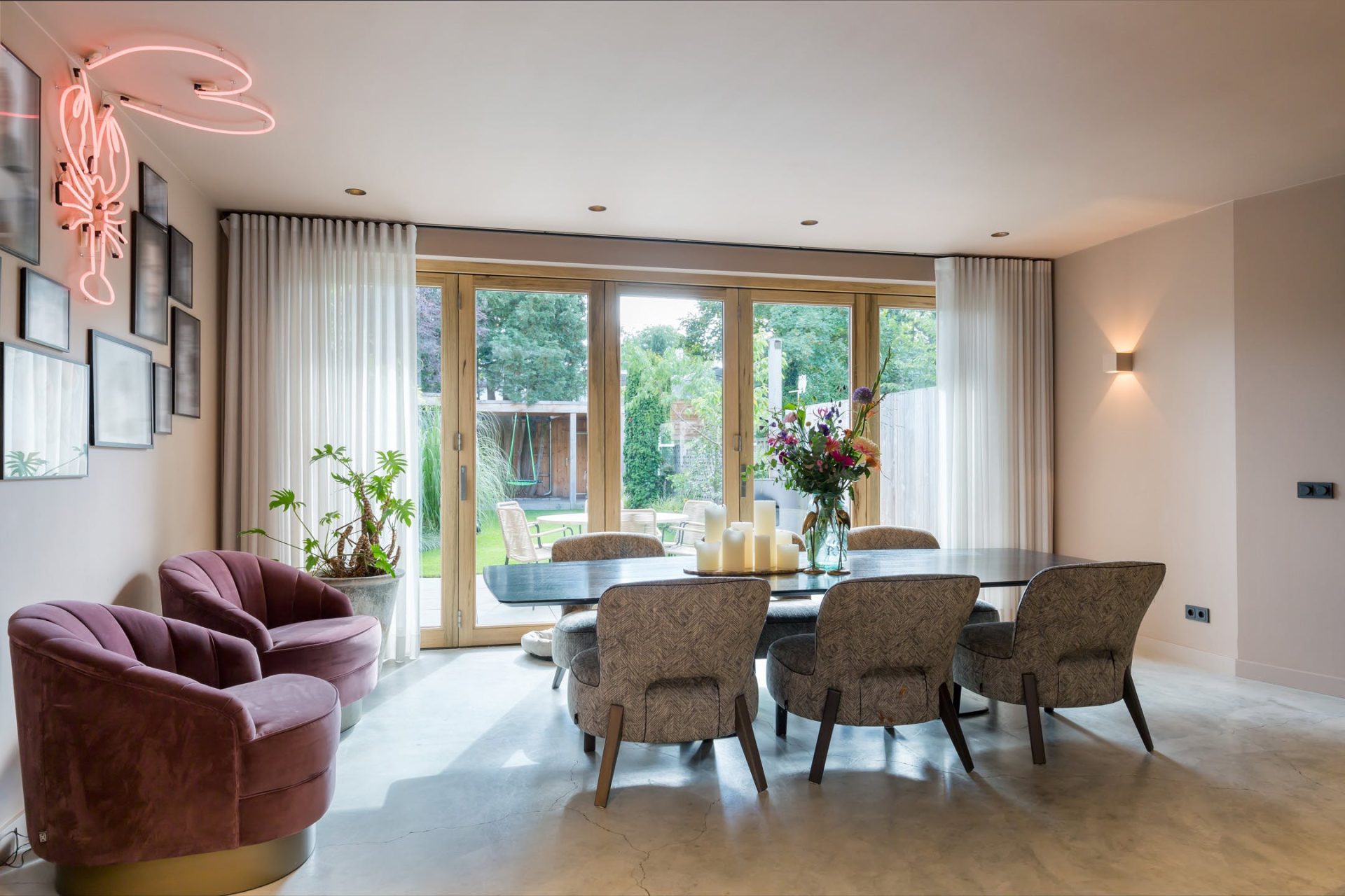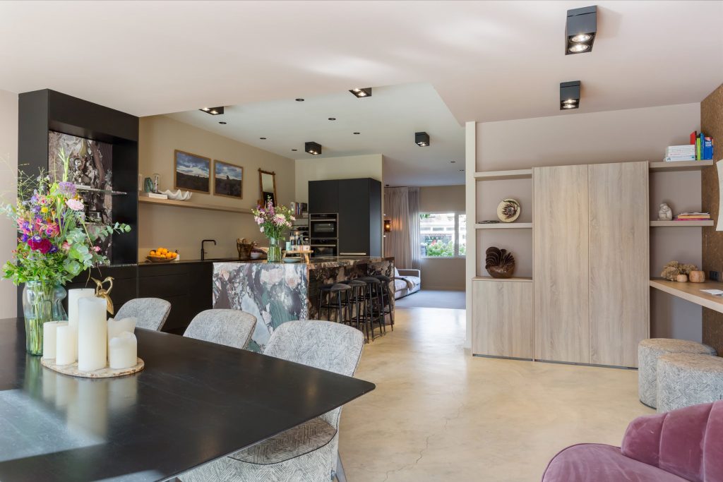 De woonkamer met keuken is meer dan 13 meter diep en straalt pure klasse uit. Werkelijk alles is verbouwd, gestyled en etaleert al haar charme. Aan de voorzijde is de zeer ruime, lichte zitkamer en aan de tuinzijde is de ruimte ingedeeld met een grote eettafel, werkplek en een tweede zithoek. De vijf meter brede harmonicapui zorgt voor veel lichtinval en een mooie verbinding met de tuin.
