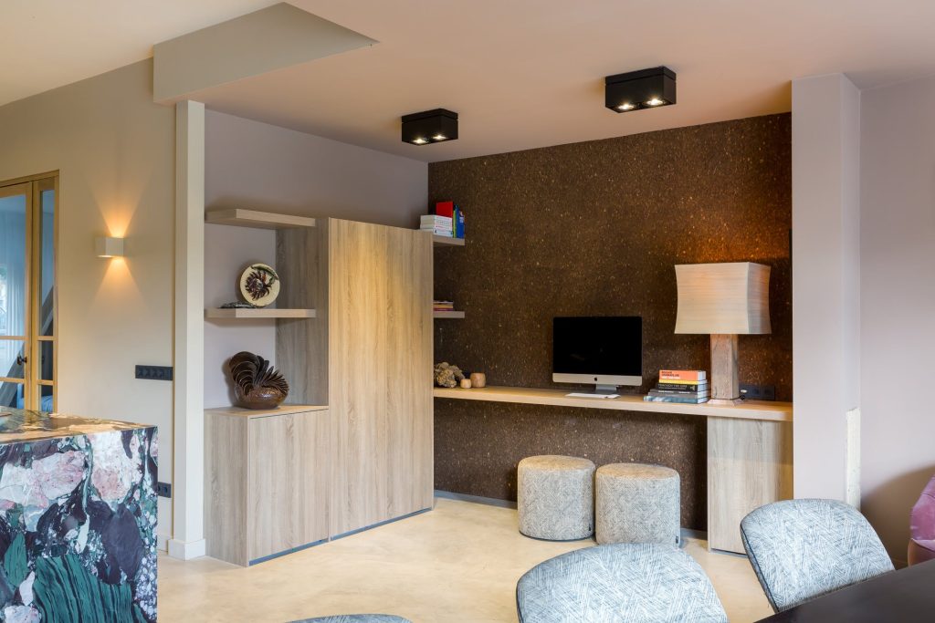 De overloop biedt een uitnodigend decor dankzij de visgraat parketvloer, de gestucte wanden en de grote lichtkoepel. De airco-unit die op de overloop hangt, koelt de gehele verdieping.
